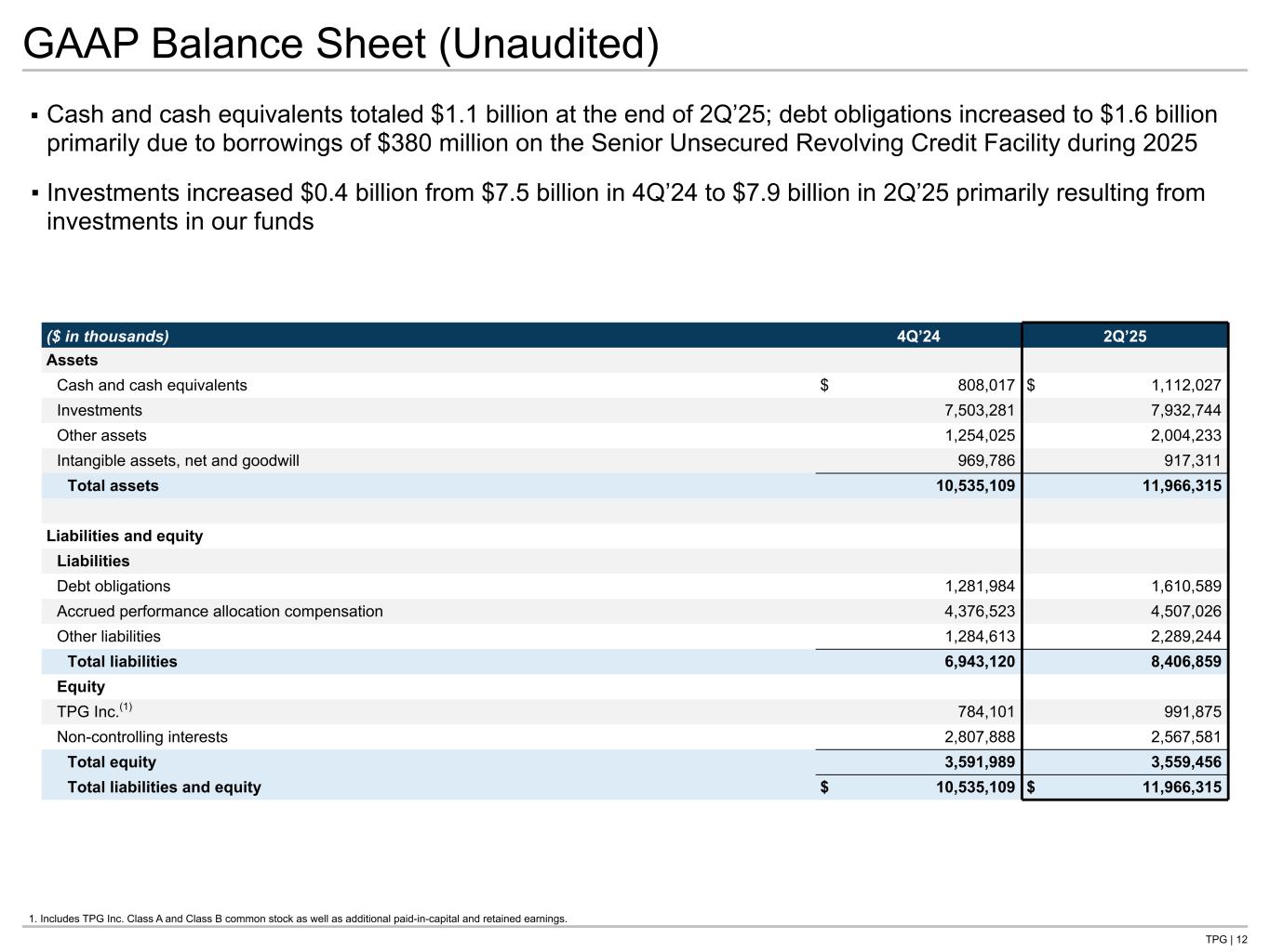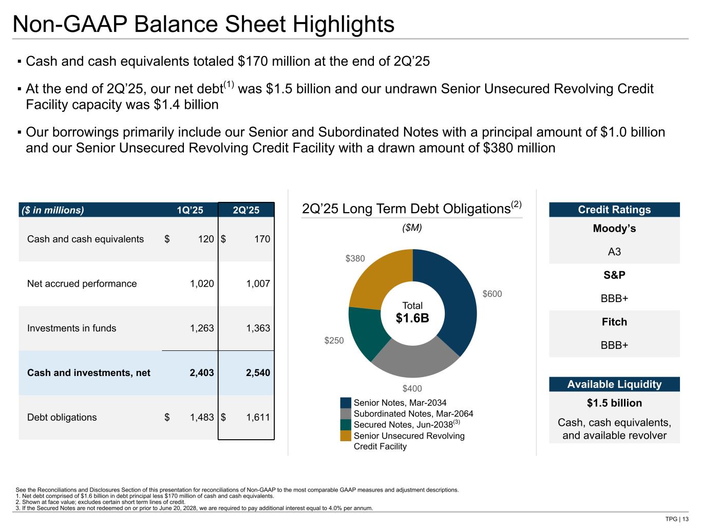 TPG | 12 GAAP Balance Sheet (Unaudited) ▪ Cash and cash equivalents totaled $1.1 billion at the end of 2Q’25; debt obligations increased to $1.6 billion primarily due to borrowings of $380 million on the Senior Unsecured Revolving Credit Facility during 2025 ▪ Investments increased $0.4 billion from $7.5 billion in 4Q’24 to $7.9 billion in 2Q’25 primarily resulting from investments in our funds 1. Includes TPG Inc. Class A and Class B common stock as well as additional paid-in-capital and retained earnings. ($ in thousands) 4Q’24 2Q’25 Assets Cash and cash equivalents $ 808,017 $ 1,112,027 Investments 7,503,281 7,932,744 Other assets 1,254,025 2,004,233 Intangible assets, net and goodwill 969,786 917,311 Total assets 10,535,109 11,966,315 Liabilities and equity Liabilities Debt obligations 1,281,984 1,610,589 Accrued performance allocation compensation 4,376,523 4,507,026 Other liabilities 1,284,613 2,289,244 Total liabilities 6,943,120 8,406,859 Equity TPG Inc.(1) 784,101 991,875 Non-controlling interests 2,807,888 2,567,581 Total equity 3,591,989 3,559,456 Total liabilities and equity $ 10,535,109 $ 11,966,315 Tie to B/S G- NG in back