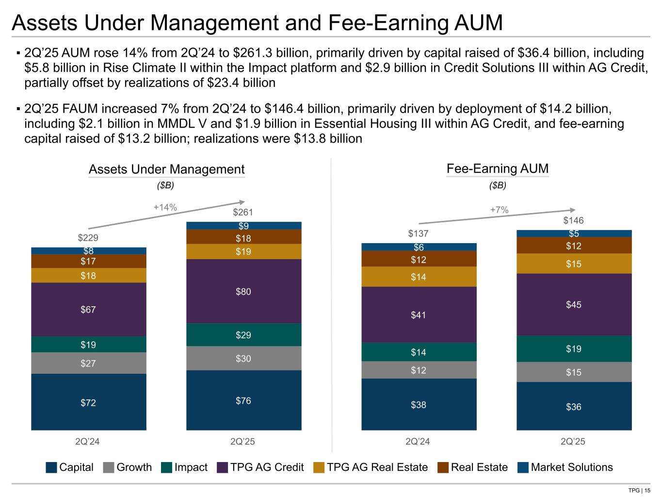 TPG | 15 $137 $146 $38 $36 $12 $15 $14 $19 $41 $45 $14 $15$12 $12$6 $5 2Q’24 2Q’25 $229 $261 $72 $76 $27 $30 $19 $29 $67 $80 $18 $19 $17 $18 $8 $9 2Q’24 2Q’25 Assets Under Management and Fee-Earning AUM ▪ 2Q’25 AUM rose 14% from 2Q’24 to $261.3 billion, primarily driven by capital raised of $36.4 billion, including $5.8 billion in Rise Climate II within the Impact platform and $2.9 billion in Credit Solutions III within AG Credit, partially offset by realizations of $23.4 billion ▪ 2Q’25 FAUM increased 7% from 2Q’24 to $146.4 billion, primarily driven by deployment of $14.2 billion, including $2.1 billion in MMDL V and $1.9 billion in Essential Housing III within AG Credit, and fee-earning capital raised of $13.2 billion; realizations were $13.8 billion Assets Under Management Fee-Earning AUM ($B) ($B) +14% +7% Capital Growth Impact TPG AG Credit TPG AG Real Estate Real Estate Market Solutions