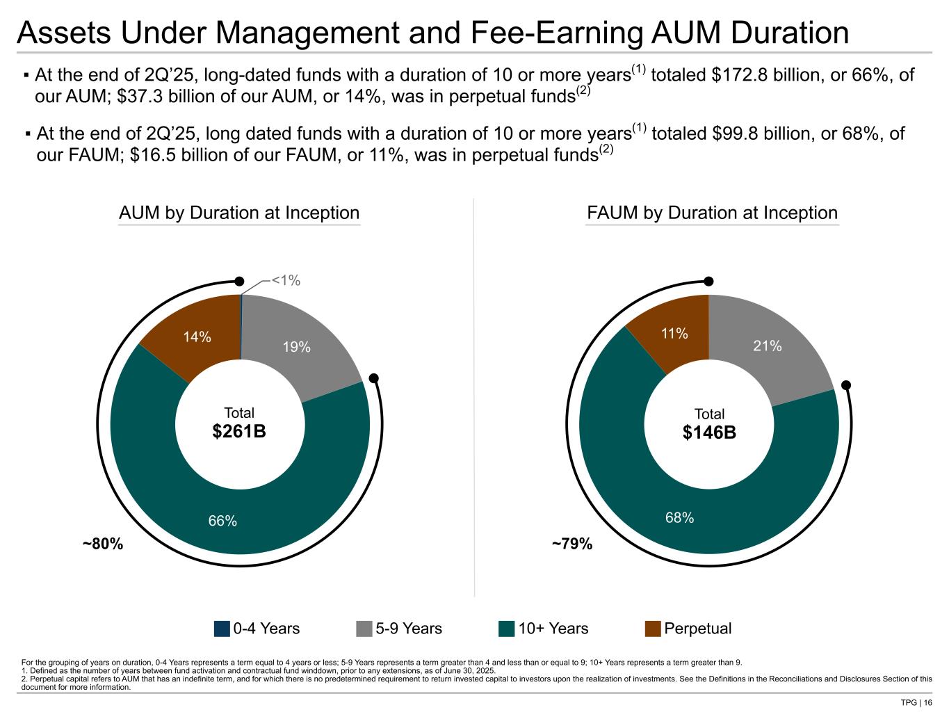 TPG | 35 Fund Performance Metrics Notes (Cont’d) 13) Each Middle Market Direct Lending fund is comprised of four vehicles: onshore levered, onshore unlevered, offshore levered and offshore unlevered. Capital Committed, Capital Invested, Realized Value, Unrealized Value and Total Value for each fund are presented on a consolidated basis across the four vehicles. Performance metrics are presented only for the onshore levered vehicle of each fund. The Net IRRs and Net MoMs for TPG AG Middle Market Direct Lending funds on a consolidated basis were: (i) for the onshore unlevered vehicles, 7% and 1.3x, (ii) for the offshore levered vehicles, 9% and 1.3x and (iii) for the offshore unlevered vehicles, 7% and 1.2x. 14) Japanese-Yen denominated fund. Commitments, Capital Invested and Realized Value are calculated using the exchange rate at the end of the quarter in which the relevant commitment was made or transaction occurred, as applicable. 15) Includes Euro denominated fund entity with Commitments, Capital Invested and Realized Value calculated using the exchange rate at the end of the quarter in which the relevant commitment was made or transaction occurred, as applicable. Performance metrics only reflects capital committed in U.S. dollars, which represents the majority of capital committed to each fund. Net IRR and Net MoM were: (i) for the euro-denominated vehicle of Europe Realty III, 4% and 1.1x and (ii) for the euro-denominated vehicle of Europe Realty IV, NM and NM. 16) These performance estimates represent the composite performance of TPG Public Equity Partners, LP and TPG Public Equity Partners Master Fund, L.P., adjusted as described below. The performance estimates are based on an investment in TPG Public Equity Partners, LP made on September 1, 2013, the date of TPEP’s inception, with the performance estimates for the period from January 1, 2016 to present being based on an investment in TPG Public Equity Partners Master Fund, L.P. made through TPG Public Equity Partners-A, L.P., the “onshore feeder.” As of June 30, 2025, TPEP Long/Short had estimated inception-to-date gross returns of 212% and net returns of 152%. Gross performance figures (i) are presented after any investment-related expenses, net interest, other expenses and the reinvestment of dividends; (ii) include any gains or losses from “new issue” securities; and (iii) are adjusted for illustration purposes to reflect the reduction of a hypothetical 1.5% annual management fee. 17) These performance estimates represent performance for TPEP Long Only and are based on an investment in TPEP Long Only made on May 1, 2019, the date of TPEP Long Only’s inception, through TPG Public Equity Partners Long Opportunities-A, L.P., the “onshore feeder.” As of June 30, 2025, TPEP Long Only had estimated inception-to-date gross returns of 70% and net returns of 69%. Gross performance figures are presented after any investment-related expenses, a 1% annual management fee, net interest, other expenses and the reinvestment of dividends, and include any gains or losses from “new issue” securities. 18) T-POP Total Return reflects a per unit return based on Class R-S, including reinvestment of any dividends received during the period (if applicable), and no upfront selling commission, net of all fees and expenses incurred by T-POP. Total Return for Class R-I is 5%. 19) Total Return includes onshore investors participating directly through the master fund and investors through the offshore vehicle. Total Return for the offshore vehicle was 4%. 20) Total Returns for onshore funds only. Total Returns for the offshore vehicles were: (i) for the MVP Fund, 11%, (ii) for ABC Evergreen, NM and (iii) for the Super Fund, 8%. 21) Total Return is calculated as the change in NAV per share during the period, plus distributions per share (assuming dividends and distributions are reinvested) divided by the beginning NAV per share. Inception-to-date figures for Class I, Class D, and Class S shares use the initial offering price per share as the beginning NAV. Total Return presented is for Class I and is prior to the impact of any potential upfront placement fees. An investment in TCAP is subject to a maximum upfront placement fee of 1.5% for Class D and 3.5% for Class S, which would reduce the amount of capital available for investment, if applicable. There are no upfront placement fees for Class I shares. Total Return has been annualized for periods less than or greater than one year.