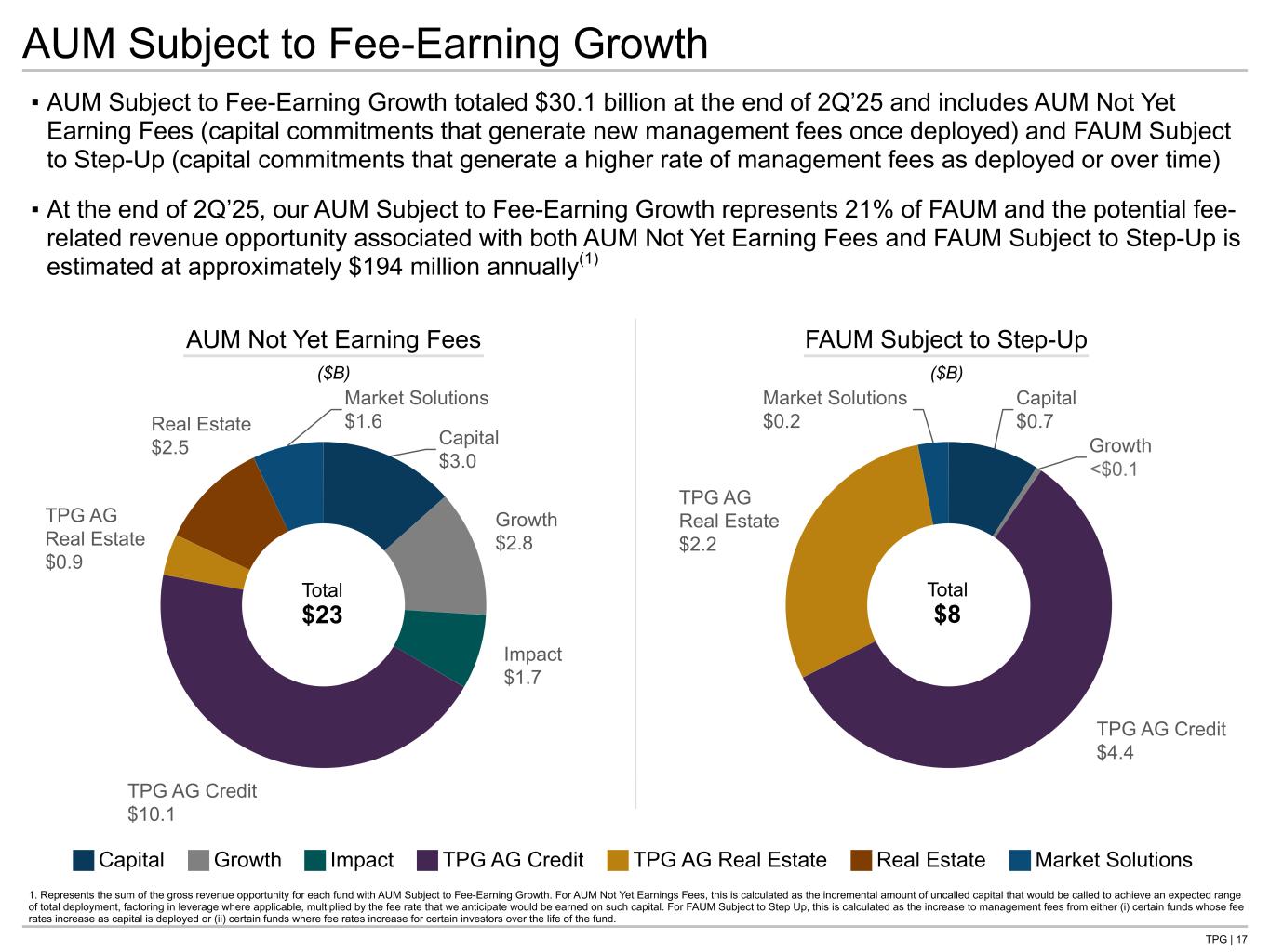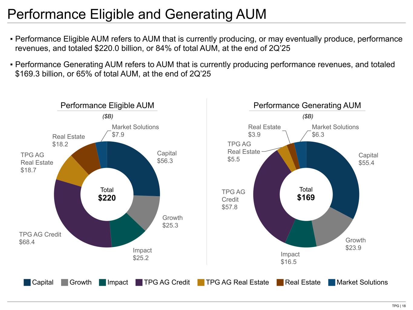 TPG | 17 Capital $0.7 Growth $0.0 TPG AG Credit $4.4 TPG AG Real Estate $2.2 Market Solutions $0.2 Capital $3.0 Growth $2.8 Impact $1.7 TPG AG Credit $10.1 TPG AG Real Estate $0.9 Real Estate $2.5 Market Solutions $1.6 ▪ AUM Subject to Fee-Earning Growth totaled $30.1 billion at the end of 2Q’25 and includes AUM Not Yet Earning Fees (capital commitments that generate new management fees once deployed) and FAUM Subject to Step-Up (capital commitments that generate a higher rate of management fees as deployed or over time) ▪ At the end of 2Q’25, our AUM Subject to Fee-Earning Growth represents 21% of FAUM and the potential fee- related revenue opportunity associated with both AUM Not Yet Earning Fees and FAUM Subject to Step-Up is estimated at approximately $194 million annually(1) AUM Not Yet Earning Fees FAUM Subject to Step-Up ($B) ($B) Total $23 Total $8 AUM Subject to Fee-Earning Growth 1. Represents the sum of the gross revenue opportunity for each fund with AUM Subject to Fee-Earning Growth. For AUM Not Yet Earnings Fees, this is calculated as the incremental amount of uncalled capital that would be called to achieve an expected range of total deployment, factoring in leverage where applicable, multiplied by the fee rate that we anticipate would be earned on such capital. For FAUM Subject to Step Up, this is calculated as the increase to management fees from either (i) certain funds whose fee rates increase as capital is deployed or (ii) certain funds where fee rates increase for certain investors over the life of the fund. Capital Growth Impact TPG AG Credit TPG AG Real Estate Real Estate Market Solutions <$0.1