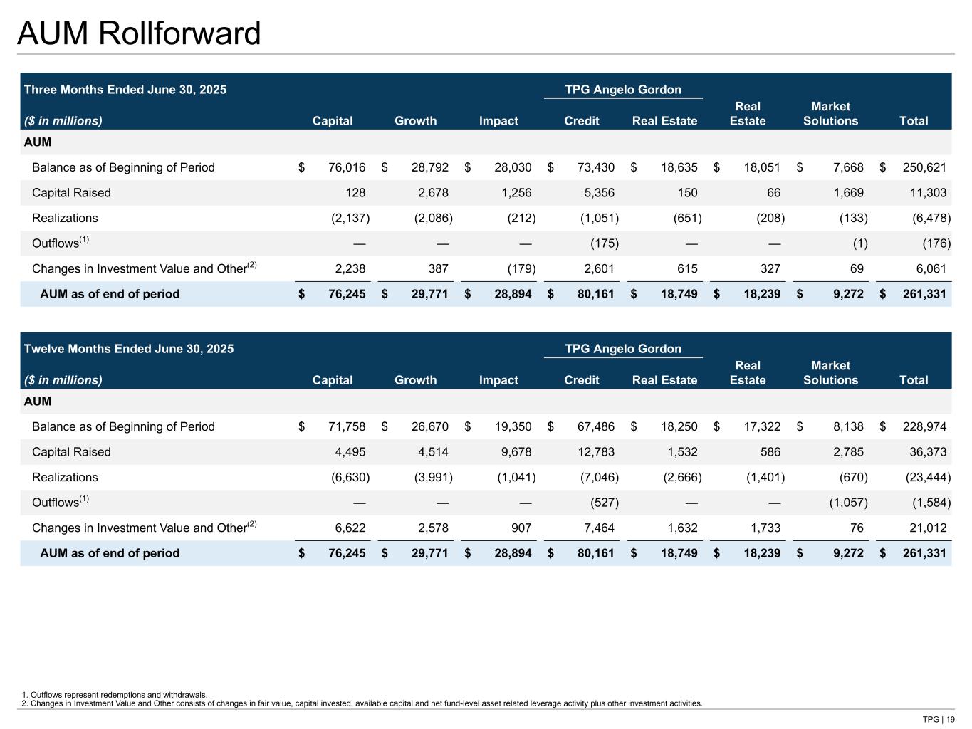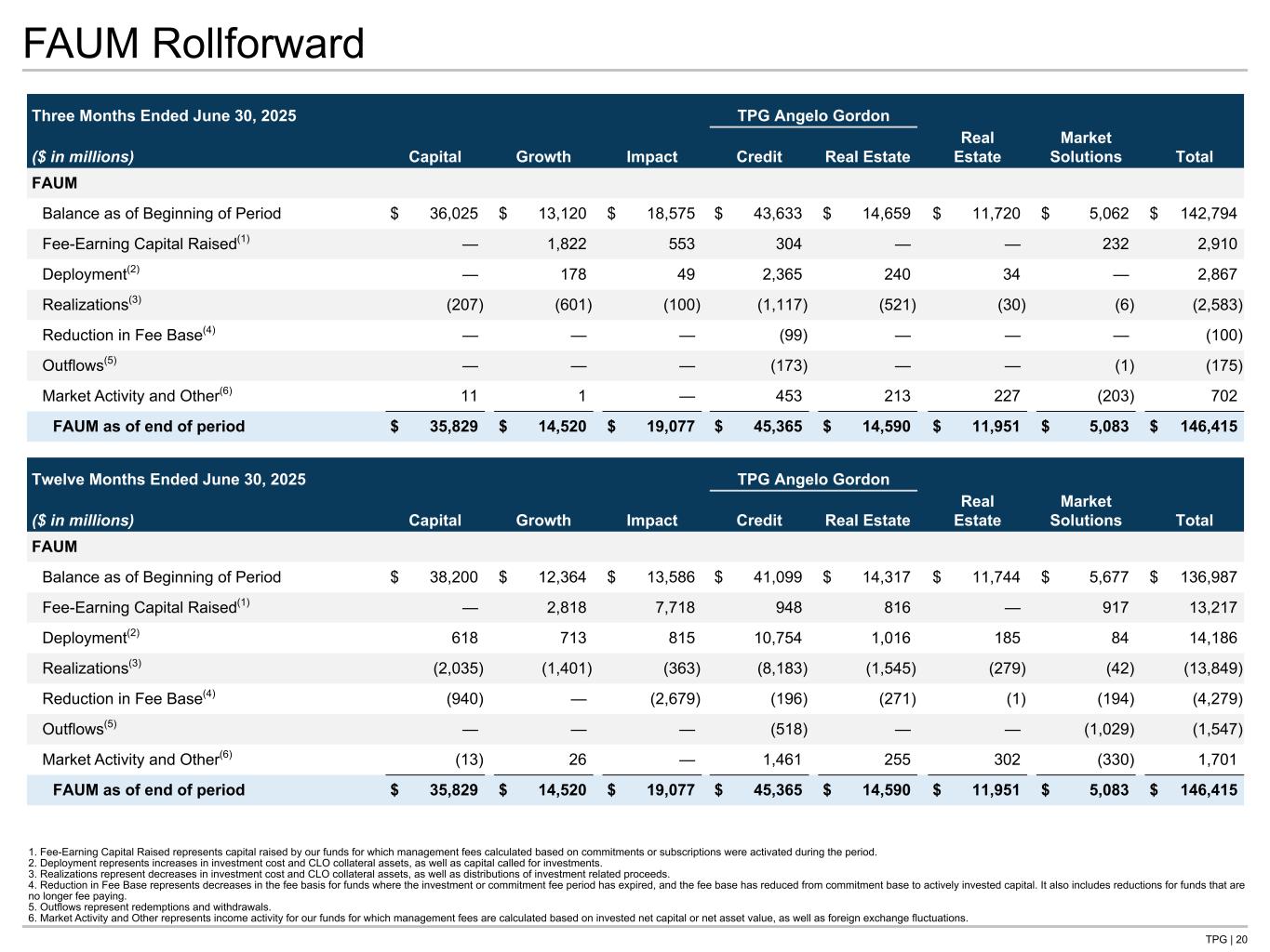 TPG | 19 AUM Rollforward Three Months Ended June 30, 2025 TPG Angelo Gordon ($ in millions) Capital Growth Impact Credit Real Estate Real Estate Market Solutions Total AUM Balance as of Beginning of Period $ 76,016 $ 28,792 $ 28,030 $ 73,430 $ 18,635 $ 18,051 $ 7,668 $ 250,621 Capital Raised 128 2,678 1,256 5,356 150 66 1,669 11,303 Realizations (2,137) (2,086) (212) (1,051) (651) (208) (133) (6,478) Outflows(1) — — — (175) — — (1) (176) Changes in Investment Value and Other(2) 2,238 387 (179) 2,601 615 327 69 6,061 AUM as of end of period $ 76,245 $ 29,771 $ 28,894 $ 80,161 $ 18,749 $ 18,239 $ 9,272 $ 261,331 Twelve Months Ended June 30, 2025 TPG Angelo Gordon ($ in millions) Capital Growth Impact Credit Real Estate Real Estate Market Solutions Total AUM Balance as of Beginning of Period $ 71,758 $ 26,670 $ 19,350 $ 67,486 $ 18,250 $ 17,322 $ 8,138 $ 228,974 Capital Raised 4,495 4,514 9,678 12,783 1,532 586 2,785 36,373 Realizations (6,630) (3,991) (1,041) (7,046) (2,666) (1,401) (670) (23,444) Outflows(1) — — — (527) — — (1,057) (1,584) Changes in Investment Value and Other(2) 6,622 2,578 907 7,464 1,632 1,733 76 21,012 AUM as of end of period $ 76,245 $ 29,771 $ 28,894 $ 80,161 $ 18,749 $ 18,239 $ 9,272 $ 261,331 1. Outflows represent redemptions and withdrawals. 2. Changes in Investment Value and Other consists of changes in fair value, capital invested, available capital and net fund-level asset related leverage activity plus other investment activities. Tie to 4sq page