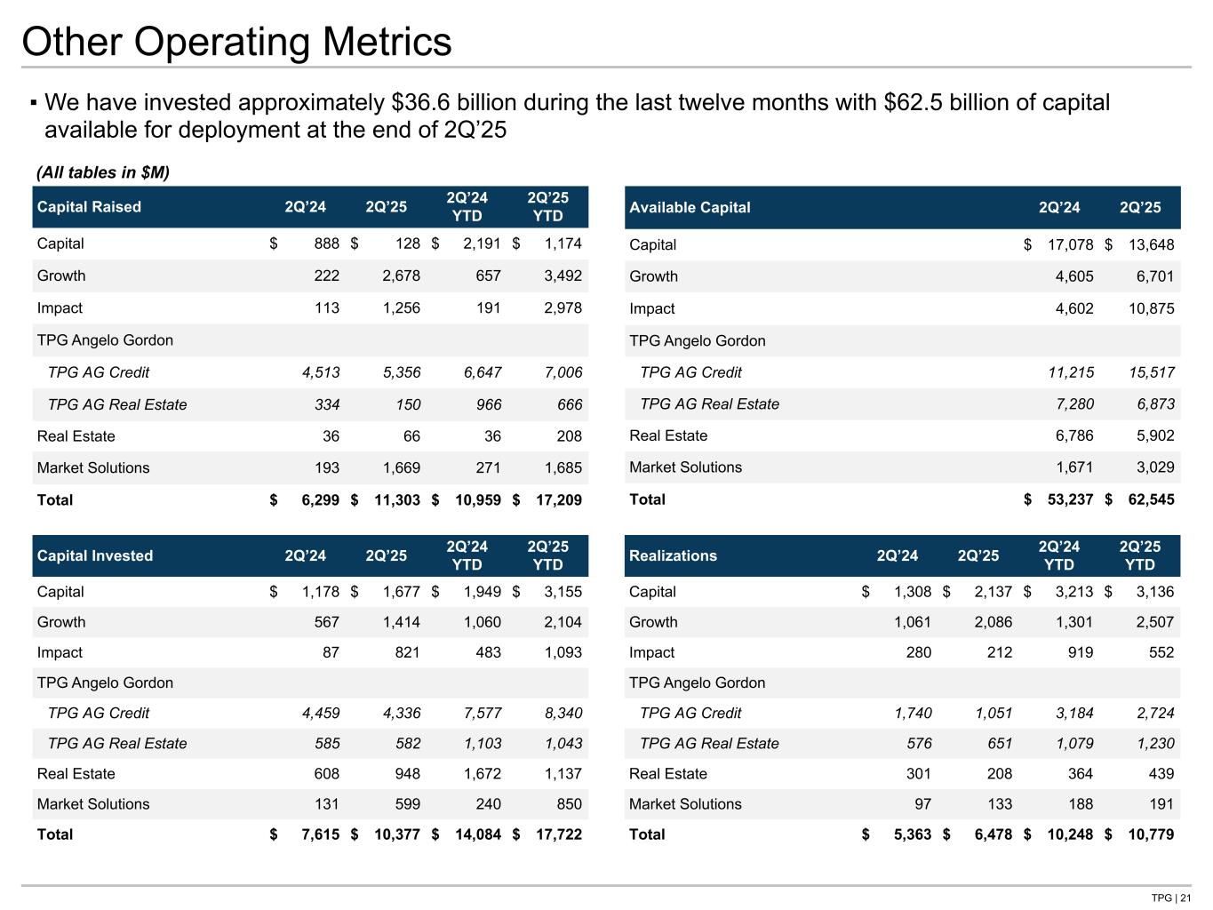 TPG | 20 FAUM Rollforward Three Months Ended June 30, 2025 TPG Angelo Gordon ($ in millions) Capital Growth Impact Credit Real Estate Real Estate Market Solutions Total FAUM Balance as of Beginning of Period $ 36,025 $ 13,120 $ 18,575 $ 43,633 $ 14,659 $ 11,720 $ 5,062 $ 142,794 Fee-Earning Capital Raised(1) — 1,822 553 304 — — 232 2,910 Deployment(2) — 178 49 2,365 240 34 — 2,867 Realizations(3) (207) (601) (100) (1,117) (521) (30) (6) (2,583) Reduction in Fee Base(4) — — — (99) — — — (100) Outflows(5) — — — (173) — — (1) (175) Market Activity and Other(6) 11 1 — 453 213 227 (203) 702 FAUM as of end of period $ 35,829 $ 14,520 $ 19,077 $ 45,365 $ 14,590 $ 11,951 $ 5,083 $ 146,415 Twelve Months Ended June 30, 2025 TPG Angelo Gordon ($ in millions) Capital Growth Impact Credit Real Estate Real Estate Market Solutions Total FAUM Balance as of Beginning of Period $ 38,200 $ 12,364 $ 13,586 $ 41,099 $ 14,317 $ 11,744 $ 5,677 $ 136,987 Fee-Earning Capital Raised(1) — 2,818 7,718 948 816 — 917 13,217 Deployment(2) 618 713 815 10,754 1,016 185 84 14,186 Realizations(3) (2,035) (1,401) (363) (8,183) (1,545) (279) (42) (13,849) Reduction in Fee Base(4) (940) — (2,679) (196) (271) (1) (194) (4,279) Outflows(5) — — — (518) — — (1,029) (1,547) Market Activity and Other(6) (13) 26 — 1,461 255 302 (330) 1,701 FAUM as of end of period $ 35,829 $ 14,520 $ 19,077 $ 45,365 $ 14,590 $ 11,951 $ 5,083 $ 146,415 1. Fee-Earning Capital Raised represents capital raised by our funds for which management fees calculated based on commitments or subscriptions were activated during the period. 2. Deployment represents increases in investment cost and CLO collateral assets, as well as capital called for investments. 3. Realizations represent decreases in investment cost and CLO collateral assets, as well as distributions of investment related proceeds. 4. Reduction in Fee Base represents decreases in the fee basis for funds where the investment or commitment fee period has expired, and the fee base has reduced from commitment base to actively invested capital. It also includes reductions for funds that are no longer fee paying. 5. Outflows represent redemptions and withdrawals. 6. Market Activity and Other represents income activity for our funds for which management fees are calculated based on invested net capital or net asset value, as well as foreign exchange fluctuations.