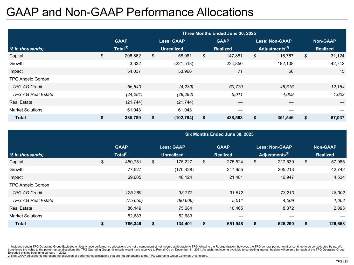 TPG | 23 GAAP and Non-GAAP Performance Allocations 1. Includes certain TPG Operating Group Excluded entities whose performance allocations are not a component of net income attributable to TPG following the Reorganization; however, the TPG general partner entities continue to be consolidated by us. We transferred the rights to the performance allocations the TPG Operating Group historically would have received to RemainCo on December 31, 2021. As such, net income available to controlling interest holders will be zero for each of the TPG Operating Group Excluded entities beginning January 1, 2022. 2. Non-GAAP adjustments represent the exclusion of performance allocations that are not attributable to the TPG Operating Group Common Unit holders. Three Months Ended June 30, 2025 GAAP Less: GAAP GAAP Less: Non-GAAP Non-GAAP ($ in thousands) Total(1) Unrealized Realized Adjustments(2) Realized Capital $ 206,862 $ 58,981 $ 147,881 $ 116,757 $ 31,124 Growth 3,332 (221,518) 224,850 182,108 42,742 Impact 54,037 53,966 71 56 15 TPG Angelo Gordon TPG AG Credit 56,540 (4,230) 60,770 48,616 12,154 TPG AG Real Estate (24,281) (29,292) 5,011 4,009 1,002 Real Estate (21,744) (21,744) — — — Market Solutions 61,043 61,043 — — — Total $ 335,789 $ (102,794) $ 438,583 $ 351,546 $ 87,037 Six Months Ended June 30, 2025 GAAP Less: GAAP GAAP Less: Non-GAAP Non-GAAP ($ in thousands) Total(1) Unrealized Realized Adjustments(2) Realized Capital $ 450,751 $ 175,227 $ 275,524 $ 217,539 $ 57,985 Growth 77,527 (170,428) 247,955 205,213 42,742 Impact 69,605 48,124 21,481 16,947 4,534 TPG Angelo Gordon TPG AG Credit 125,289 33,777 91,512 73,210 18,302 TPG AG Real Estate (75,655) (80,666) 5,011 4,009 1,002 Real Estate 86,149 75,684 10,465 8,372 2,093 Market Solutions 52,683 52,683 — — — Total $ 786,349 $ 134,401 $ 651,948 $ 525,290 $ 126,658 Tie to NG P&L