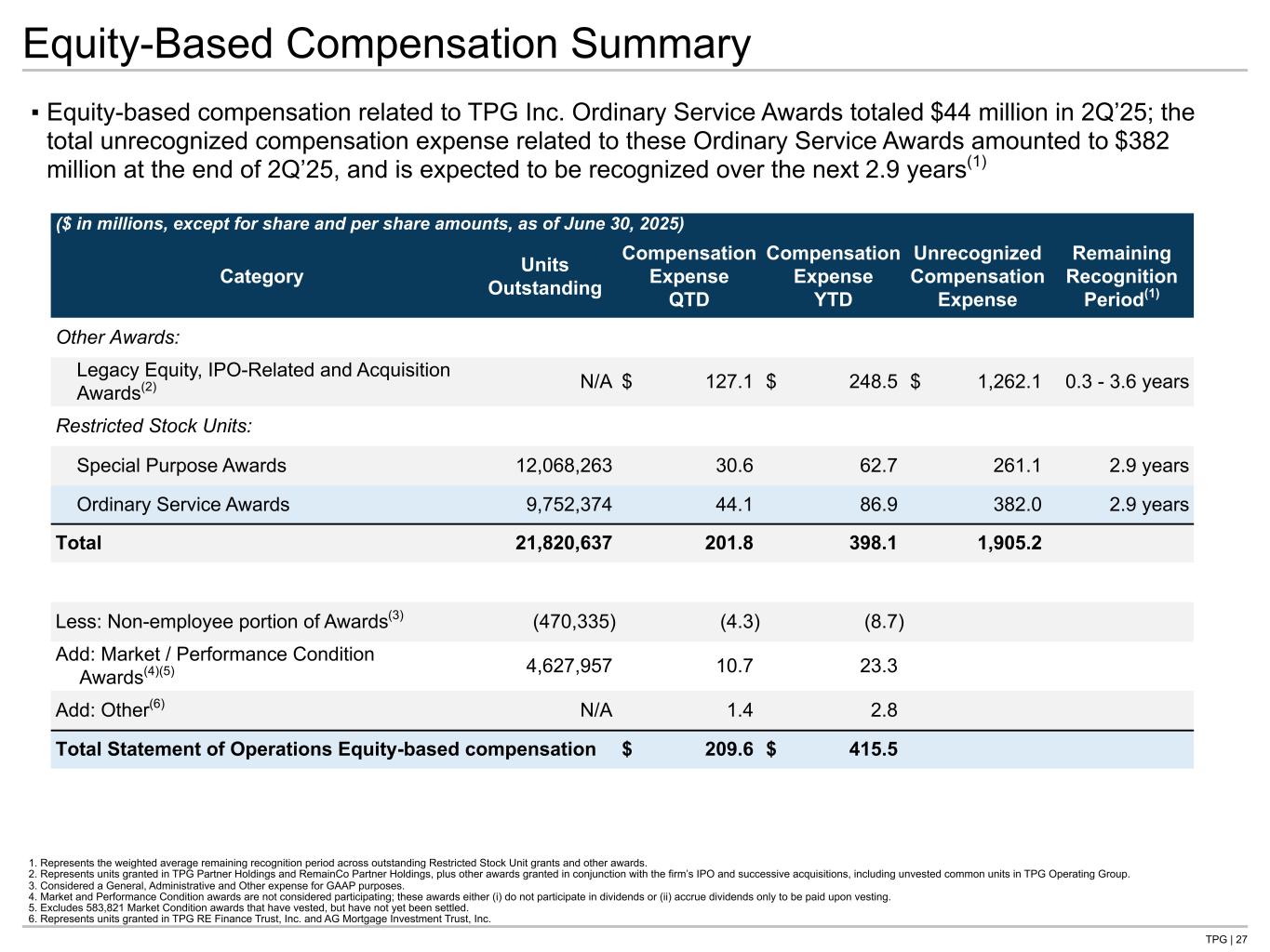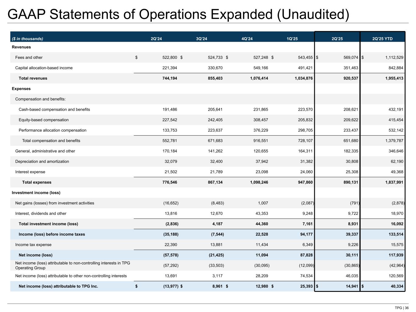 TPG | 36 GAAP Statements of Operations Expanded (Unaudited) ($ in thousands) 2Q’24 3Q’24 4Q’24 1Q’25 2Q’25 2Q’25 YTD Revenues Fees and other $ 522,800 $ 524,733 $ 527,248 $ 543,455 $ 569,074 $ 1,112,529 Capital allocation-based income 221,394 330,670 549,166 491,421 351,463 842,884 Total revenues 744,194 855,403 1,076,414 1,034,876 920,537 1,955,413 Expenses Compensation and benefits: Cash-based compensation and benefits 191,486 205,641 231,865 223,570 208,621 432,191 Equity-based compensation 227,542 242,405 308,457 205,832 209,622 415,454 Performance allocation compensation 133,753 223,637 376,229 298,705 233,437 532,142 Total compensation and benefits 552,781 671,683 916,551 728,107 651,680 1,379,787 General, administrative and other 170,184 141,262 120,655 164,311 182,335 346,646 Depreciation and amortization 32,079 32,400 37,942 31,382 30,808 62,190 Interest expense 21,502 21,789 23,098 24,060 25,308 49,368 Total expenses 776,546 867,134 1,098,246 947,860 890,131 1,837,991 Investment income (loss) Net gains (losses) from investment activities (16,652) (8,483) 1,007 (2,087) (791) (2,878) Interest, dividends and other 13,816 12,670 43,353 9,248 9,722 18,970 Total investment income (loss) (2,836) 4,187 44,360 7,161 8,931 16,092 Income (loss) before income taxes (35,188) (7,544) 22,528 94,177 39,337 133,514 Income tax expense 22,390 13,881 11,434 6,349 9,226 15,575 Net income (loss) (57,578) (21,425) 11,094 87,828 30,111 117,939 Net income (loss) attributable to non-controlling interests in TPG Operating Group (57,292) (33,503) (30,095) (12,099) (30,865) (42,964) Net income (loss) attributable to other non-controlling interests 13,691 3,117 28,209 74,534 46,035 120,569 Net income (loss) attributable to TPG Inc. $ (13,977) $ 8,961 $ 12,980 $ 25,393 $ 14,941 $ 40,334 Tie to: -G P&L at front of deck -G-NG recon