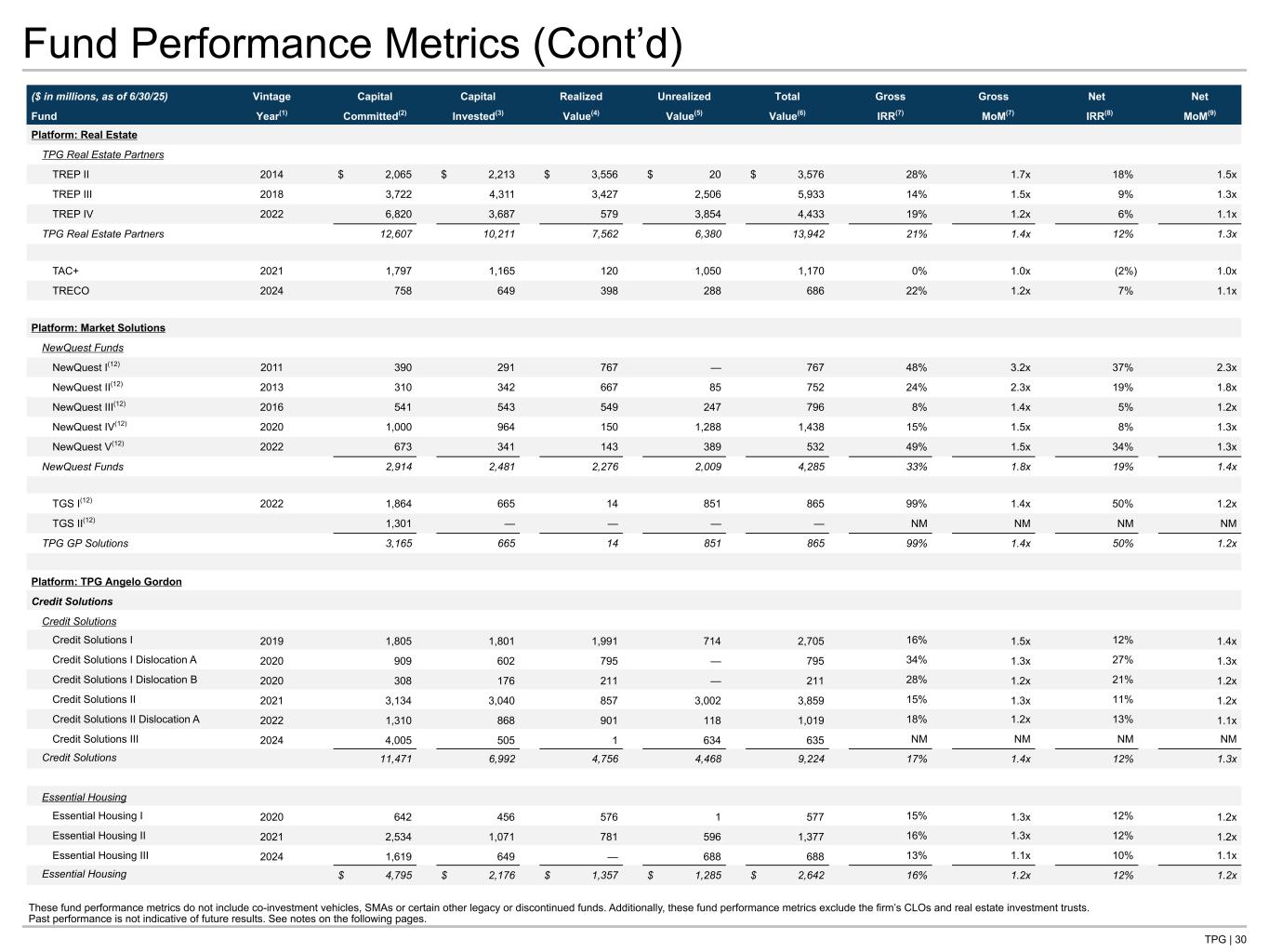 TPG | 30 Fund Performance Metrics (Cont’d) ($ in millions, as of 6/30/25) Vintage Capital Capital Realized Unrealized Total Gross Gross Net Net Fund Year(1) Committed(2) Invested(3) Value(4) Value(5) Value(6) IRR(7) MoM(7) IRR(8) MoM(9) Platform: Real Estate TPG Real Estate Partners TREP II 2014 $ 2,065 $ 2,213 $ 3,556 $ 20 $ 3,576 28% 1.7x 18% 1.5x TREP III 2018 3,722 4,311 3,427 2,506 5,933 14% 1.5x 9% 1.3x TREP IV 2022 6,820 3,687 579 3,854 4,433 19% 1.2x 6% 1.1x TPG Real Estate Partners 12,607 10,211 7,562 6,380 13,942 21% 1.4x 12% 1.3x TAC+ 2021 1,797 1,165 120 1,050 1,170 0% 1.0x (2%) 1.0x TRECO 2024 758 649 398 288 686 22% 1.2x 7% 1.1x Platform: Market Solutions NewQuest Funds NewQuest I(12) 2011 390 291 767 — 767 48% 3.2x 37% 2.3x NewQuest II(12) 2013 310 342 667 85 752 24% 2.3x 19% 1.8x NewQuest III(12) 2016 541 543 549 247 796 8% 1.4x 5% 1.2x NewQuest IV(12) 2020 1,000 964 150 1,288 1,438 15% 1.5x 8% 1.3x NewQuest V(12) 2022 673 341 143 389 532 49% 1.5x 34% 1.3x NewQuest Funds 2,914 2,481 2,276 2,009 4,285 33% 1.8x 19% 1.4x TGS I(12) 2022 1,864 665 14 851 865 99% 1.4x 50% 1.2x TGS II(12) 1,301 — — — — NM NM NM NM TPG GP Solutions 3,165 665 14 851 865 99% 1.4x 50% 1.2x Platform: TPG Angelo Gordon Credit Solutions Credit Solutions Credit Solutions I 2019 1,805 1,801 1,991 714 2,705 16% 1.5x 12% 1.4x Credit Solutions I Dislocation A 2020 909 602 795 — 795 34% 1.3x 27% 1.3x Credit Solutions I Dislocation B 2020 308 176 211 — 211 28% 1.2x 21% 1.2x Credit Solutions II 2021 3,134 3,040 857 3,002 3,859 15% 1.3x 11% 1.2x Credit Solutions II Dislocation A 2022 1,310 868 901 118 1,019 18% 1.2x 13% 1.1x Credit Solutions III 2024 4,005 505 1 634 635 NM NM NM NM Credit Solutions 11,471 6,992 4,756 4,468 9,224 17% 1.4x 12% 1.3x Essential Housing Essential Housing I 2020 642 456 576 1 577 15% 1.3x 12% 1.2x Essential Housing II 2021 2,534 1,071 781 596 1,377 16% 1.3x 12% 1.2x Essential Housing III 2024 1,619 649 — 688 688 13% 1.1x 10% 1.1x Essential Housing $ 4,795 $ 2,176 $ 1,357 $ 1,285 $ 2,642 16% 1.2x 12% 1.2x These fund performance metrics do not include co-investment vehicles, SMAs or certain other legacy or discontinued funds. Additionally, these fund performance metrics exclude the firm’s CLOs and real estate investment trusts. Past performance is not indicative of future results. See notes on the following pages.