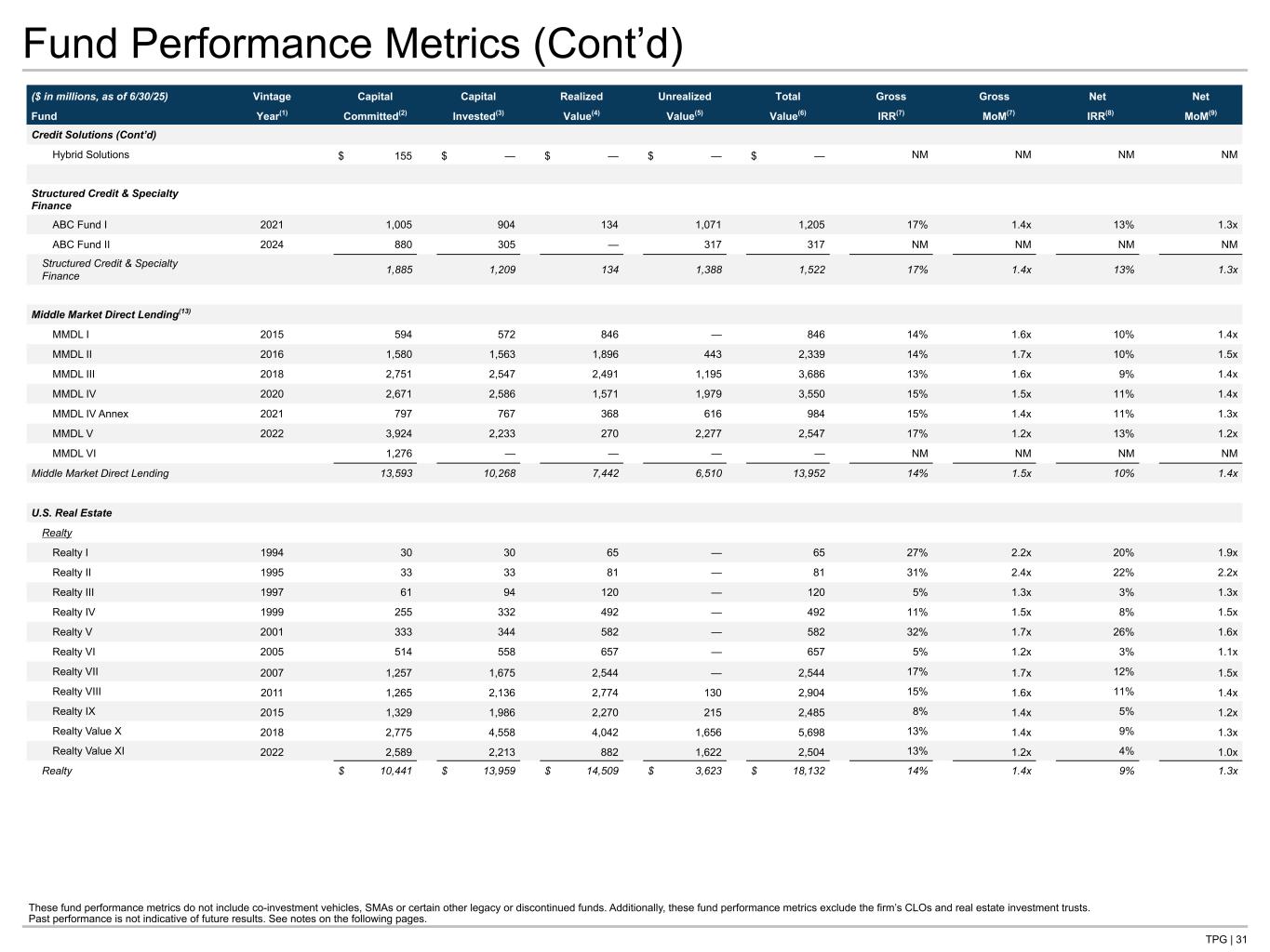 TPG | 31 Fund Performance Metrics (Cont’d) ($ in millions, as of 6/30/25) Vintage Capital Capital Realized Unrealized Total Gross Gross Net Net Fund Year(1) Committed(2) Invested(3) Value(4) Value(5) Value(6) IRR(7) MoM(7) IRR(8) MoM(9) Credit Solutions (Cont’d) Hybrid Solutions $ 155 $ — $ — $ — $ — NM NM NM NM Structured Credit & Specialty Finance ABC Fund I 2021 1,005 904 134 1,071 1,205 17% 1.4x 13% 1.3x ABC Fund II 2024 880 305 — 317 317 NM NM NM NM Structured Credit & Specialty Finance 1,885 1,209 134 1,388 1,522 17% 1.4x 13% 1.3x Middle Market Direct Lending(13) MMDL I 2015 594 572 846 — 846 14% 1.6x 10% 1.4x MMDL II 2016 1,580 1,563 1,896 443 2,339 14% 1.7x 10% 1.5x MMDL III 2018 2,751 2,547 2,491 1,195 3,686 13% 1.6x 9% 1.4x MMDL IV 2020 2,671 2,586 1,571 1,979 3,550 15% 1.5x 11% 1.4x MMDL IV Annex 2021 797 767 368 616 984 15% 1.4x 11% 1.3x MMDL V 2022 3,924 2,233 270 2,277 2,547 17% 1.2x 13% 1.2x MMDL VI 1,276 — — — — NM NM NM NM Middle Market Direct Lending 13,593 10,268 7,442 6,510 13,952 14% 1.5x 10% 1.4x U.S. Real Estate Realty Realty I 1994 30 30 65 — 65 27% 2.2x 20% 1.9x Realty II 1995 33 33 81 — 81 31% 2.4x 22% 2.2x Realty III 1997 61 94 120 — 120 5% 1.3x 3% 1.3x Realty IV 1999 255 332 492 — 492 11% 1.5x 8% 1.5x Realty V 2001 333 344 582 — 582 32% 1.7x 26% 1.6x Realty VI 2005 514 558 657 — 657 5% 1.2x 3% 1.1x Realty VII 2007 1,257 1,675 2,544 — 2,544 17% 1.7x 12% 1.5x Realty VIII 2011 1,265 2,136 2,774 130 2,904 15% 1.6x 11% 1.4x Realty IX 2015 1,329 1,986 2,270 215 2,485 8% 1.4x 5% 1.2x Realty Value X 2018 2,775 4,558 4,042 1,656 5,698 13% 1.4x 9% 1.3x Realty Value XI 2022 2,589 2,213 882 1,622 2,504 13% 1.2x 4% 1.0x Realty $ 10,441 $ 13,959 $ 14,509 $ 3,623 $ 18,132 14% 1.4x 9% 1.3x These fund performance metrics do not include co-investment vehicles, SMAs or certain other legacy or discontinued funds. Additionally, these fund performance metrics exclude the firm’s CLOs and real estate investment trusts. Past performance is not indicative of future results. See notes on the following pages.