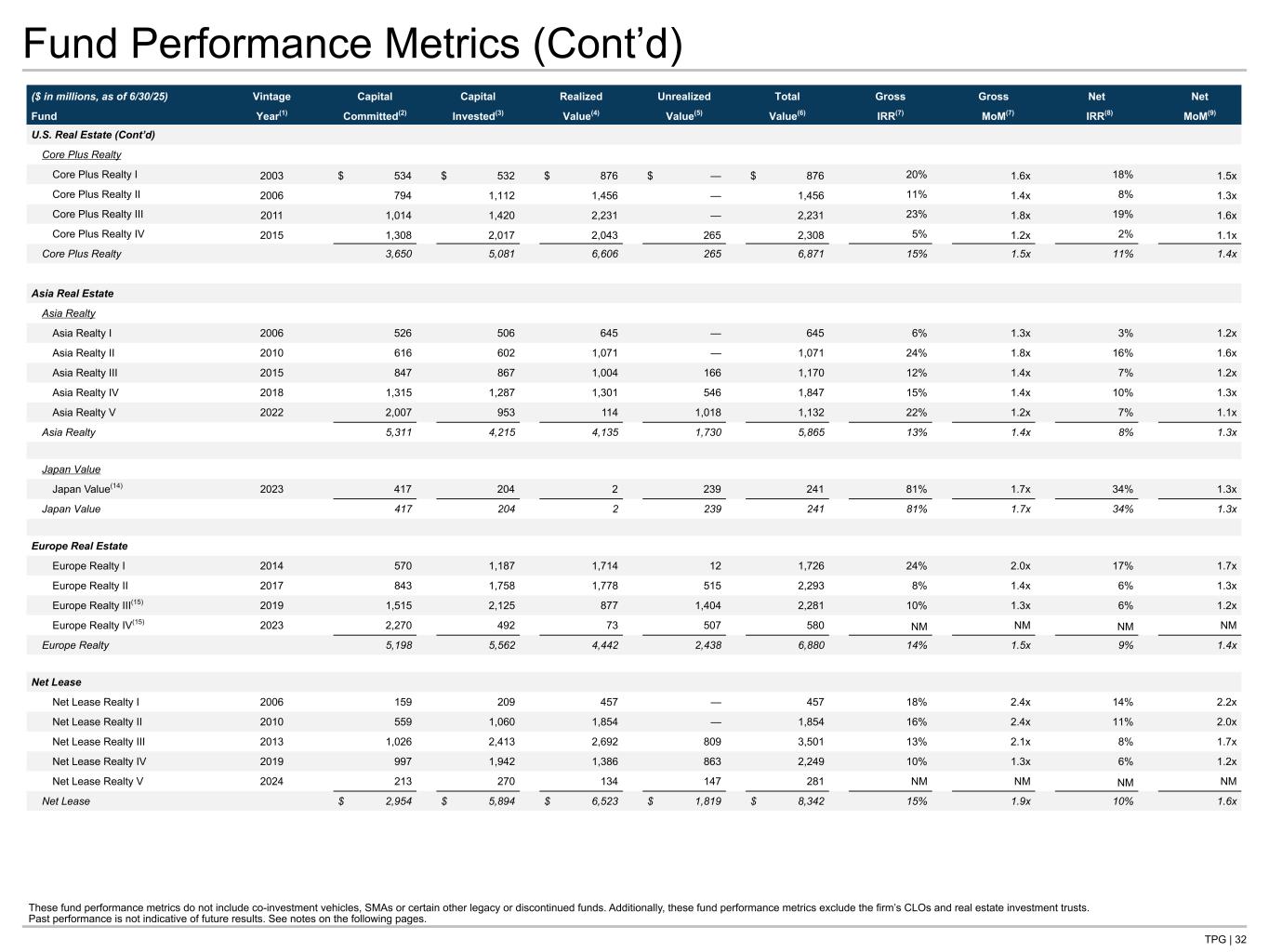 TPG | 32 Fund Performance Metrics (Cont’d) ($ in millions, as of 6/30/25) Vintage Capital Capital Realized Unrealized Total Gross Gross Net Net Fund Year(1) Committed(2) Invested(3) Value(4) Value(5) Value(6) IRR(7) MoM(7) IRR(8) MoM(9) U.S. Real Estate (Cont’d) Core Plus Realty Core Plus Realty I 2003 $ 534 $ 532 $ 876 $ — $ 876 20% 1.6x 18% 1.5x Core Plus Realty II 2006 794 1,112 1,456 — 1,456 11% 1.4x 8% 1.3x Core Plus Realty III 2011 1,014 1,420 2,231 — 2,231 23% 1.8x 19% 1.6x Core Plus Realty IV 2015 1,308 2,017 2,043 265 2,308 5% 1.2x 2% 1.1x Core Plus Realty 3,650 5,081 6,606 265 6,871 15% 1.5x 11% 1.4x Asia Real Estate Asia Realty Asia Realty I 2006 526 506 645 — 645 6% 1.3x 3% 1.2x Asia Realty II 2010 616 602 1,071 — 1,071 24% 1.8x 16% 1.6x Asia Realty III 2015 847 867 1,004 166 1,170 12% 1.4x 7% 1.2x Asia Realty IV 2018 1,315 1,287 1,301 546 1,847 15% 1.4x 10% 1.3x Asia Realty V 2022 2,007 953 114 1,018 1,132 22% 1.2x 7% 1.1x Asia Realty 5,311 4,215 4,135 1,730 5,865 13% 1.4x 8% 1.3x Japan Value Japan Value(14) 2023 417 204 2 239 241 81% 1.7x 34% 1.3x Japan Value 417 204 2 239 241 81% 1.7x 34% 1.3x Europe Real Estate Europe Realty I 2014 570 1,187 1,714 12 1,726 24% 2.0x 17% 1.7x Europe Realty II 2017 843 1,758 1,778 515 2,293 8% 1.4x 6% 1.3x Europe Realty III(15) 2019 1,515 2,125 877 1,404 2,281 10% 1.3x 6% 1.2x Europe Realty IV(15) 2023 2,270 492 73 507 580 NM NM NM NM Europe Realty 5,198 5,562 4,442 2,438 6,880 14% 1.5x 9% 1.4x Net Lease Net Lease Realty I 2006 159 209 457 — 457 18% 2.4x 14% 2.2x Net Lease Realty II 2010 559 1,060 1,854 — 1,854 16% 2.4x 11% 2.0x Net Lease Realty III 2013 1,026 2,413 2,692 809 3,501 13% 2.1x 8% 1.7x Net Lease Realty IV 2019 997 1,942 1,386 863 2,249 10% 1.3x 6% 1.2x Net Lease Realty V 2024 213 270 134 147 281 NM NM NM NM Net Lease $ 2,954 $ 5,894 $ 6,523 $ 1,819 $ 8,342 15% 1.9x 10% 1.6x These fund performance metrics do not include co-investment vehicles, SMAs or certain other legacy or discontinued funds. Additionally, these fund performance metrics exclude the firm’s CLOs and real estate investment trusts. Past performance is not indicative of future results. See notes on the following pages.