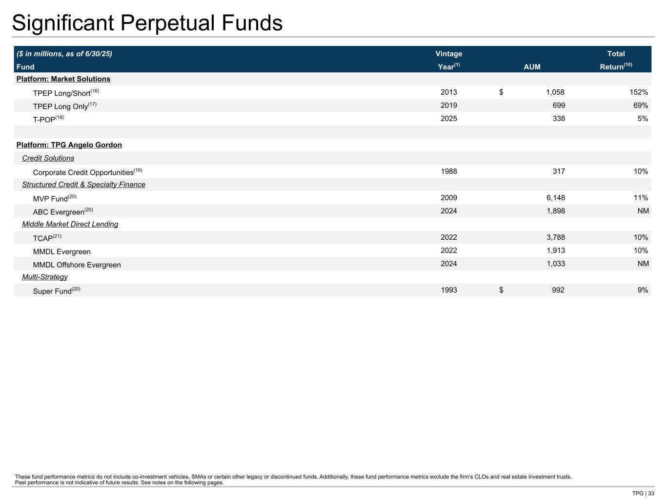 TPG | 33 Significant Perpetual Funds ($ in millions, as of 6/30/25) Vintage AUM Total Fund Year(1) Return(10) Platform: Market Solutions TPEP Long/Short(16) 2013 $ 1,058 152% TPEP Long Only(17) 2019 699 69% T-POP(18) 2025 338 5% Platform: TPG Angelo Gordon Credit Solutions Corporate Credit Opportunities(19) 1988 317 10% Structured Credit & Specialty Finance MVP Fund(20) 2009 6,148 11% ABC Evergreen(20) 2024 1,898 NM Middle Market Direct Lending TCAP(21) 2022 3,788 10% MMDL Evergreen 2022 1,913 10% MMDL Offshore Evergreen 2024 1,033 NM Multi-Strategy Super Fund(20) 1993 $ 992 9% These fund performance metrics do not include co-investment vehicles, SMAs or certain other legacy or discontinued funds. Additionally, these fund performance metrics exclude the firm’s CLOs and real estate investment trusts. Past performance is not indicative of future results. See notes on the following pages.