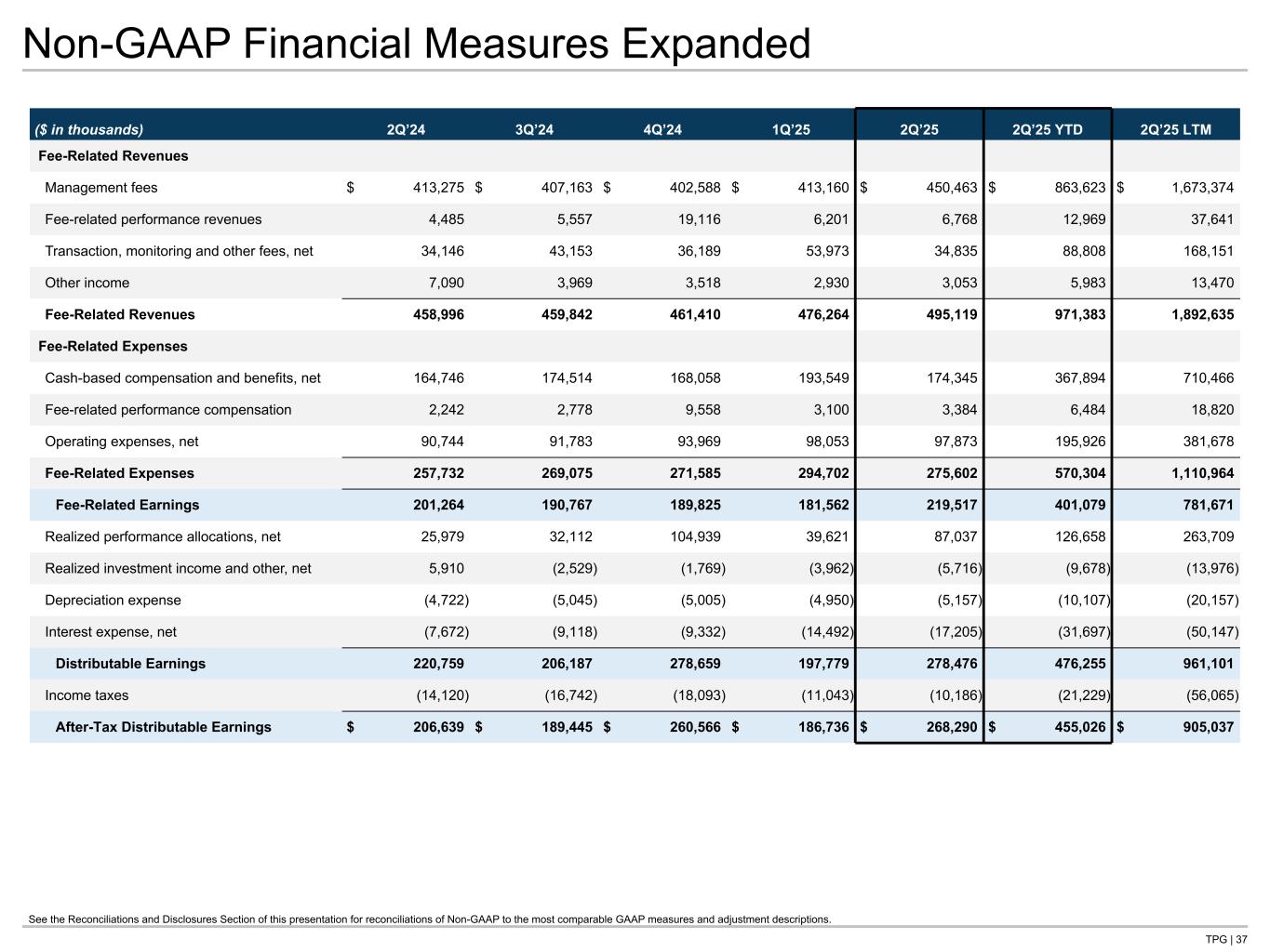 TPG | 37 Non-GAAP Financial Measures Expanded See the Reconciliations and Disclosures Section of this presentation for reconciliations of Non-GAAP to the most comparable GAAP measures and adjustment descriptions. ($ in thousands) 2Q’24 3Q’24 4Q’24 1Q’25 2Q’25 2Q’25 YTD 2Q’25 LTM Fee-Related Revenues Management fees $ 413,275 $ 407,163 $ 402,588 $ 413,160 $ 450,463 $ 863,623 $ 1,673,374 Fee-related performance revenues 4,485 5,557 19,116 6,201 6,768 12,969 37,641 Transaction, monitoring and other fees, net 34,146 43,153 36,189 53,973 34,835 88,808 168,151 Other income 7,090 3,969 3,518 2,930 3,053 5,983 13,470 Fee-Related Revenues 458,996 459,842 461,410 476,264 495,119 971,383 1,892,635 Fee-Related Expenses Cash-based compensation and benefits, net 164,746 174,514 168,058 193,549 174,345 367,894 710,466 Fee-related performance compensation 2,242 2,778 9,558 3,100 3,384 6,484 18,820 Operating expenses, net 90,744 91,783 93,969 98,053 97,873 195,926 381,678 Fee-Related Expenses 257,732 269,075 271,585 294,702 275,602 570,304 1,110,964 Fee-Related Earnings 201,264 190,767 189,825 181,562 219,517 401,079 781,671 Realized performance allocations, net 25,979 32,112 104,939 39,621 87,037 126,658 263,709 Realized investment income and other, net 5,910 (2,529) (1,769) (3,962) (5,716) (9,678) (13,976) Depreciation expense (4,722) (5,045) (5,005) (4,950) (5,157) (10,107) (20,157) Interest expense, net (7,672) (9,118) (9,332) (14,492) (17,205) (31,697) (50,147) Distributable Earnings 220,759 206,187 278,659 197,779 278,476 476,255 961,101 Income taxes (14,120) (16,742) (18,093) (11,043) (10,186) (21,229) (56,065) After-Tax Distributable Earnings $ 206,639 $ 189,445 $ 260,566 $ 186,736 $ 268,290 $ 455,026 $ 905,037 Tie to: -NG P&L at front -G-NG qtrly in recon section