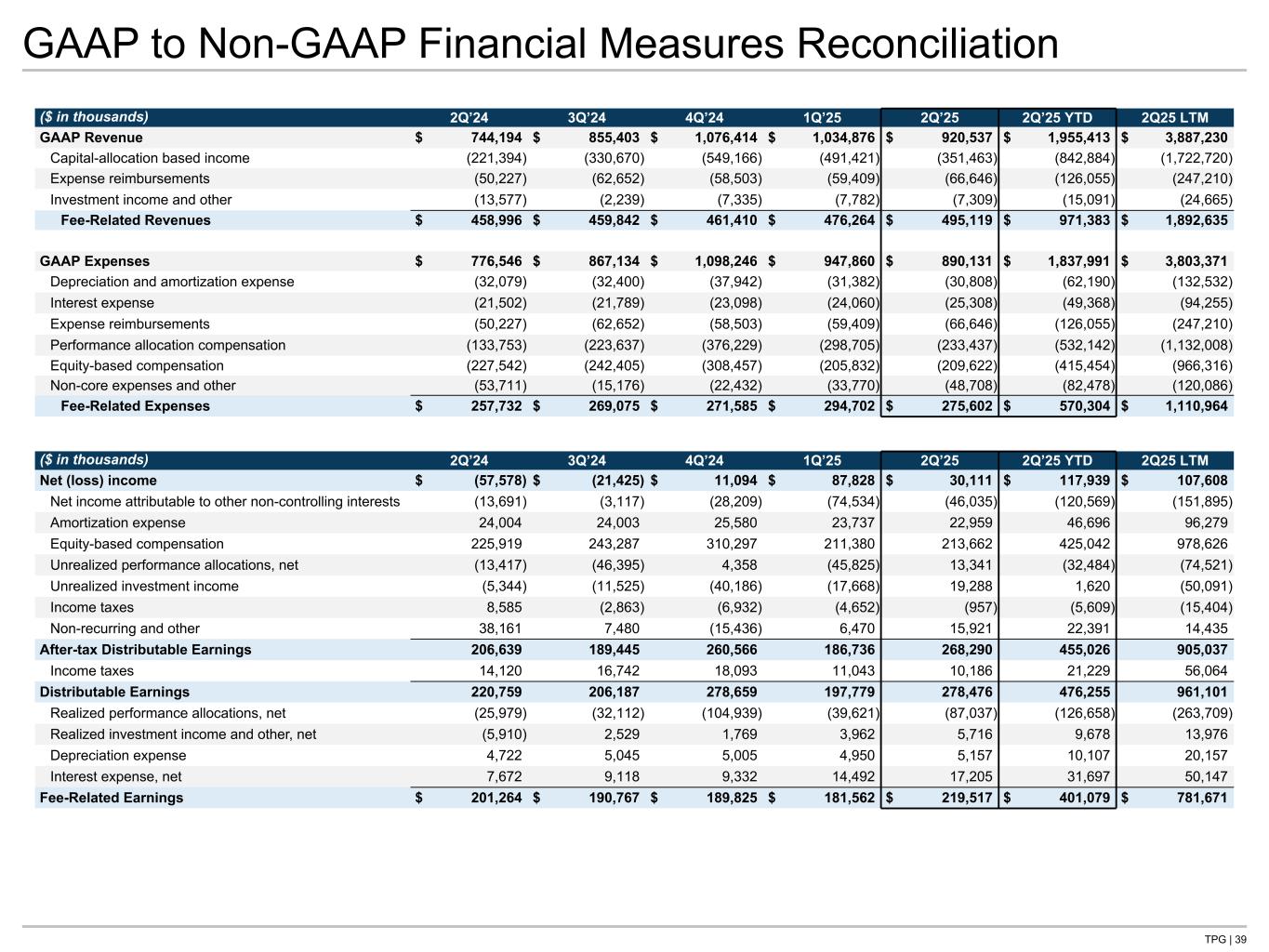 TPG | 39 GAAP to Non-GAAP Financial Measures Reconciliation ($ in thousands) 2Q’24 3Q’24 4Q’24 1Q’25 2Q’25 2Q’25 YTD 2Q25 LTM GAAP Revenue $ 744,194 $ 855,403 $ 1,076,414 $ 1,034,876 $ 920,537 $ 1,955,413 $ 3,887,230 Capital-allocation based income (221,394) (330,670) (549,166) (491,421) (351,463) (842,884) (1,722,720) Expense reimbursements (50,227) (62,652) (58,503) (59,409) (66,646) (126,055) (247,210) Investment income and other (13,577) (2,239) (7,335) (7,782) (7,309) (15,091) (24,665) Fee-Related Revenues $ 458,996 $ 459,842 $ 461,410 $ 476,264 $ 495,119 $ 971,383 $ 1,892,635 GAAP Expenses $ 776,546 $ 867,134 $ 1,098,246 $ 947,860 $ 890,131 $ 1,837,991 $ 3,803,371 Depreciation and amortization expense (32,079) (32,400) (37,942) (31,382) (30,808) (62,190) (132,532) Interest expense (21,502) (21,789) (23,098) (24,060) (25,308) (49,368) (94,255) Expense reimbursements (50,227) (62,652) (58,503) (59,409) (66,646) (126,055) (247,210) Performance allocation compensation (133,753) (223,637) (376,229) (298,705) (233,437) (532,142) (1,132,008) Equity-based compensation (227,542) (242,405) (308,457) (205,832) (209,622) (415,454) (966,316) Non-core expenses and other (53,711) (15,176) (22,432) (33,770) (48,708) (82,478) (120,086) Fee-Related Expenses $ 257,732 $ 269,075 $ 271,585 $ 294,702 $ 275,602 $ 570,304 $ 1,110,964 ($ in thousands) 2Q’24 3Q’24 4Q’24 1Q’25 2Q’25 2Q’25 YTD 2Q25 LTM Net (loss) income $ (57,578) $ (21,425) $ 11,094 $ 87,828 $ 30,111 $ 117,939 $ 107,608 Net income attributable to other non-controlling interests (13,691) (3,117) (28,209) (74,534) (46,035) (120,569) (151,895) Amortization expense 24,004 24,003 25,580 23,737 22,959 46,696 96,279 Equity-based compensation 225,919 243,287 310,297 211,380 213,662 425,042 978,626 Unrealized performance allocations, net (13,417) (46,395) 4,358 (45,825) 13,341 (32,484) (74,521) Unrealized investment income (5,344) (11,525) (40,186) (17,668) 19,288 1,620 (50,091) Income taxes 8,585 (2,863) (6,932) (4,652) (957) (5,609) (15,404) Non-recurring and other 38,161 7,480 (15,436) 6,470 15,921 22,391 14,435 After-tax Distributable Earnings 206,639 189,445 260,566 186,736 268,290 455,026 905,037 Income taxes 14,120 16,742 18,093 11,043 10,186 21,229 56,064 Distributable Earnings 220,759 206,187 278,659 197,779 278,476 476,255 961,101 Realized performance allocations, net (25,979) (32,112) (104,939) (39,621) (87,037) (126,658) (263,709) Realized investment income and other, net (5,910) 2,529 1,769 3,962 5,716 9,678 13,976 Depreciation expense 4,722 5,045 5,005 4,950 5,157 10,107 20,157 Interest expense, net 7,672 9,118 9,332 14,492 17,205 31,697 50,147 Fee-Related Earnings $ 201,264 $ 190,767 $ 189,825 $ 181,562 $ 219,517 $ 401,079 $ 781,671 Tie to: -NG P&L at front -NG qtrly P&L -G P&L at front -G qtrly P&L