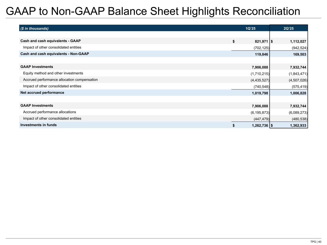 TPG | 40 GAAP to Non-GAAP Balance Sheet Highlights Reconciliation ($ in thousands) 1Q’25 2Q’25 Cash and cash equivalents - GAAP $ 821,971 $ 1,112,027 Impact of other consolidated entities (702,125) (942,524) Cash and cash equivalents - Non-GAAP 119,846 169,503 GAAP Investments 7,906,088 7,932,744 Equity method and other investments (1,710,215) (1,843,471) Accrued performance allocation compensation (4,435,527) (4,507,026) Impact of other consolidated entities (740,548) (575,419) Net accrued performance 1,019,798 1,006,828 GAAP Investments 7,906,088 7,932,744 Accrued performance allocations (6,195,873) (6,089,273) Impact of other consolidated entities (447,479) (480,538) Investments in funds $ 1,262,736 $ 1,362,933 Tie to: -G B/S page -NG B/S page