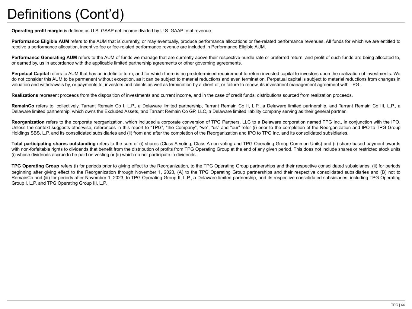 TPG | 44 Definitions (Cont’d) Operating profit margin is defined as U.S. GAAP net income divided by U.S. GAAP total revenue. Performance Eligible AUM refers to the AUM that is currently, or may eventually, produce performance allocations or fee-related performance revenues. All funds for which we are entitled to receive a performance allocation, incentive fee or fee-related performance revenue are included in Performance Eligible AUM. Performance Generating AUM refers to the AUM of funds we manage that are currently above their respective hurdle rate or preferred return, and profit of such funds are being allocated to, or earned by, us in accordance with the applicable limited partnership agreements or other governing agreements. Perpetual Capital refers to AUM that has an indefinite term, and for which there is no predetermined requirement to return invested capital to investors upon the realization of investments. We do not consider this AUM to be permanent without exception, as it can be subject to material reductions and even termination. Perpetual capital is subject to material reductions from changes in valuation and withdrawals by, or payments to, investors and clients as well as termination by a client of, or failure to renew, its investment management agreement with TPG. Realizations represent proceeds from the disposition of investments and current income, and in the case of credit funds, distributions sourced from realization proceeds. RemainCo refers to, collectively, Tarrant Remain Co I, L.P., a Delaware limited partnership, Tarrant Remain Co II, L.P., a Delaware limited partnership, and Tarrant Remain Co III, L.P., a Delaware limited partnership, which owns the Excluded Assets, and Tarrant Remain Co GP, LLC, a Delaware limited liability company serving as their general partner. Reorganization refers to the corporate reorganization, which included a corporate conversion of TPG Partners, LLC to a Delaware corporation named TPG Inc., in conjunction with the IPO. Unless the context suggests otherwise, references in this report to “TPG”, “the Company”, “we”, “us” and “our” refer (i) prior to the completion of the Reorganization and IPO to TPG Group Holdings SBS, L.P. and its consolidated subsidiaries and (ii) from and after the completion of the Reorganization and IPO to TPG Inc. and its consolidated subsidiaries. Total participating shares outstanding refers to the sum of (i) shares (Class A voting, Class A non-voting and TPG Operating Group Common Units) and (ii) share-based payment awards with non-forfeitable rights to dividends that benefit from the distribution of profits from TPG Operating Group at the end of any given period. This does not include shares or restricted stock units (i) whose dividends accrue to be paid on vesting or (ii) which do not participate in dividends. TPG Operating Group refers (i) for periods prior to giving effect to the Reorganization, to the TPG Operating Group partnerships and their respective consolidated subsidiaries; (ii) for periods beginning after giving effect to the Reorganization through November 1, 2023, (A) to the TPG Operating Group partnerships and their respective consolidated subsidiaries and (B) not to RemainCo and (iii) for periods after November 1, 2023, to TPG Operating Group II, L.P., a Delaware limited partnership, and its respective consolidated subsidiaries, including TPG Operating Group I, L.P. and TPG Operating Group III, L.P.