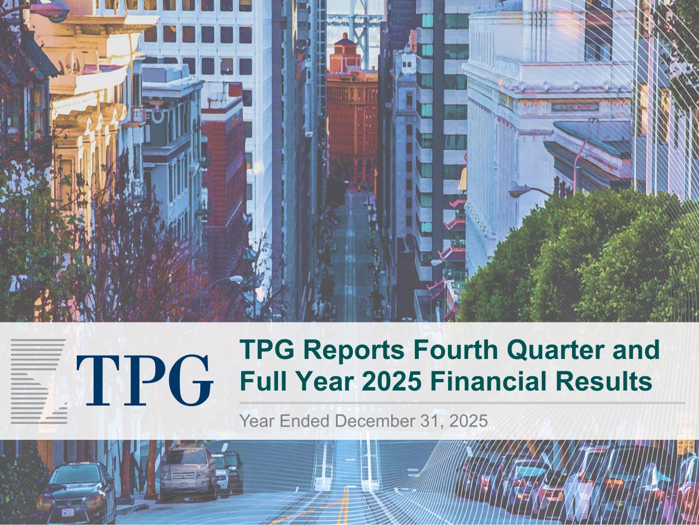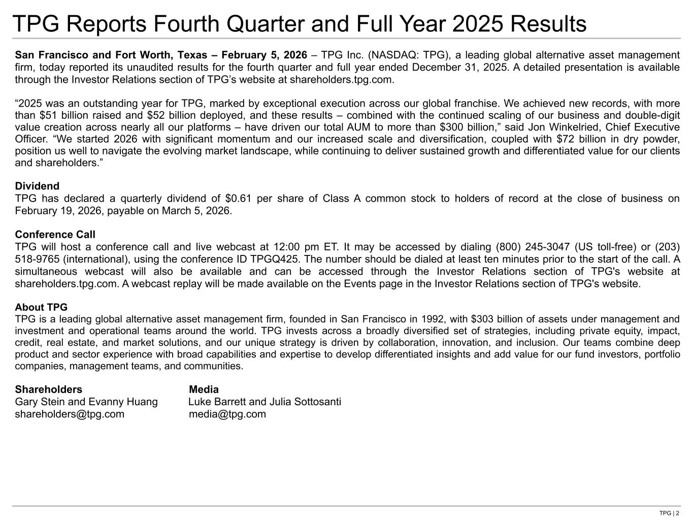 TPG | 2 San Francisco and Fort Worth, Texas – February 5, 2026 – TPG Inc. (NASDAQ: TPG), a leading global alternative asset management firm, today reported its unaudited results for the fourth quarter and full year ended December 31, 2025. A detailed presentation is available through the Investor Relations section of TPG’s website at shareholders.tpg.com. “2025 was an outstanding year for TPG, marked by exceptional execution across our global franchise. We achieved new records, with more than $51 billion raised and $52 billion deployed, and these results – combined with the continued scaling of our business and double-digit value creation across nearly all our platforms – have driven our total AUM to more than $300 billion,” said Jon Winkelried, Chief Executive Officer. “We started 2026 with significant momentum and our increased scale and diversification, coupled with $72 billion in dry powder, position us well to navigate the evolving market landscape, while continuing to deliver sustained growth and differentiated value for our clients and shareholders.” Dividend TPG has declared a quarterly dividend of $0.61 per share of Class A common stock to holders of record at the close of business on February 19, 2026, payable on March 5, 2026. Conference Call TPG will host a conference call and live webcast at 12:00 pm ET. It may be accessed by dialing (800) 245-3047 (US toll-free) or (203) 518-9765 (international), using the conference ID TPGQ425. The number should be dialed at least ten minutes prior to the start of the call. A simultaneous webcast will also be available and can be accessed through the Investor Relations section of TPG's website at shareholders.tpg.com. A webcast replay will be made available on the Events page in the Investor Relations section of TPG's website. About TPG TPG is a leading global alternative asset management firm, founded in San Francisco in 1992, with $303 billion of assets under management and investment and operational teams around the world. TPG invests across a broadly diversified set of strategies, including private equity, impact, credit, real estate, and market solutions, and our unique strategy is driven by collaboration, innovation, and inclusion. Our teams combine deep product and sector experience with broad capabilities and expertise to develop differentiated insights and add value for our fund investors, portfolio companies, management teams, and communities. Shareholders Media Gary Stein and Evanny Huang Luke Barrett and Julia Sottosanti shareholders@tpg.com media@tpg.com TPG Reports Fourth Quarter and Full Year 2025 Results