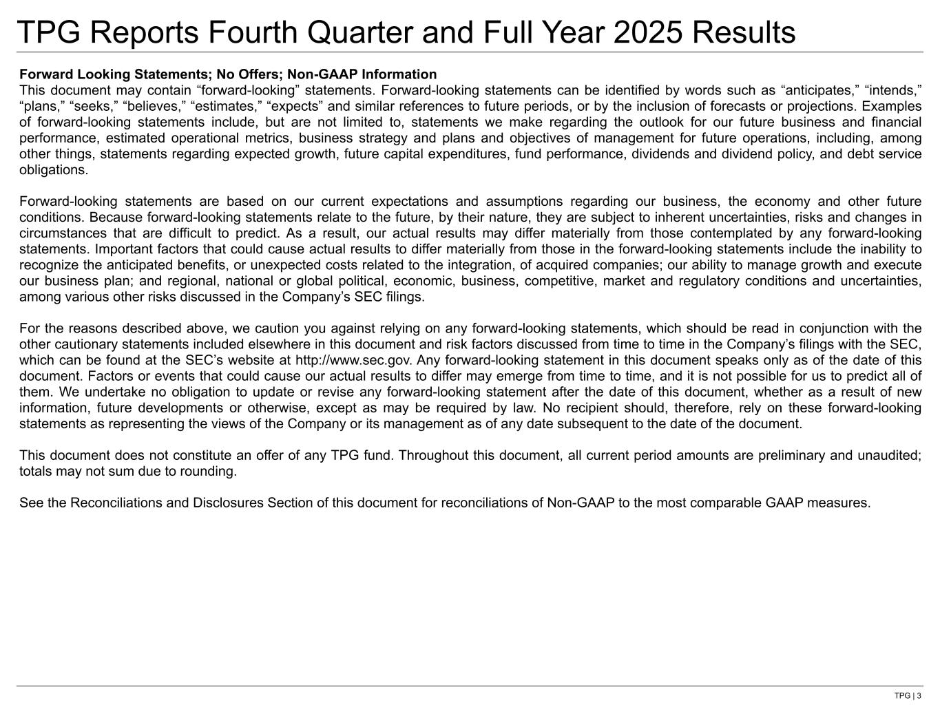 TPG | 3 TPG Reports Fourth Quarter and Full Year 2025 Results Forward Looking Statements; No Offers; Non-GAAP Information This document may contain “forward-looking” statements. Forward-looking statements can be identified by words such as “anticipates,” “intends,” “plans,” “seeks,” “believes,” “estimates,” “expects” and similar references to future periods, or by the inclusion of forecasts or projections. Examples of forward-looking statements include, but are not limited to, statements we make regarding the outlook for our future business and financial performance, estimated operational metrics, business strategy and plans and objectives of management for future operations, including, among other things, statements regarding expected growth, future capital expenditures, fund performance, dividends and dividend policy, and debt service obligations. Forward-looking statements are based on our current expectations and assumptions regarding our business, the economy and other future conditions. Because forward-looking statements relate to the future, by their nature, they are subject to inherent uncertainties, risks and changes in circumstances that are difficult to predict. As a result, our actual results may differ materially from those contemplated by any forward-looking statements. Important factors that could cause actual results to differ materially from those in the forward-looking statements include the inability to recognize the anticipated benefits, or unexpected costs related to the integration, of acquired companies; our ability to manage growth and execute our business plan; and regional, national or global political, economic, business, competitive, market and regulatory conditions and uncertainties, among various other risks discussed in the Company’s SEC filings. For the reasons described above, we caution you against relying on any forward-looking statements, which should be read in conjunction with the other cautionary statements included elsewhere in this document and risk factors discussed from time to time in the Company’s filings with the SEC, which can be found at the SEC’s website at http://www.sec.gov. Any forward-looking statement in this document speaks only as of the date of this document. Factors or events that could cause our actual results to differ may emerge from time to time, and it is not possible for us to predict all of them. We undertake no obligation to update or revise any forward-looking statement after the date of this document, whether as a result of new information, future developments or otherwise, except as may be required by law. No recipient should, therefore, rely on these forward-looking statements as representing the views of the Company or its management as of any date subsequent to the date of the document. This document does not constitute an offer of any TPG fund. Throughout this document, all current period amounts are preliminary and unaudited; totals may not sum due to rounding. See the Reconciliations and Disclosures Section of this document for reconciliations of Non-GAAP to the most comparable GAAP measures.