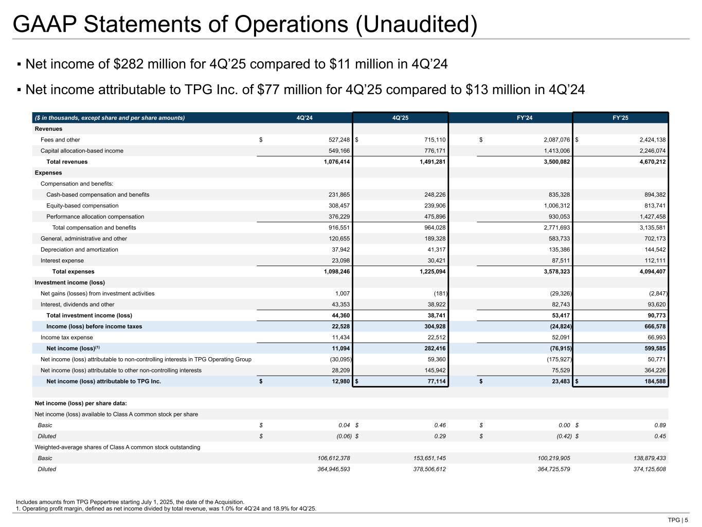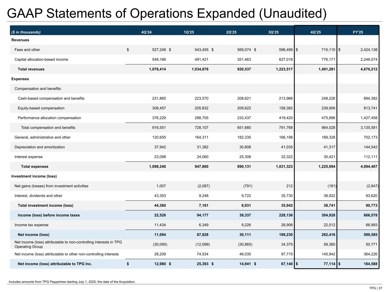 TPG | 37 GAAP Statements of Operations Expanded (Unaudited) ($ in thousands) 4Q’24 1Q’25 2Q’25 3Q’25 4Q’25 FY’25 Revenues Fees and other $ 527,248 $ 543,455 $ 569,074 $ 596,499 $ 715,110 $ 2,424,138 Capital allocation-based income 549,166 491,421 351,463 627,018 776,171 2,246,074 Total revenues 1,076,414 1,034,876 920,537 1,223,517 1,491,281 4,670,212 Expenses Compensation and benefits: Cash-based compensation and benefits 231,865 223,570 208,621 213,966 248,226 894,382 Equity-based compensation 308,457 205,832 209,622 158,382 239,906 813,741 Performance allocation compensation 376,229 298,705 233,437 419,420 475,896 1,427,458 Total compensation and benefits 916,551 728,107 651,680 791,768 964,028 3,135,581 General, administrative and other 120,655 164,311 182,335 166,198 189,328 702,173 Depreciation and amortization 37,942 31,382 30,808 41,035 41,317 144,542 Interest expense 23,098 24,060 25,308 32,322 30,421 112,111 Total expenses 1,098,246 947,860 890,131 1,031,323 1,225,094 4,094,407 Investment income (loss) Net gains (losses) from investment activities 1,007 (2,087) (791) 212 (181) (2,847) Interest, dividends and other 43,353 9,248 9,722 35,730 38,922 93,620 Total investment income (loss) 44,360 7,161 8,931 35,942 38,741 90,773 Income (loss) before income taxes 22,528 94,177 39,337 228,136 304,928 666,578 Income tax expense 11,434 6,349 9,226 28,906 22,512 66,993 Net income (loss) 11,094 87,828 30,111 199,230 282,416 599,585 Net income (loss) attributable to non-controlling interests in TPG Operating Group (30,095) (12,099) (30,865) 34,375 59,360 50,771 Net income (loss) attributable to other non-controlling interests 28,209 74,534 46,035 97,715 145,942 364,226 Net income (loss) attributable to TPG Inc. $ 12,980 $ 25,393 $ 14,941 $ 67,140 $ 77,114 $ 184,588 Tie to: -G P&L at front of deck -G-NG recon Includes amounts from TPG Peppertree starting July 1, 2025, the date of the Acquisition.