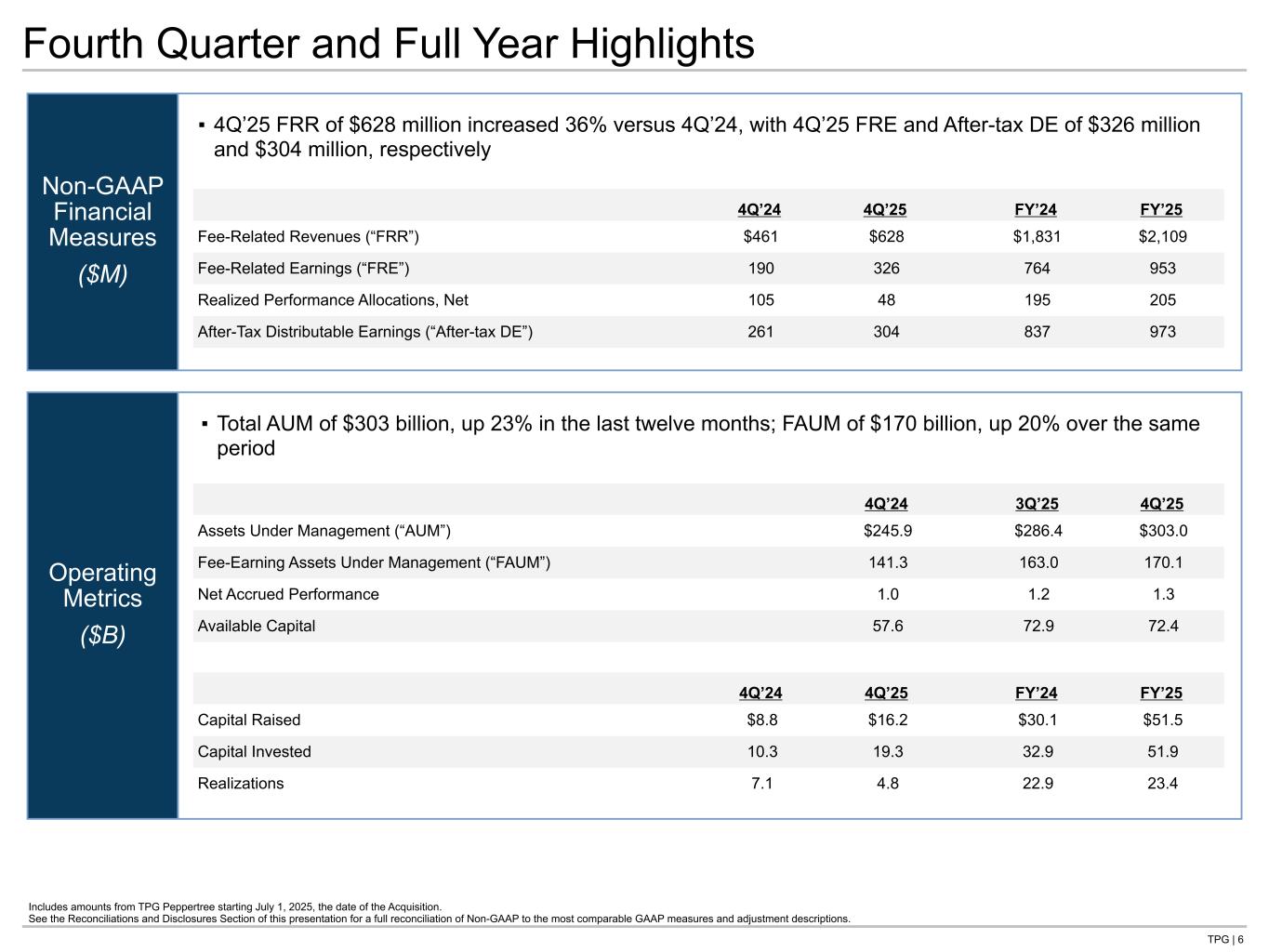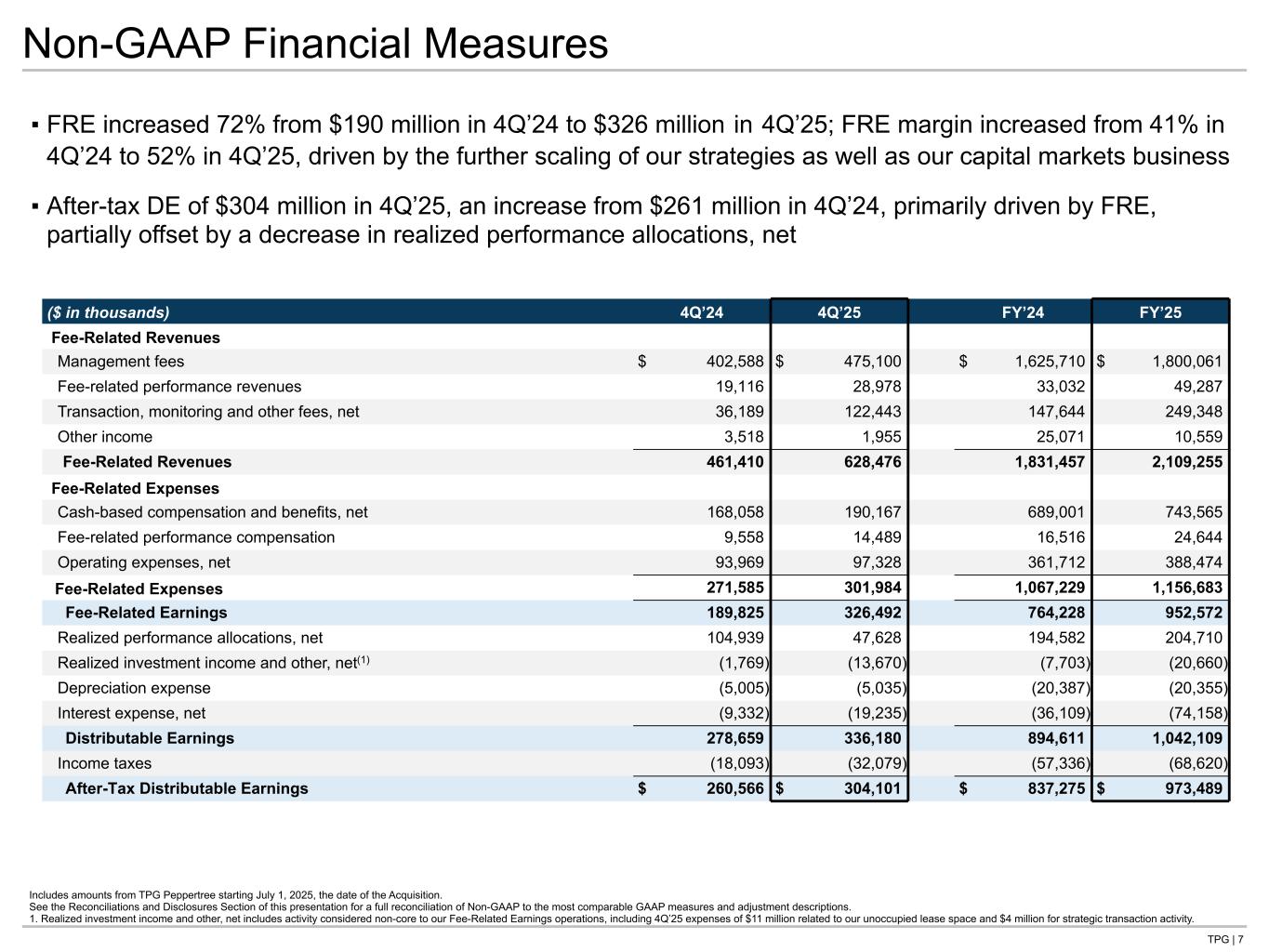 TPG | 6 Operating Metrics ($B) Non-GAAP Financial Measures ($M) Fourth Quarter and Full Year Highlights 4Q’24 4Q’25 FY’24 FY’25 Fee-Related Revenues (“FRR”) $461 $628 $1,831 $2,109 Fee-Related Earnings (“FRE”) 190 326 764 953 Realized Performance Allocations, Net 105 48 195 205 After-Tax Distributable Earnings (“After-tax DE”) 261 304 837 973 4Q’24 3Q’25 4Q’25 Assets Under Management (“AUM”) $245.9 $286.4 $303.0 Fee-Earning Assets Under Management (“FAUM”) 141.3 163.0 170.1 Net Accrued Performance 1.0 1.2 1.3 Available Capital 57.6 72.9 72.4 4Q’24 4Q’25 FY’24 FY’25 Capital Raised $8.8 $16.2 $30.1 $51.5 Capital Invested 10.3 19.3 32.9 51.9 Realizations 7.1 4.8 22.9 23.4 ▪ 4Q’25 FRR of $628 million increased 36% versus 4Q’24, with 4Q’25 FRE and After-tax DE of $326 million and $304 million, respectively ▪ Total AUM of $303 billion, up 23% in the last twelve months; FAUM of $170 billion, up 20% over the same period Includes amounts from TPG Peppertree starting July 1, 2025, the date of the Acquisition. See the Reconciliations and Disclosures Section of this presentation for a full reconciliation of Non-GAAP to the most comparable GAAP measures and adjustment descriptions. Tie to next page Tie to OM section