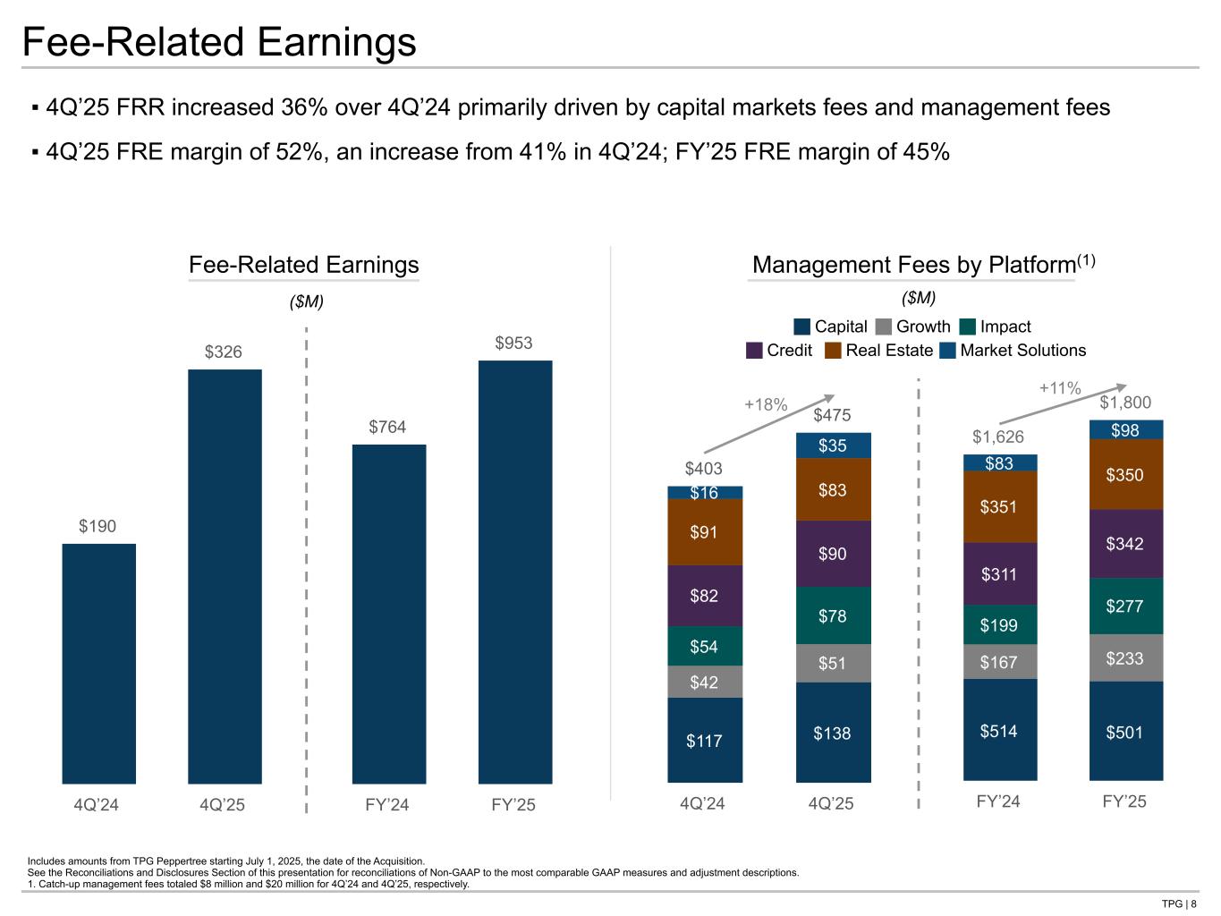 TPG | 7 Non-GAAP Financial Measures ▪ FRE increased 72% from $190 million in 4Q’24 to $326 million in 4Q’25; FRE margin increased from 41% in 4Q’24 to 52% in 4Q’25, driven by the further scaling of our strategies as well as our capital markets business ▪ After-tax DE of $304 million in 4Q’25, an increase from $261 million in 4Q’24, primarily driven by FRE, partially offset by a decrease in realized performance allocations, net Includes amounts from TPG Peppertree starting July 1, 2025, the date of the Acquisition. See the Reconciliations and Disclosures Section of this presentation for a full reconciliation of Non-GAAP to the most comparable GAAP measures and adjustment descriptions. 1. Realized investment income and other, net includes activity considered non-core to our Fee-Related Earnings operations, including 4Q’25 expenses of $11 million related to our unoccupied lease space and $4 million for strategic transaction activity. ($ in thousands) 4Q’24 4Q’25 FY’24 FY’25 Fee-Related Revenues Management fees $ 402,588 $ 475,100 $ 1,625,710 $ 1,800,061 Fee-related performance revenues 19,116 28,978 33,032 49,287 Transaction, monitoring and other fees, net 36,189 122,443 147,644 249,348 Other income 3,518 1,955 25,071 10,559 Fee-Related Revenues 461,410 628,476 1,831,457 2,109,255 Fee-Related Expenses Cash-based compensation and benefits, net 168,058 190,167 689,001 743,565 Fee-related performance compensation 9,558 14,489 16,516 24,644 Operating expenses, net 93,969 97,328 361,712 388,474 Fee-Related Expenses 271,585 301,984 1,067,229 1,156,683 Fee-Related Earnings 189,825 326,492 764,228 952,572 Realized performance allocations, net 104,939 47,628 194,582 204,710 Realized investment income and other, net(1) (1,769) (13,670) (7,703) (20,660) Depreciation expense (5,005) (5,035) (20,387) (20,355) Interest expense, net (9,332) (19,235) (36,109) (74,158) Distributable Earnings 278,659 336,180 894,611 1,042,109 Income taxes (18,093) (32,079) (57,336) (68,620) After-Tax Distributable Earnings $ 260,566 $ 304,101 $ 837,275 $ 973,489 Tie to: -prior page -qtrly statement in back -G-NG qtrly statment in back
