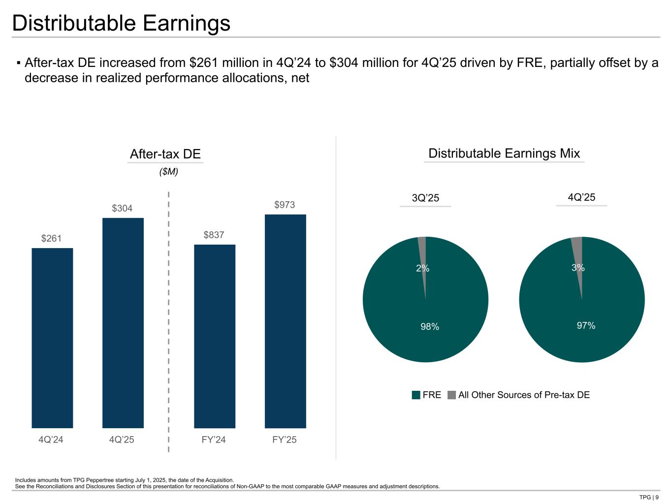 TPG | 8 $1,626 $1,800 $514 $501 $167 $233 $199 $277 $311 $342 $351 $350 $83 $98 FY’24 FY’25 $190 $326 4Q’24 4Q’25 $764 $953 FY’24 FY’25 $403 $475 $117 $138 $42 $51 $54 $78 $82 $90 $91 $83$16 $35 4Q’24 4Q’25 ▪ 4Q’25 FRR increased 36% over 4Q’24 primarily driven by capital markets fees and management fees ▪ 4Q’25 FRE margin of 52%, an increase from 41% in 4Q’24; FY’25 FRE margin of 45% Includes amounts from TPG Peppertree starting July 1, 2025, the date of the Acquisition. See the Reconciliations and Disclosures Section of this presentation for reconciliations of Non-GAAP to the most comparable GAAP measures and adjustment descriptions. 1. Catch-up management fees totaled $8 million and $20 million for 4Q’24 and 4Q’25, respectively. Fee-Related Earnings Management Fees by Platform(1) ($M) ($M) +18% Capital Growth Impact +11% Credit Real Estate Market Solutions Fee-Related Earnings