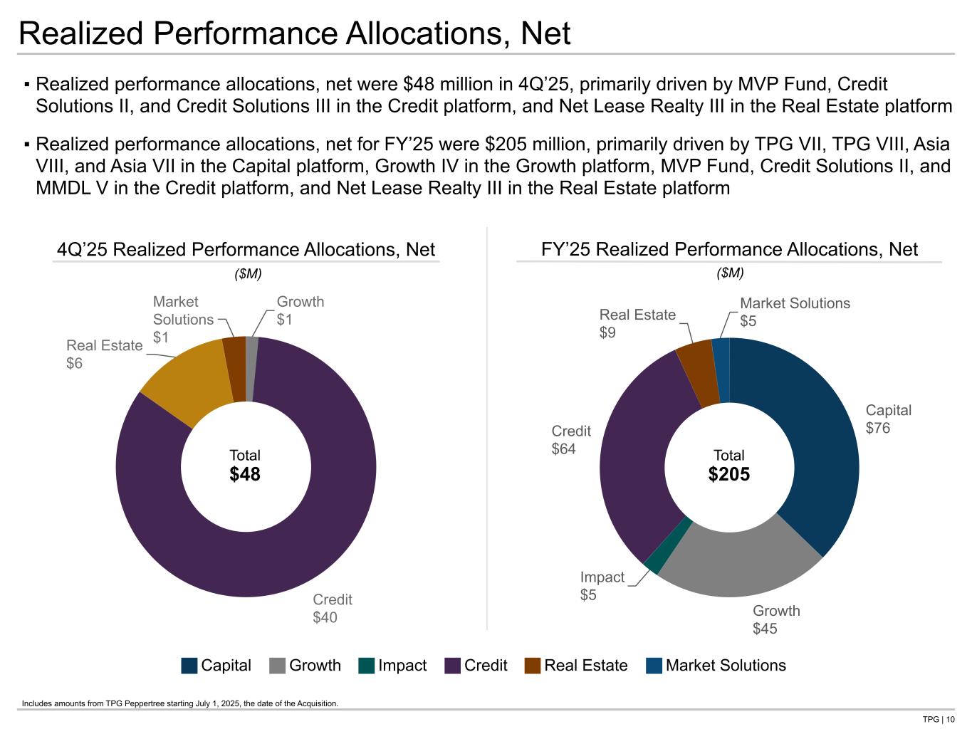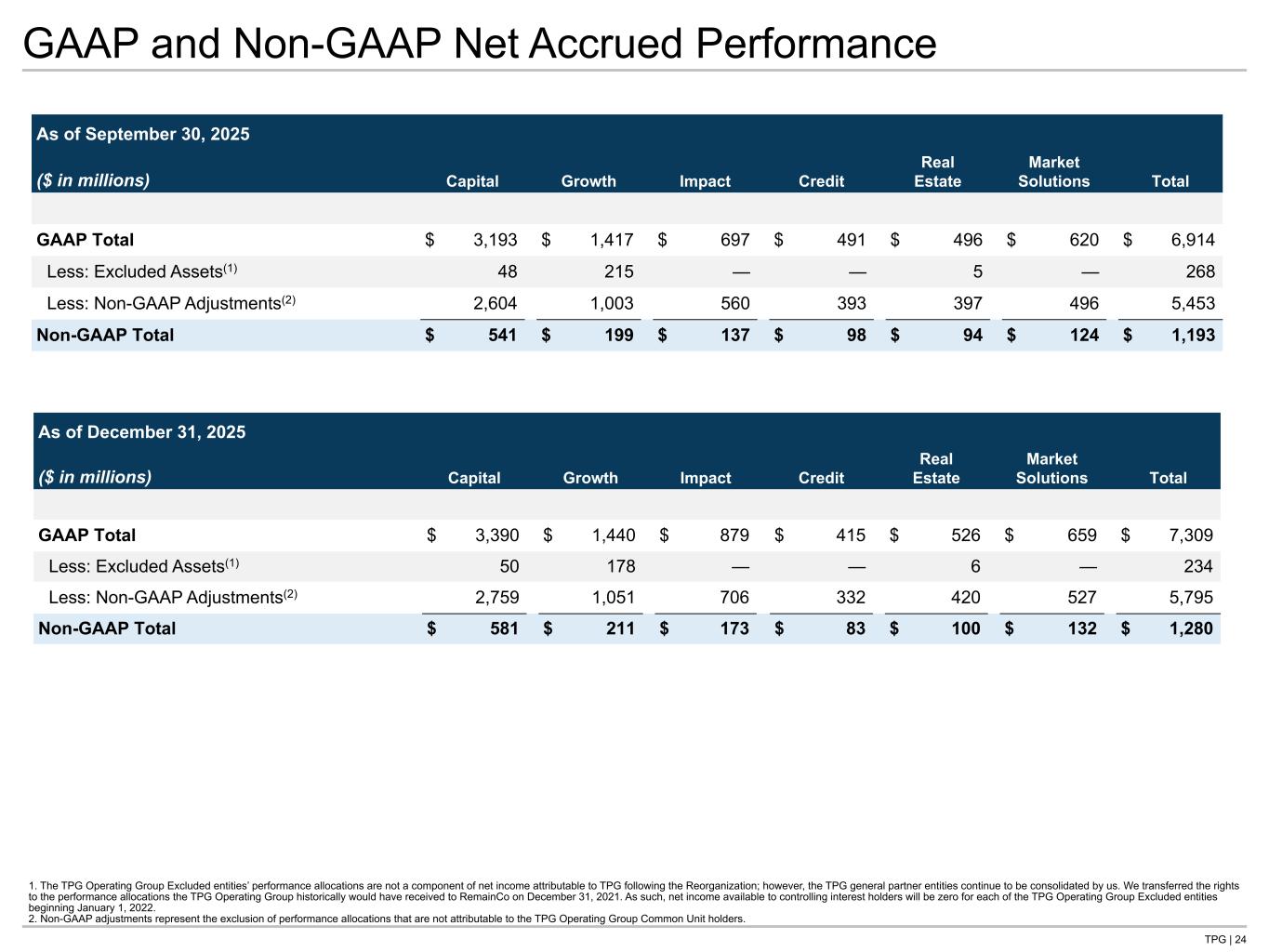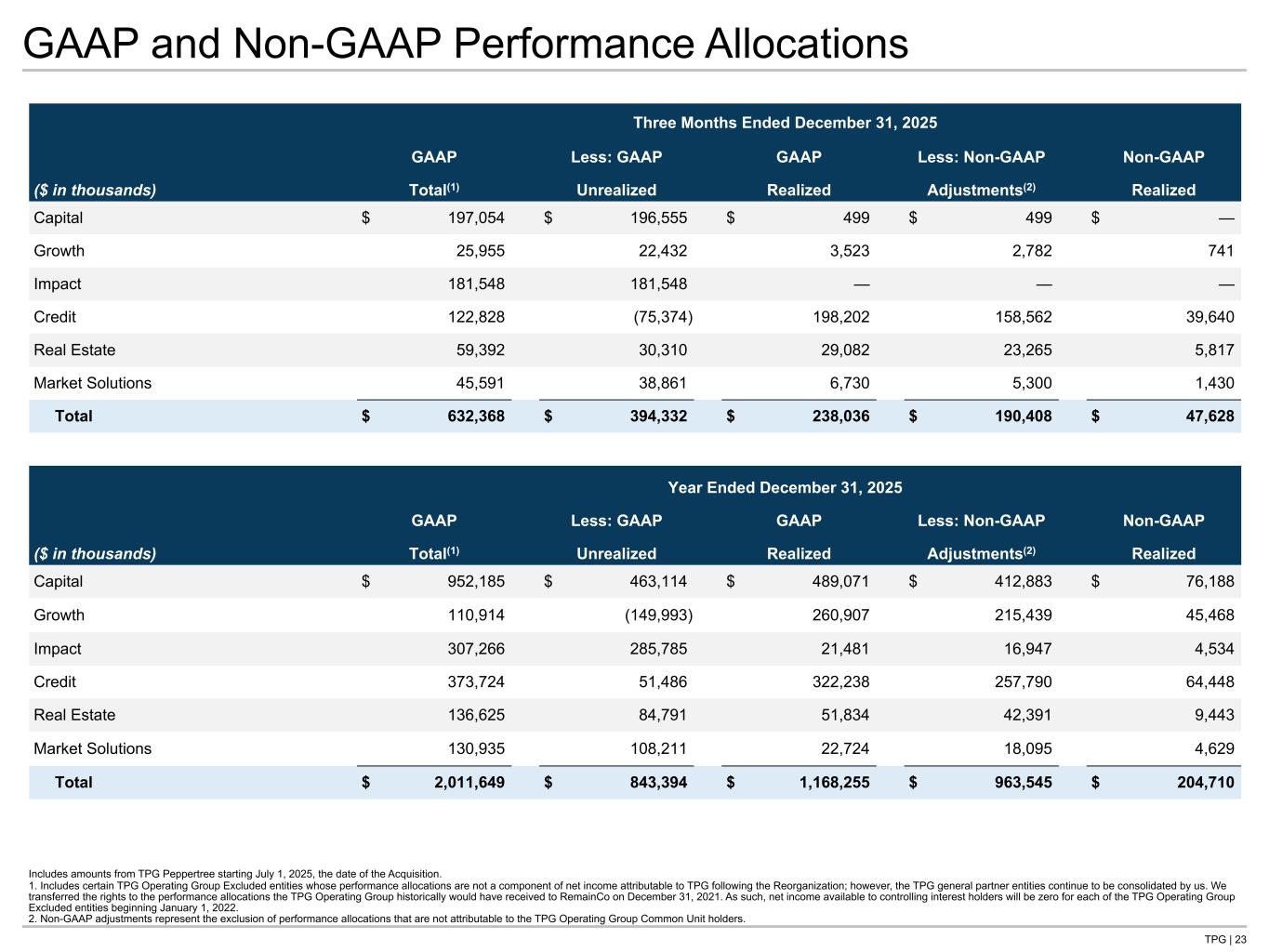 TPG | 23 GAAP and Non-GAAP Performance Allocations Includes amounts from TPG Peppertree starting July 1, 2025, the date of the Acquisition. 1. Includes certain TPG Operating Group Excluded entities whose performance allocations are not a component of net income attributable to TPG following the Reorganization; however, the TPG general partner entities continue to be consolidated by us. We transferred the rights to the performance allocations the TPG Operating Group historically would have received to RemainCo on December 31, 2021. As such, net income available to controlling interest holders will be zero for each of the TPG Operating Group Excluded entities beginning January 1, 2022. 2. Non-GAAP adjustments represent the exclusion of performance allocations that are not attributable to the TPG Operating Group Common Unit holders. Three Months Ended December 31, 2025 GAAP Less: GAAP GAAP Less: Non-GAAP Non-GAAP ($ in thousands) Total(1) Unrealized Realized Adjustments(2) Realized Capital $ 197,054 $ 196,555 $ 499 $ 499 $ — Growth 25,955 22,432 3,523 2,782 741 Impact 181,548 181,548 — — — Credit 122,828 (75,374) 198,202 158,562 39,640 Real Estate 59,392 30,310 29,082 23,265 5,817 Market Solutions 45,591 38,861 6,730 5,300 1,430 Total $ 632,368 $ 394,332 $ 238,036 $ 190,408 $ 47,628 Year Ended December 31, 2025 GAAP Less: GAAP GAAP Less: Non-GAAP Non-GAAP ($ in thousands) Total(1) Unrealized Realized Adjustments(2) Realized Capital $ 952,185 $ 463,114 $ 489,071 $ 412,883 $ 76,188 Growth 110,914 (149,993) 260,907 215,439 45,468 Impact 307,266 285,785 21,481 16,947 4,534 Credit 373,724 51,486 322,238 257,790 64,448 Real Estate 136,625 84,791 51,834 42,391 9,443 Market Solutions 130,935 108,211 22,724 18,095 4,629 Total $ 2,011,649 $ 843,394 $ 1,168,255 $ 963,545 $ 204,710 Tie to NG P&L