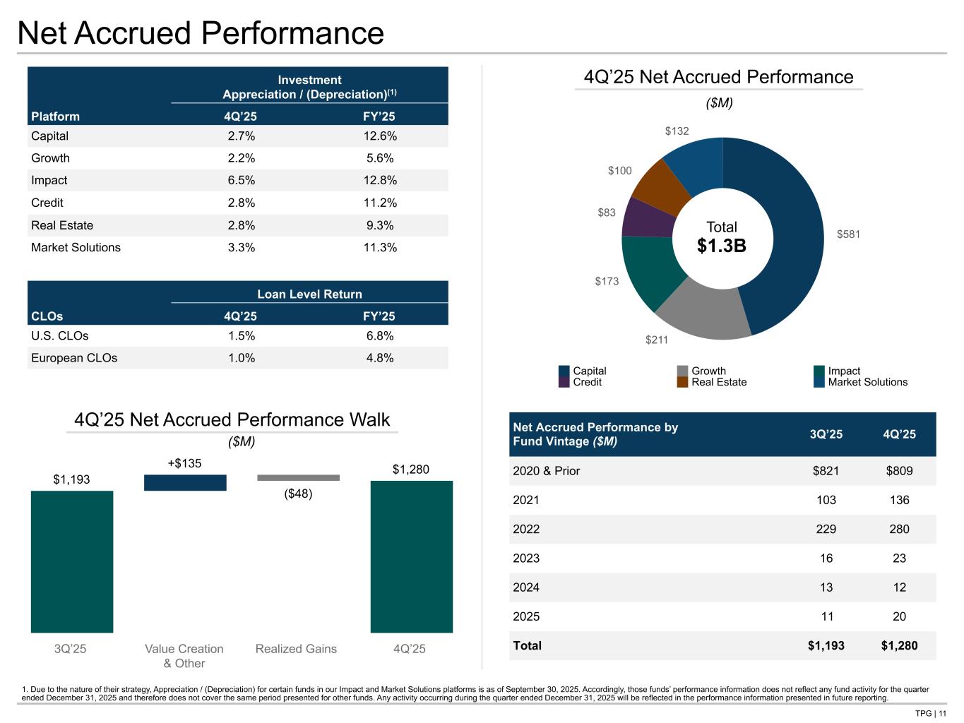 TPG | 10 Capital $76 Growth $45 Impact $5 Credit $64 Real Estate $9 Market Solutions $5 FY’25 Realized Performance Allocations, Net Growth $1 Credit $40 Real Estate $6 Market Solutions $1 ▪ Realized performance allocations, net were $48 million in 4Q’25, primarily driven by MVP Fund, Credit Solutions II, and Credit Solutions III in the Credit platform, and Net Lease Realty III in the Real Estate platform ▪ Realized performance allocations, net for FY’25 were $205 million, primarily driven by TPG VII, TPG VIII, Asia VIII, and Asia VII in the Capital platform, Growth IV in the Growth platform, MVP Fund, Credit Solutions II, and MMDL V in the Credit platform, and Net Lease Realty III in the Real Estate platform Realized Performance Allocations, Net 4Q’25 Realized Performance Allocations, Net ($M) ($M) Total $205 Total $48 Capital Growth Impact Credit Real Estate Market Solutions Includes amounts from TPG Peppertree starting July 1, 2025, the date of the Acquisition.