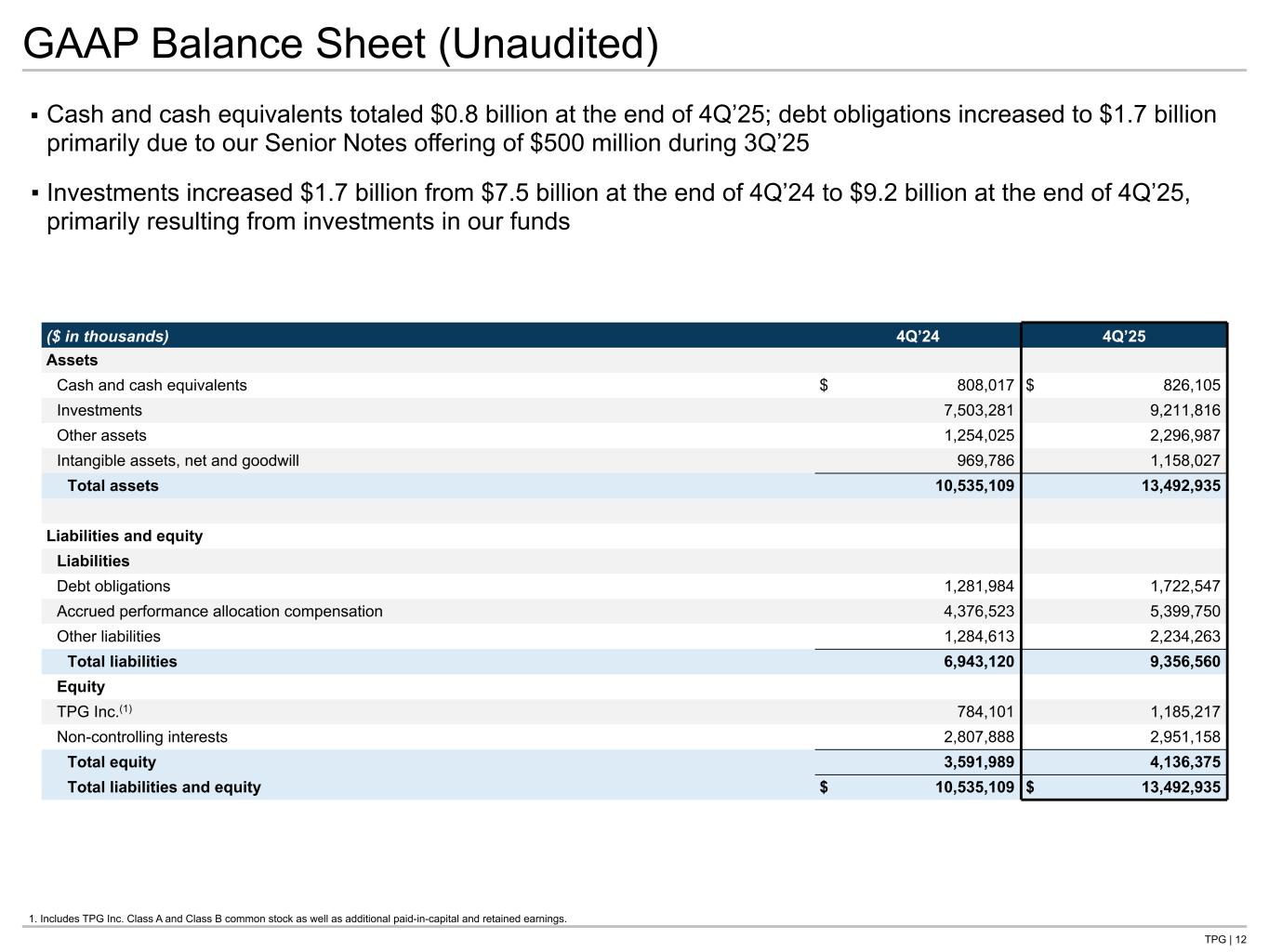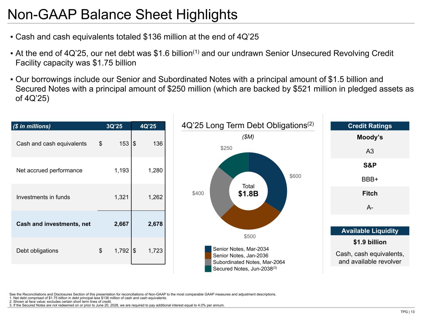 TPG | 12 GAAP Balance Sheet (Unaudited) ▪ Cash and cash equivalents totaled $0.8 billion at the end of 4Q’25; debt obligations increased to $1.7 billion primarily due to our Senior Notes offering of $500 million during 3Q’25 ▪ Investments increased $1.7 billion from $7.5 billion at the end of 4Q’24 to $9.2 billion at the end of 4Q’25, primarily resulting from investments in our funds 1. Includes TPG Inc. Class A and Class B common stock as well as additional paid-in-capital and retained earnings. ($ in thousands) 4Q’24 4Q’25 Assets Cash and cash equivalents $ 808,017 $ 826,105 Investments 7,503,281 9,211,816 Other assets 1,254,025 2,296,987 Intangible assets, net and goodwill 969,786 1,158,027 Total assets 10,535,109 13,492,935 Liabilities and equity Liabilities Debt obligations 1,281,984 1,722,547 Accrued performance allocation compensation 4,376,523 5,399,750 Other liabilities 1,284,613 2,234,263 Total liabilities 6,943,120 9,356,560 Equity TPG Inc.(1) 784,101 1,185,217 Non-controlling interests 2,807,888 2,951,158 Total equity 3,591,989 4,136,375 Total liabilities and equity $ 10,535,109 $ 13,492,935 Tie to B/S G- NG in back