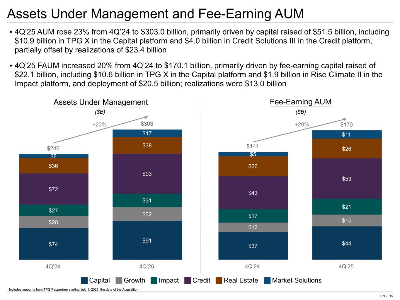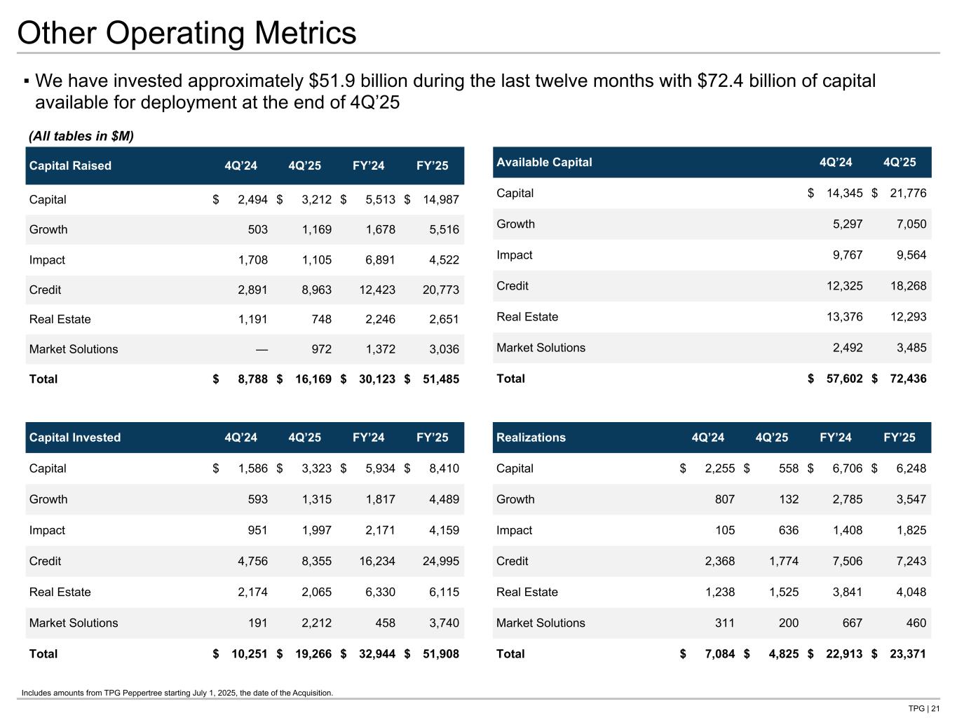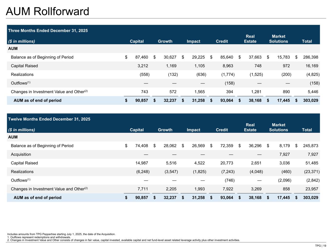 TPG | 20 FAUM Rollforward Three Months Ended December 31, 2025 ($ in millions) Capital Growth Impact Credit Real Estate Market Solutions Total FAUM Balance as of Beginning of Period $ 44,468 $ 14,952 $ 19,574 $ 47,591 $ 26,644 $ 9,820 $ 163,049 Fee-Earning Capital Raised(1) 1,730 144 740 1,871 — 819 5,304 Deployment(2) 1,442 361 358 5,162 325 573 8,222 Realizations(3) — (163) (37) (2,119) (800) (24) (3,144) Reduction in Fee Base(4) (3,167) — — — (97) (495) (3,759) Outflows(5) — — — (158) — — (158) Market Activity and Other(6) — — — 425 (4) 166 586 FAUM as of end of period $ 44,474 $ 15,294 $ 20,635 $ 52,772 $ 26,068 $ 10,859 $ 170,102 Twelve Months Ended December 31, 2025 ($ in millions) Capital Growth Impact Credit Real Estate Market Solutions Total FAUM Balance as of Beginning of Period $ 37,075 $ 12,334 $ 17,357 $ 43,005 $ 26,138 $ 5,377 $ 141,286 Acquisition — — — — — 4,458 4,458 Fee-Earning Capital Raised(1) 10,558 2,513 2,819 2,983 508 2,719 22,099 Deployment(2) 1,481 1,642 890 14,380 1,501 624 20,517 Realizations(3) (544) (1,196) (431) (8,490) (2,232) (113) (13,008) Reduction in Fee Base(4) (4,106) — — (99) (369) (495) (5,070) Outflows(5) — — — (743) — (1,729) (2,472) Market Activity and Other(6) 11 1 — 1,736 523 19 2,292 FAUM as of end of period $ 44,474 $ 15,294 $ 20,635 $ 52,772 $ 26,068 $ 10,859 $ 170,102 Includes amounts from TPG Peppertree starting July 1, 2025, the date of the Acquisition. 1. Fee-Earning Capital Raised represents capital raised by our funds for which management fees calculated based on commitments or subscriptions were activated during the period. 2. Deployment represents increases in investment cost and CLO collateral assets, as well as capital called for investments. 3. Realizations represent decreases in investment cost and CLO collateral assets, as well as distributions of investment related proceeds. 4. Reduction in Fee Base represents decreases in the fee basis for funds where the investment or commitment fee period has expired, and the fee base has reduced from commitment base to actively invested capital. It also includes reductions for funds that are no longer fee paying. 5. Outflows represent redemptions and withdrawals. 6. Market Activity and Other represents income activity for our funds for which management fees are calculated based on invested net capital or net asset value, as well as foreign exchange fluctuations.