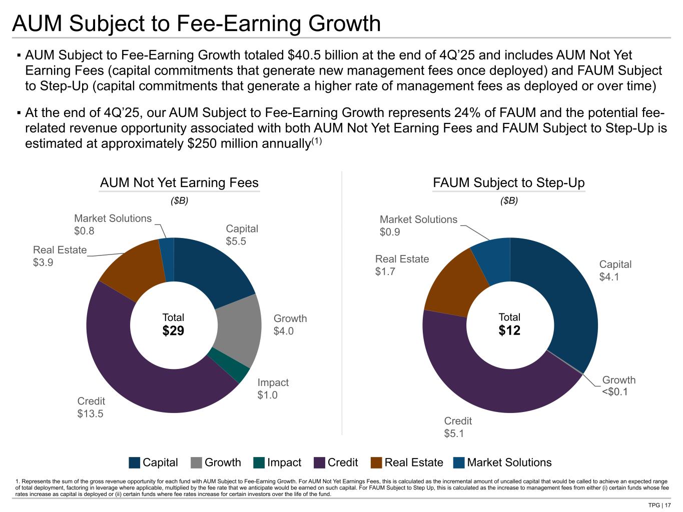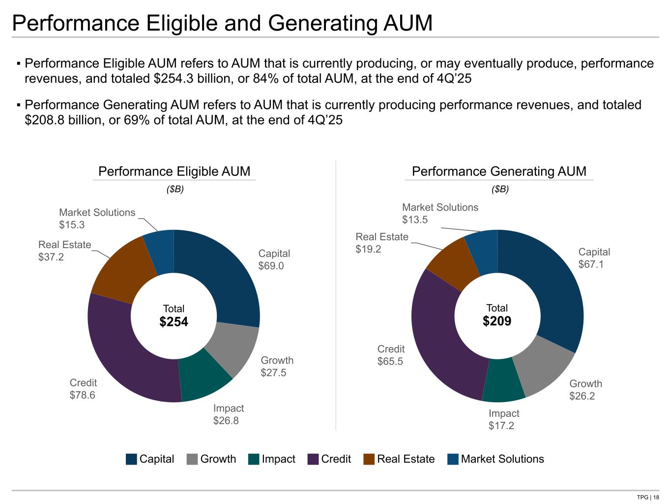 TPG | 17 Capital $4.1 Growth $0.0 Credit $5.1 Real Estate $1.7 Market Solutions $0.9Capital $5.5 Growth $4.0 Impact $1.0Credit $13.5 Real Estate $3.9 Market Solutions $0.8 ▪ AUM Subject to Fee-Earning Growth totaled $40.5 billion at the end of 4Q’25 and includes AUM Not Yet Earning Fees (capital commitments that generate new management fees once deployed) and FAUM Subject to Step-Up (capital commitments that generate a higher rate of management fees as deployed or over time) ▪ At the end of 4Q’25, our AUM Subject to Fee-Earning Growth represents 24% of FAUM and the potential fee- related revenue opportunity associated with both AUM Not Yet Earning Fees and FAUM Subject to Step-Up is estimated at approximately $250 million annually(1) AUM Not Yet Earning Fees FAUM Subject to Step-Up ($B) ($B) Total $29 Total $12 AUM Subject to Fee-Earning Growth 1. Represents the sum of the gross revenue opportunity for each fund with AUM Subject to Fee-Earning Growth. For AUM Not Yet Earnings Fees, this is calculated as the incremental amount of uncalled capital that would be called to achieve an expected range of total deployment, factoring in leverage where applicable, multiplied by the fee rate that we anticipate would be earned on such capital. For FAUM Subject to Step Up, this is calculated as the increase to management fees from either (i) certain funds whose fee rates increase as capital is deployed or (ii) certain funds where fee rates increase for certain investors over the life of the fund. Capital Growth Impact Credit Real Estate Market Solutions <$0.1