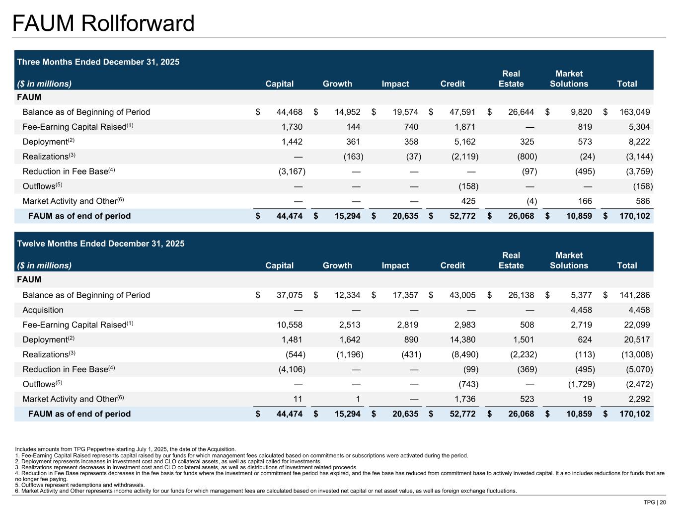 TPG | 19 AUM Rollforward Three Months Ended December 31, 2025 ($ in millions) Capital Growth Impact Credit Real Estate Market Solutions Total AUM Balance as of Beginning of Period $ 87,460 $ 30,627 $ 29,225 $ 85,640 $ 37,663 $ 15,783 $ 286,398 Capital Raised 3,212 1,169 1,105 8,963 748 972 16,169 Realizations (558) (132) (636) (1,774) (1,525) (200) (4,825) Outflows(1) — — — (158) — — (158) Changes in Investment Value and Other(2) 743 572 1,565 394 1,281 890 5,446 AUM as of end of period $ 90,857 $ 32,237 $ 31,258 $ 93,064 $ 38,168 $ 17,445 $ 303,029 Twelve Months Ended December 31, 2025 ($ in millions) Capital Growth Impact Credit Real Estate Market Solutions Total AUM Balance as of Beginning of Period $ 74,408 $ 28,062 $ 26,569 $ 72,359 $ 36,296 $ 8,179 $ 245,873 Acquisition — — — — — 7,927 7,927 Capital Raised 14,987 5,516 4,522 20,773 2,651 3,036 51,485 Realizations (6,248) (3,547) (1,825) (7,243) (4,048) (460) (23,371) Outflows(1) — — — (746) — (2,096) (2,842) Changes in Investment Value and Other(2) 7,711 2,205 1,993 7,922 3,269 858 23,957 AUM as of end of period $ 90,857 $ 32,237 $ 31,258 $ 93,064 $ 38,168 $ 17,445 $ 303,029 Includes amounts from TPG Peppertree starting July 1, 2025, the date of the Acquisition. 1. Outflows represent redemptions and withdrawals. 2. Changes in Investment Value and Other consists of changes in fair value, capital invested, available capital and net fund-level asset related leverage activity plus other investment activities. Tie to 4sq page