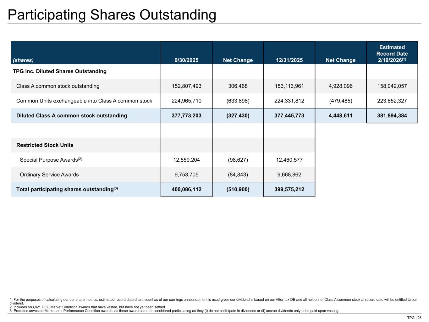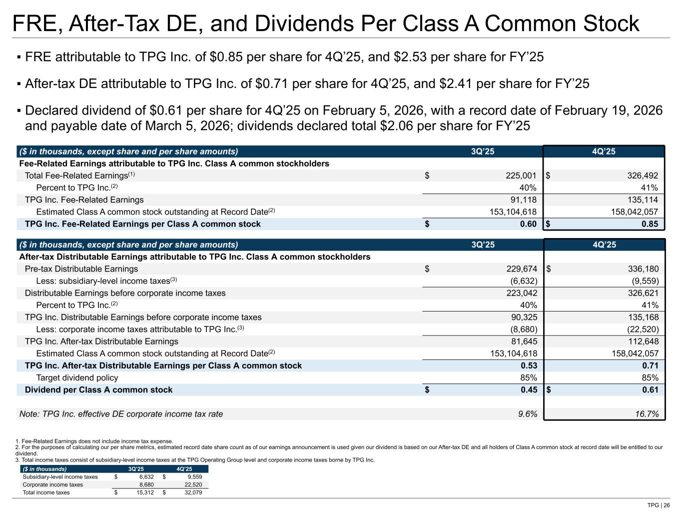 TPG | 25 Participating Shares Outstanding (shares) 9/30/2025 Net Change 12/31/2025 Net Change Estimated Record Date 2/19/2026(1) TPG Inc. Diluted Shares Outstanding Class A common stock outstanding 152,807,493 306,468 153,113,961 4,928,096 158,042,057 Common Units exchangeable into Class A common stock 224,965,710 (633,898) 224,331,812 (479,485) 223,852,327 Diluted Class A common stock outstanding 377,773,203 (327,430) 377,445,773 4,448,611 381,894,384 Restricted Stock Units Special Purpose Awards(2) 12,559,204 (98,627) 12,460,577 Ordinary Service Awards 9,753,705 (84,843) 9,668,862 Total participating shares outstanding(3) 400,086,112 (510,900) 399,575,212 1. For the purposes of calculating our per share metrics, estimated record date share count as of our earnings announcement is used given our dividend is based on our After-tax DE and all holders of Class A common stock at record date will be entitled to our dividend. 2. Includes 583,821 CEO Market Condition awards that have vested, but have not yet been settled. 3. Excludes unvested Market and Performance Condition awards, as these awards are not considered participating as they (i) do not participate in dividends or (ii) accrue dividends only to be paid upon vesting. Tie to Dividends page