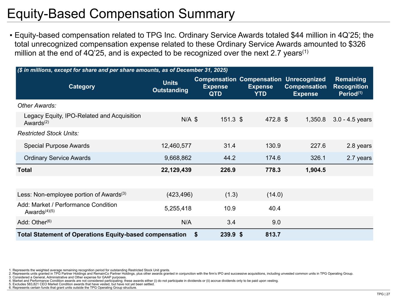 TPG | 27 Equity-Based Compensation Summary ($ in millions, except for share and per share amounts, as of December 31, 2025) Category Units Outstanding Compensation Expense QTD Compensation Expense YTD Unrecognized Compensation Expense Remaining Recognition Period(1) Other Awards: Legacy Equity, IPO-Related and Acquisition Awards(2) N/A $ 151.3 $ 472.8 $ 1,350.8 3.0 - 4.5 years Restricted Stock Units: Special Purpose Awards 12,460,577 31.4 130.9 227.6 2.8 years Ordinary Service Awards 9,668,862 44.2 174.6 326.1 2.7 years Total 22,129,439 226.9 778.3 1,904.5 Less: Non-employee portion of Awards(3) (423,496) (1.3) (14.0) Add: Market / Performance Condition Awards(4)(5) 5,255,418 10.9 40.4 Add: Other(6) N/A 3.4 9.0 Total Statement of Operations Equity-based compensation $ 239.9 $ 813.7 1. Represents the weighted average remaining recognition period for outstanding Restricted Stock Unit grants. 2. Represents units granted in TPG Partner Holdings and RemainCo Partner Holdings, plus other awards granted in conjunction with the firm’s IPO and successive acquisitions, including unvested common units in TPG Operating Group. 3. Considered a General, Administrative and Other expense for GAAP purposes. 4. Market and Performance Condition awards are not considered participating; these awards either (i) do not participate in dividends or (ii) accrue dividends only to be paid upon vesting. 5. Excludes 583,821 CEO Market Condition awards that have vested, but have not yet been settled. 6. Represents certain funds that grant units outside the TPG Operating Group structure. ▪ Equity-based compensation related to TPG Inc. Ordinary Service Awards totaled $44 million in 4Q’25; the total unrecognized compensation expense related to these Ordinary Service Awards amounted to $326 million at the end of 4Q’25, and is expected to be recognized over the next 2.7 years(1) Tie to: -Share roll for RSU awards -G P&L for total EBC