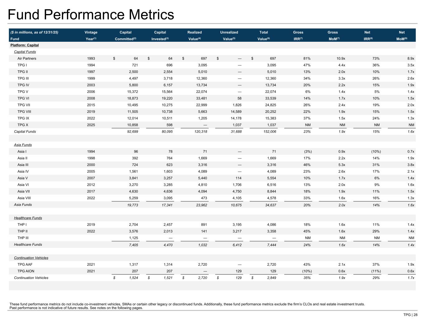 TPG | 28 Fund Performance Metrics ($ in millions, as of 12/31/25) Vintage Capital Capital Realized Unrealized Total Gross Gross Net Net Fund Year(1) Committed(2) Invested(3) Value(4) Value(5) Value(6) IRR(7) MoM(7) IRR(8) MoM(9) Platform: Capital Capital Funds Air Partners 1993 $ 64 $ 64 $ 697 $ — $ 697 81% 10.9x 73% 8.9x TPG I 1994 721 696 3,095 — 3,095 47% 4.4x 36% 3.5x TPG II 1997 2,500 2,554 5,010 — 5,010 13% 2.0x 10% 1.7x TPG III 1999 4,497 3,718 12,360 — 12,360 34% 3.3x 26% 2.6x TPG IV 2003 5,800 6,157 13,734 — 13,734 20% 2.2x 15% 1.9x TPG V 2006 15,372 15,564 22,074 — 22,074 6% 1.4x 5% 1.4x TPG VI 2008 18,873 19,220 33,481 58 33,539 14% 1.7x 10% 1.5x TPG VII 2015 10,495 10,275 22,999 1,826 24,825 26% 2.4x 19% 2.0x TPG VIII 2019 11,505 10,738 5,663 14,589 20,252 22% 1.9x 15% 1.5x TPG IX 2022 12,014 10,511 1,205 14,178 15,383 37% 1.5x 24% 1.3x TPG X 2025 10,858 598 — 1,037 1,037 NM NM NM NM Capital Funds 92,699 80,095 120,318 31,688 152,006 23% 1.9x 15% 1.6x Asia Funds Asia I 1994 96 78 71 — 71 (3%) 0.9x (10%) 0.7x Asia II 1998 392 764 1,669 — 1,669 17% 2.2x 14% 1.9x Asia III 2000 724 623 3,316 — 3,316 46% 5.3x 31% 3.8x Asia IV 2005 1,561 1,603 4,089 — 4,089 23% 2.6x 17% 2.1x Asia V 2007 3,841 3,257 5,440 114 5,554 10% 1.7x 6% 1.4x Asia VI 2012 3,270 3,285 4,810 1,706 6,516 13% 2.0x 9% 1.6x Asia VII 2017 4,630 4,636 4,094 4,750 8,844 18% 1.9x 11% 1.5x Asia VIII 2022 5,259 3,095 473 4,105 4,578 33% 1.6x 16% 1.3x Asia Funds 19,773 17,341 23,962 10,675 34,637 20% 2.0x 14% 1.6x Healthcare Funds THP I 2019 2,704 2,457 891 3,195 4,086 18% 1.6x 11% 1.4x THP II 2022 3,576 2,013 141 3,217 3,358 45% 1.6x 29% 1.4x THP III 1,125 — — — — NM NM NM NM Healthcare Funds 7,405 4,470 1,032 6,412 7,444 24% 1.6x 14% 1.4x Continuation Vehicles TPG AAF 2021 1,317 1,314 2,720 — 2,720 43% 2.1x 37% 1.9x TPG AION 2021 207 207 — 129 129 (10%) 0.6x (11%) 0.6x Continuation Vehicles $ 1,524 $ 1,521 $ 2,720 $ 129 $ 2,849 35% 1.9x 29% 1.7x These fund performance metrics do not include co-investment vehicles, SMAs or certain other legacy or discontinued funds. Additionally, these fund performance metrics exclude the firm’s CLOs and real estate investment trusts. Past performance is not indicative of future results. See notes on the following pages.