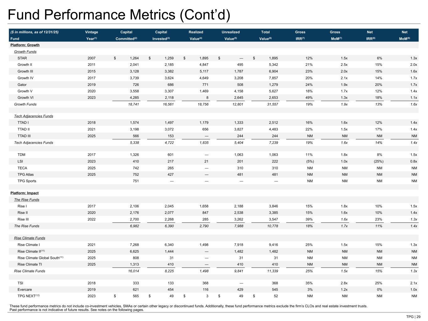 TPG | 29 Fund Performance Metrics (Cont’d) ($ in millions, as of 12/31/25) Vintage Capital Capital Realized Unrealized Total Gross Gross Net Net Fund Year(1) Committed(2) Invested(3) Value(4) Value(5) Value(6) IRR(7) MoM(7) IRR(8) MoM(9) Platform: Growth Growth Funds STAR 2007 $ 1,264 $ 1,259 $ 1,895 $ — $ 1,895 12% 1.5x 6% 1.3x Growth II 2011 2,041 2,185 4,847 495 5,342 21% 2.5x 15% 2.0x Growth III 2015 3,128 3,382 5,117 1,787 6,904 23% 2.0x 15% 1.6x Growth IV 2017 3,739 3,624 4,649 3,208 7,857 20% 2.1x 14% 1.7x Gator 2019 726 686 771 508 1,279 24% 1.9x 20% 1.7x Growth V 2020 3,558 3,307 1,469 4,158 5,627 18% 1.7x 12% 1.4x Growth VI 2023 4,285 2,118 8 2,645 2,653 49% 1.3x 18% 1.1x Growth Funds 18,741 16,561 18,756 12,801 31,557 19% 1.9x 13% 1.6x Tech Adjacencies Funds TTAD I 2018 1,574 1,497 1,179 1,333 2,512 16% 1.6x 12% 1.4x TTAD II 2021 3,198 3,072 656 3,827 4,483 22% 1.5x 17% 1.4x TTAD III 2025 566 153 — 244 244 NM NM NM NM Tech Adjacencies Funds 5,338 4,722 1,835 5,404 7,239 19% 1.6x 14% 1.4x TDM 2017 1,326 601 — 1,063 1,063 11% 1.8x 8% 1.5x LSI 2023 410 217 21 201 222 (5%) 1.0x (25%) 0.8x TECA 2025 742 265 — 310 310 NM NM NM NM TPG Atlas 2025 752 427 — 481 481 NM NM NM NM TPG Sports 751 — — — — NM NM NM NM Platform: Impact The Rise Funds Rise I 2017 2,106 2,045 1,658 2,188 3,846 15% 1.8x 10% 1.5x Rise II 2020 2,176 2,077 847 2,538 3,385 15% 1.6x 10% 1.4x Rise III 2022 2,700 2,268 285 3,262 3,547 39% 1.6x 23% 1.3x The Rise Funds 6,982 6,390 2,790 7,988 10,778 18% 1.7x 11% 1.4x Rise Climate Funds Rise Climate I 2021 7,268 6,340 1,498 7,918 9,416 25% 1.5x 15% 1.3x Rise Climate II(11) 2025 6,625 1,444 — 1,482 1,482 NM NM NM NM Rise Climate Global South(11) 2025 808 31 — 31 31 NM NM NM NM Rise Climate TI 2025 1,313 410 — 410 410 NM NM NM NM Rise Climate Funds 16,014 8,225 1,498 9,841 11,339 25% 1.5x 15% 1.3x TSI 2018 333 133 368 — 368 35% 2.8x 25% 2.1x Evercare 2019 621 454 116 429 545 3% 1.2x 0% 1.0x TPG NEXT(12) 2023 $ 565 $ 49 $ 3 $ 49 $ 52 NM NM NM NM These fund performance metrics do not include co-investment vehicles, SMAs or certain other legacy or discontinued funds. Additionally, these fund performance metrics exclude the firm’s CLOs and real estate investment trusts. Past performance is not indicative of future results. See notes on the following pages.