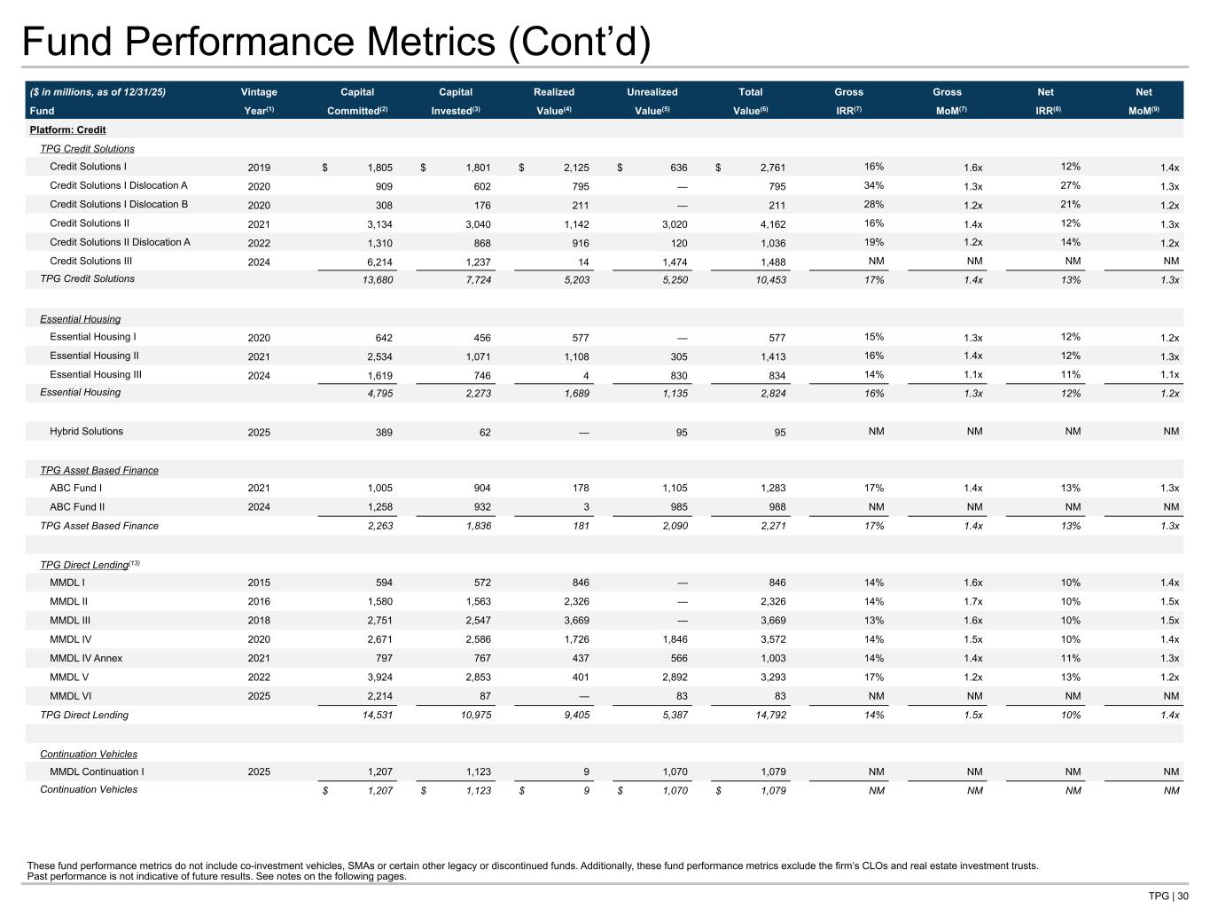 TPG | 30 Fund Performance Metrics (Cont’d) ($ in millions, as of 12/31/25) Vintage Capital Capital Realized Unrealized Total Gross Gross Net Net Fund Year(1) Committed(2) Invested(3) Value(4) Value(5) Value(6) IRR(7) MoM(7) IRR(8) MoM(9) Platform: Credit TPG Credit Solutions Credit Solutions I 2019 $ 1,805 $ 1,801 $ 2,125 $ 636 $ 2,761 16% 1.6x 12% 1.4x Credit Solutions I Dislocation A 2020 909 602 795 — 795 34% 1.3x 27% 1.3x Credit Solutions I Dislocation B 2020 308 176 211 — 211 28% 1.2x 21% 1.2x Credit Solutions II 2021 3,134 3,040 1,142 3,020 4,162 16% 1.4x 12% 1.3x Credit Solutions II Dislocation A 2022 1,310 868 916 120 1,036 19% 1.2x 14% 1.2x Credit Solutions III 2024 6,214 1,237 14 1,474 1,488 NM NM NM NM TPG Credit Solutions 13,680 7,724 5,203 5,250 10,453 17% 1.4x 13% 1.3x Essential Housing Essential Housing I 2020 642 456 577 — 577 15% 1.3x 12% 1.2x Essential Housing II 2021 2,534 1,071 1,108 305 1,413 16% 1.4x 12% 1.3x Essential Housing III 2024 1,619 746 4 830 834 14% 1.1x 11% 1.1x Essential Housing 4,795 2,273 1,689 1,135 2,824 16% 1.3x 12% 1.2x Hybrid Solutions 2025 389 62 — 95 95 NM NM NM NM TPG Asset Based Finance ABC Fund I 2021 1,005 904 178 1,105 1,283 17% 1.4x 13% 1.3x ABC Fund II 2024 1,258 932 3 985 988 NM NM NM NM TPG Asset Based Finance 2,263 1,836 181 2,090 2,271 17% 1.4x 13% 1.3x TPG Direct Lending(13) MMDL I 2015 594 572 846 — 846 14% 1.6x 10% 1.4x MMDL II 2016 1,580 1,563 2,326 — 2,326 14% 1.7x 10% 1.5x MMDL III 2018 2,751 2,547 3,669 — 3,669 13% 1.6x 10% 1.5x MMDL IV 2020 2,671 2,586 1,726 1,846 3,572 14% 1.5x 10% 1.4x MMDL IV Annex 2021 797 767 437 566 1,003 14% 1.4x 11% 1.3x MMDL V 2022 3,924 2,853 401 2,892 3,293 17% 1.2x 13% 1.2x MMDL VI 2025 2,214 87 — 83 83 NM NM NM NM TPG Direct Lending 14,531 10,975 9,405 5,387 14,792 14% 1.5x 10% 1.4x Continuation Vehicles MMDL Continuation I 2025 1,207 1,123 9 1,070 1,079 NM NM NM NM Continuation Vehicles $ 1,207 $ 1,123 $ 9 $ 1,070 $ 1,079 NM NM NM NM These fund performance metrics do not include co-investment vehicles, SMAs or certain other legacy or discontinued funds. Additionally, these fund performance metrics exclude the firm’s CLOs and real estate investment trusts. Past performance is not indicative of future results. See notes on the following pages.