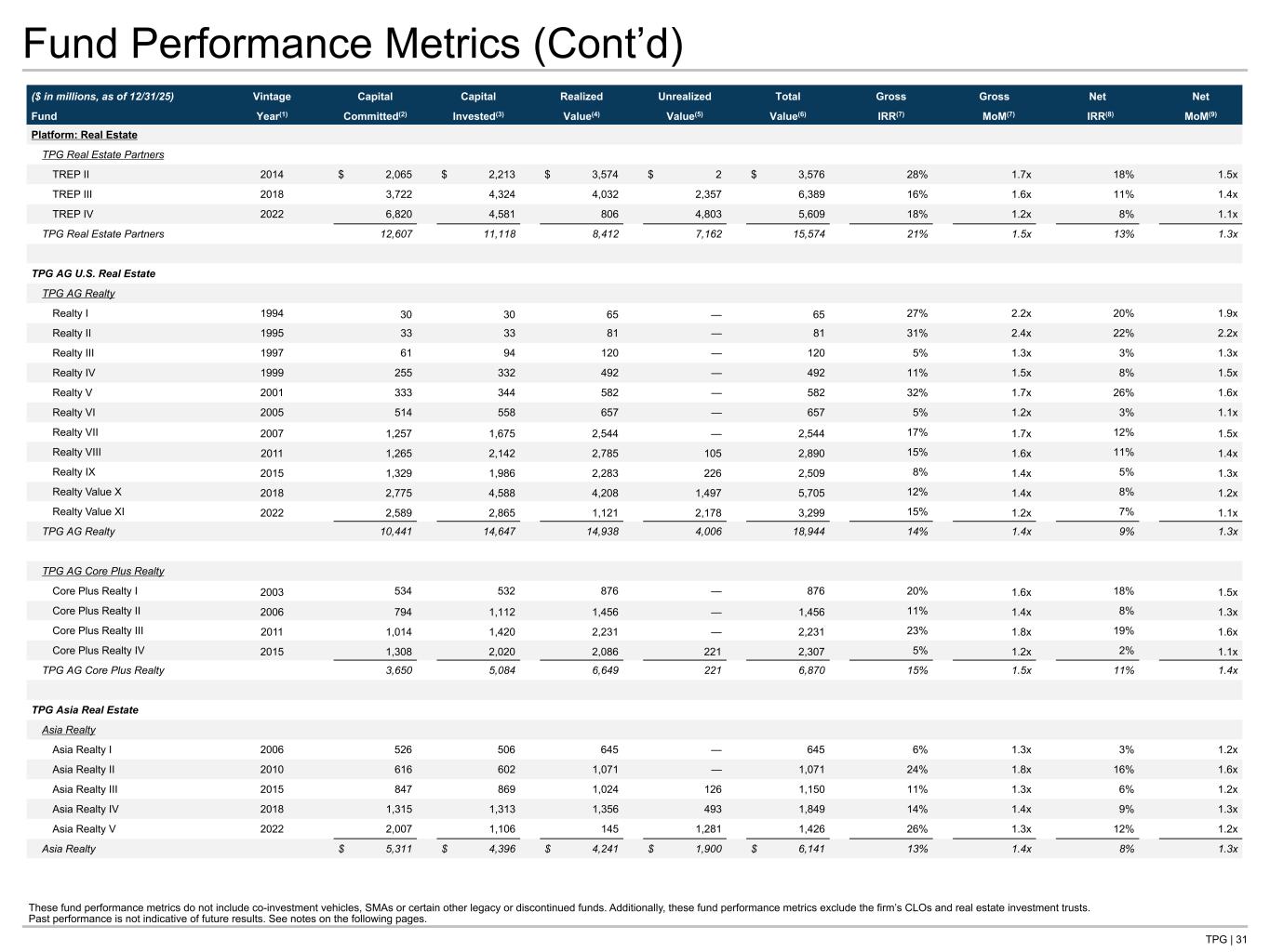 TPG | 31 Fund Performance Metrics (Cont’d) ($ in millions, as of 12/31/25) Vintage Capital Capital Realized Unrealized Total Gross Gross Net Net Fund Year(1) Committed(2) Invested(3) Value(4) Value(5) Value(6) IRR(7) MoM(7) IRR(8) MoM(9) Platform: Real Estate TPG Real Estate Partners TREP II 2014 $ 2,065 $ 2,213 $ 3,574 $ 2 $ 3,576 28% 1.7x 18% 1.5x TREP III 2018 3,722 4,324 4,032 2,357 6,389 16% 1.6x 11% 1.4x TREP IV 2022 6,820 4,581 806 4,803 5,609 18% 1.2x 8% 1.1x TPG Real Estate Partners 12,607 11,118 8,412 7,162 15,574 21% 1.5x 13% 1.3x TPG AG U.S. Real Estate TPG AG Realty Realty I 1994 30 30 65 — 65 27% 2.2x 20% 1.9x Realty II 1995 33 33 81 — 81 31% 2.4x 22% 2.2x Realty III 1997 61 94 120 — 120 5% 1.3x 3% 1.3x Realty IV 1999 255 332 492 — 492 11% 1.5x 8% 1.5x Realty V 2001 333 344 582 — 582 32% 1.7x 26% 1.6x Realty VI 2005 514 558 657 — 657 5% 1.2x 3% 1.1x Realty VII 2007 1,257 1,675 2,544 — 2,544 17% 1.7x 12% 1.5x Realty VIII 2011 1,265 2,142 2,785 105 2,890 15% 1.6x 11% 1.4x Realty IX 2015 1,329 1,986 2,283 226 2,509 8% 1.4x 5% 1.3x Realty Value X 2018 2,775 4,588 4,208 1,497 5,705 12% 1.4x 8% 1.2x Realty Value XI 2022 2,589 2,865 1,121 2,178 3,299 15% 1.2x 7% 1.1x TPG AG Realty 10,441 14,647 14,938 4,006 18,944 14% 1.4x 9% 1.3x TPG AG Core Plus Realty Core Plus Realty I 2003 534 532 876 — 876 20% 1.6x 18% 1.5x Core Plus Realty II 2006 794 1,112 1,456 — 1,456 11% 1.4x 8% 1.3x Core Plus Realty III 2011 1,014 1,420 2,231 — 2,231 23% 1.8x 19% 1.6x Core Plus Realty IV 2015 1,308 2,020 2,086 221 2,307 5% 1.2x 2% 1.1x TPG AG Core Plus Realty 3,650 5,084 6,649 221 6,870 15% 1.5x 11% 1.4x TPG Asia Real Estate Asia Realty Asia Realty I 2006 526 506 645 — 645 6% 1.3x 3% 1.2x Asia Realty II 2010 616 602 1,071 — 1,071 24% 1.8x 16% 1.6x Asia Realty III 2015 847 869 1,024 126 1,150 11% 1.3x 6% 1.2x Asia Realty IV 2018 1,315 1,313 1,356 493 1,849 14% 1.4x 9% 1.3x Asia Realty V 2022 2,007 1,106 145 1,281 1,426 26% 1.3x 12% 1.2x Asia Realty $ 5,311 $ 4,396 $ 4,241 $ 1,900 $ 6,141 13% 1.4x 8% 1.3x These fund performance metrics do not include co-investment vehicles, SMAs or certain other legacy or discontinued funds. Additionally, these fund performance metrics exclude the firm’s CLOs and real estate investment trusts. Past performance is not indicative of future results. See notes on the following pages.
