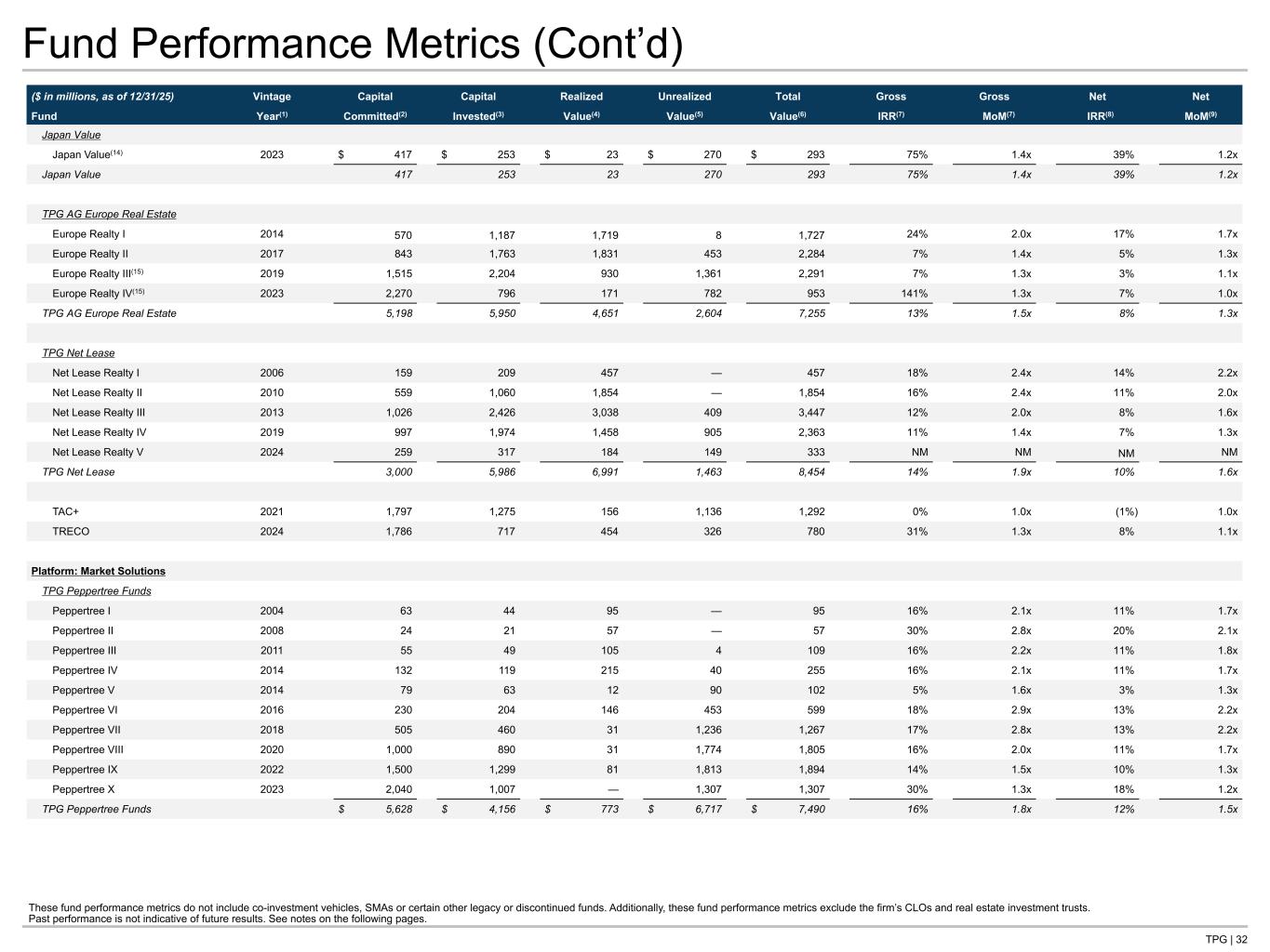 TPG | 32 Fund Performance Metrics (Cont’d) ($ in millions, as of 12/31/25) Vintage Capital Capital Realized Unrealized Total Gross Gross Net Net Fund Year(1) Committed(2) Invested(3) Value(4) Value(5) Value(6) IRR(7) MoM(7) IRR(8) MoM(9) Japan Value Japan Value(14) 2023 $ 417 $ 253 $ 23 $ 270 $ 293 75% 1.4x 39% 1.2x Japan Value 417 253 23 270 293 75% 1.4x 39% 1.2x TPG AG Europe Real Estate Europe Realty I 2014 570 1,187 1,719 8 1,727 24% 2.0x 17% 1.7x Europe Realty II 2017 843 1,763 1,831 453 2,284 7% 1.4x 5% 1.3x Europe Realty III(15) 2019 1,515 2,204 930 1,361 2,291 7% 1.3x 3% 1.1x Europe Realty IV(15) 2023 2,270 796 171 782 953 141% 1.3x 7% 1.0x TPG AG Europe Real Estate 5,198 5,950 4,651 2,604 7,255 13% 1.5x 8% 1.3x TPG Net Lease Net Lease Realty I 2006 159 209 457 — 457 18% 2.4x 14% 2.2x Net Lease Realty II 2010 559 1,060 1,854 — 1,854 16% 2.4x 11% 2.0x Net Lease Realty III 2013 1,026 2,426 3,038 409 3,447 12% 2.0x 8% 1.6x Net Lease Realty IV 2019 997 1,974 1,458 905 2,363 11% 1.4x 7% 1.3x Net Lease Realty V 2024 259 317 184 149 333 NM NM NM NM TPG Net Lease 3,000 5,986 6,991 1,463 8,454 14% 1.9x 10% 1.6x TAC+ 2021 1,797 1,275 156 1,136 1,292 0% 1.0x (1%) 1.0x TRECO 2024 1,786 717 454 326 780 31% 1.3x 8% 1.1x Platform: Market Solutions TPG Peppertree Funds Peppertree I 2004 63 44 95 — 95 16% 2.1x 11% 1.7x Peppertree II 2008 24 21 57 — 57 30% 2.8x 20% 2.1x Peppertree III 2011 55 49 105 4 109 16% 2.2x 11% 1.8x Peppertree IV 2014 132 119 215 40 255 16% 2.1x 11% 1.7x Peppertree V 2014 79 63 12 90 102 5% 1.6x 3% 1.3x Peppertree VI 2016 230 204 146 453 599 18% 2.9x 13% 2.2x Peppertree VII 2018 505 460 31 1,236 1,267 17% 2.8x 13% 2.2x Peppertree VIII 2020 1,000 890 31 1,774 1,805 16% 2.0x 11% 1.7x Peppertree IX 2022 1,500 1,299 81 1,813 1,894 14% 1.5x 10% 1.3x Peppertree X 2023 2,040 1,007 — 1,307 1,307 30% 1.3x 18% 1.2x TPG Peppertree Funds $ 5,628 $ 4,156 $ 773 $ 6,717 $ 7,490 16% 1.8x 12% 1.5x These fund performance metrics do not include co-investment vehicles, SMAs or certain other legacy or discontinued funds. Additionally, these fund performance metrics exclude the firm’s CLOs and real estate investment trusts. Past performance is not indicative of future results. See notes on the following pages.