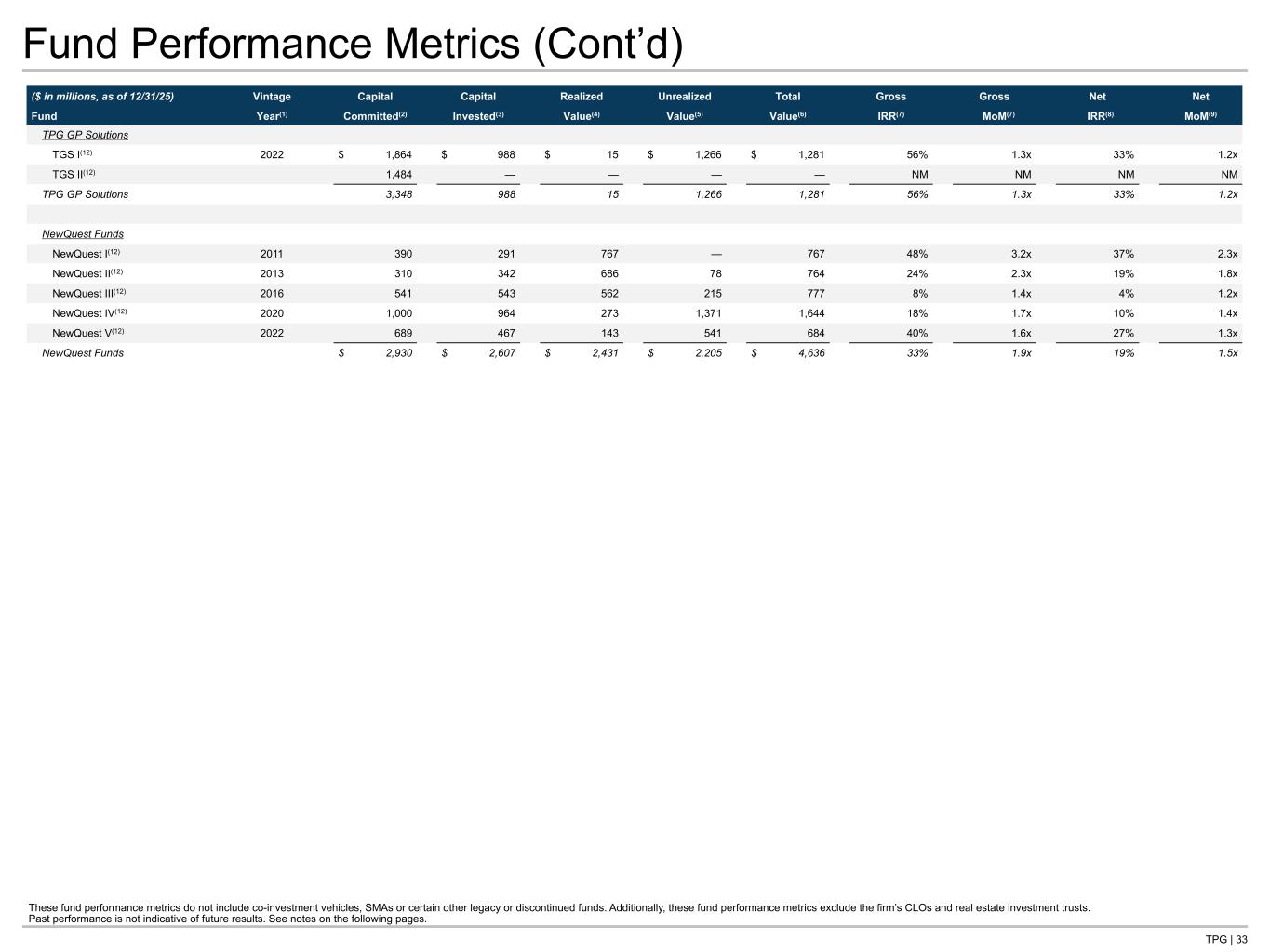 TPG | 33 Fund Performance Metrics (Cont’d) ($ in millions, as of 12/31/25) Vintage Capital Capital Realized Unrealized Total Gross Gross Net Net Fund Year(1) Committed(2) Invested(3) Value(4) Value(5) Value(6) IRR(7) MoM(7) IRR(8) MoM(9) TPG GP Solutions TGS I(12) 2022 $ 1,864 $ 988 $ 15 $ 1,266 $ 1,281 56% 1.3x 33% 1.2x TGS II(12) 1,484 — — — — NM NM NM NM TPG GP Solutions 3,348 988 15 1,266 1,281 56% 1.3x 33% 1.2x NewQuest Funds NewQuest I(12) 2011 390 291 767 — 767 48% 3.2x 37% 2.3x NewQuest II(12) 2013 310 342 686 78 764 24% 2.3x 19% 1.8x NewQuest III(12) 2016 541 543 562 215 777 8% 1.4x 4% 1.2x NewQuest IV(12) 2020 1,000 964 273 1,371 1,644 18% 1.7x 10% 1.4x NewQuest V(12) 2022 689 467 143 541 684 40% 1.6x 27% 1.3x NewQuest Funds $ 2,930 $ 2,607 $ 2,431 $ 2,205 $ 4,636 33% 1.9x 19% 1.5x These fund performance metrics do not include co-investment vehicles, SMAs or certain other legacy or discontinued funds. Additionally, these fund performance metrics exclude the firm’s CLOs and real estate investment trusts. Past performance is not indicative of future results. See notes on the following pages.