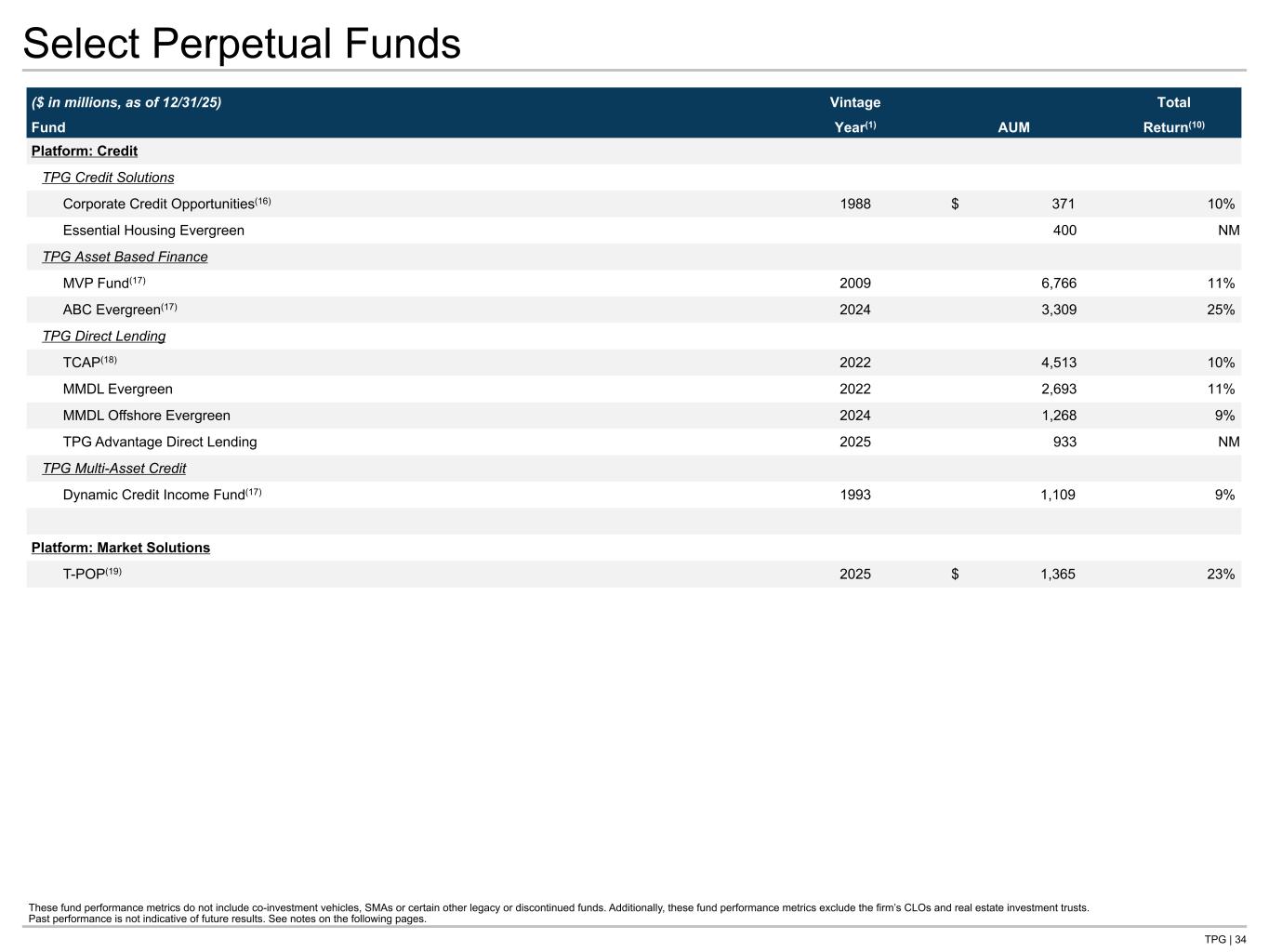 TPG | 34 Select Perpetual Funds ($ in millions, as of 12/31/25) Vintage AUM Total Fund Year(1) Return(10) Platform: Credit TPG Credit Solutions Corporate Credit Opportunities(16) 1988 $ 371 10% Essential Housing Evergreen 400 NM TPG Asset Based Finance MVP Fund(17) 2009 6,766 11% ABC Evergreen(17) 2024 3,309 25% TPG Direct Lending TCAP(18) 2022 4,513 10% MMDL Evergreen 2022 2,693 11% MMDL Offshore Evergreen 2024 1,268 9% TPG Advantage Direct Lending 2025 933 NM TPG Multi-Asset Credit Dynamic Credit Income Fund(17) 1993 1,109 9% Platform: Market Solutions T-POP(19) 2025 $ 1,365 23% These fund performance metrics do not include co-investment vehicles, SMAs or certain other legacy or discontinued funds. Additionally, these fund performance metrics exclude the firm’s CLOs and real estate investment trusts. Past performance is not indicative of future results. See notes on the following pages.