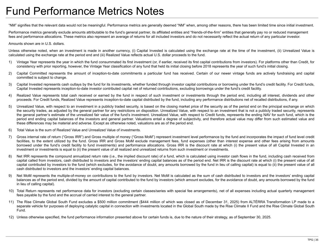 TPG | 35 Fund Performance Metrics Notes “NM” signifies that the relevant data would not be meaningful. Performance metrics are generally deemed “NM” when, among other reasons, there has been limited time since initial investment. Performance metrics generally exclude amounts attributable to the fund’s general partner, its affiliated entities and “friends-of-the-firm” entities that generally pay no or reduced management fees and performance allocations. These metrics also represent an average of returns for all included investors and do not necessarily reflect the actual return of any particular investor. Amounts shown are in U.S. dollars. Unless otherwise noted, when an investment is made in another currency, (i) Capital Invested is calculated using the exchange rate at the time of the investment, (ii) Unrealized Value is calculated using the exchange rate at the period end and (iii) Realized Value reflects actual U.S. dollar proceeds to the fund. 1) Vintage Year represents the year in which the fund consummated its first investment (or, if earlier, received its first capital contributions from investors). For platforms other than Credit, for consistency with prior reporting, however, the Vintage Year classification of any fund that held its initial closing before 2018 represents the year of such fund’s initial closing. 2) Capital Committed represents the amount of inception-to-date commitments a particular fund has received. Certain of our newer vintage funds are actively fundraising and capital committed is subject to change. 3) Capital Invested represents cash outlays by the fund for its investments, whether funded through investor capital contributions or borrowing under the fund’s credit facility. For Credit funds, Capital Invested represents inception-to-date investor contributed capital net of returned contributions, excluding borrowings under the fund’s credit facility. 4) Realized Value represents total cash received or earned by the fund in respect of such investment or investments through the period end, including all interest, dividends and other proceeds. For Credit funds, Realized Value represents inception-to-date capital distributed by the fund, including any performance distributions net of recalled distributions, if any. 5) Unrealized Value, with respect to an investment in a publicly traded security, is based on the closing market price of the security as of the period end on the principal exchange on which the security trades, as adjusted by the general partner for any restrictions on disposition. Unrealized Value, with respect to an investment that is not a publicly traded security, represents the general partner’s estimate of the unrealized fair value of the fund’s investment. Unrealized Value, with respect to Credit funds, represents the ending NAV for such fund, which is the period end ending capital balances of the investors and general partner. Valuations entail a degree of subjectivity, and therefore actual value may differ from such estimated value and these differences may be material and adverse. Except as otherwise noted, valuations are as of the period end. 6) Total Value is the sum of Realized Value and Unrealized Value of investments. 7) Gross internal rate of return (“Gross IRR”) and Gross multiple of money (“Gross MoM”) represent investment level performance by the fund and incorporates the impact of fund level credit facilities, to the extent utilized by the fund. Gross IRR and Gross MoM exclude management fees, fund expenses (other than interest expense and other fees arising from amounts borrowed under the fund’s credit facility to fund investments) and performance allocations. Gross IRR is the discount rate at which (i) the present value of all Capital Invested in an investment or investments is equal to (ii) the present value of all realized and unrealized returns from such investment or investments. 8) Net IRR represents the compound annualized return rate (i.e., the implied discount rate) of a fund, which is calculated using investor cash flows in the fund, including cash received from capital called from investors, cash distributed to investors and the investors’ ending capital balances as of the period end. Net IRR is the discount rate at which (i) the present value of all capital contributed by investors to the fund (which excludes, for the avoidance of doubt, any amounts borrowed by the fund in lieu of calling capital) is equal to (ii) the present value of all cash distributed to investors and the investors’ ending capital balances. 9) Net MoM represents the multiple-of-money on contributions to the fund by investors. Net MoM is calculated as the sum of cash distributed to investors and the investors’ ending capital balances as of the period end, divided by the amount of capital contributed to the fund by investors (which amount excludes, for the avoidance of doubt, any amounts borrowed by the fund in lieu of calling capital). 10) Total Return represents net performance data for investors (excluding certain classes/series with special fee arrangements), net of all expenses including actual quarterly management fees payable by the fund and the accrual of carried interest to the general partner. 11) The Rise Climate Global South Fund excludes a $500 million commitment ($444 million of which was closed as of December 31, 2025) from ALTÉRRA Transformation LP made to a separate vehicle for purposes of deploying catalytic capital in connection with investments located in the Global South made by the Rise Climate II Fund and the Rise Climate Global South Fund. 12) Unless otherwise specified, the fund performance information presented above for certain funds is, due to the nature of their strategy, as of September 30, 2025. Remember to check with PFT/FF on ALTERRA amount