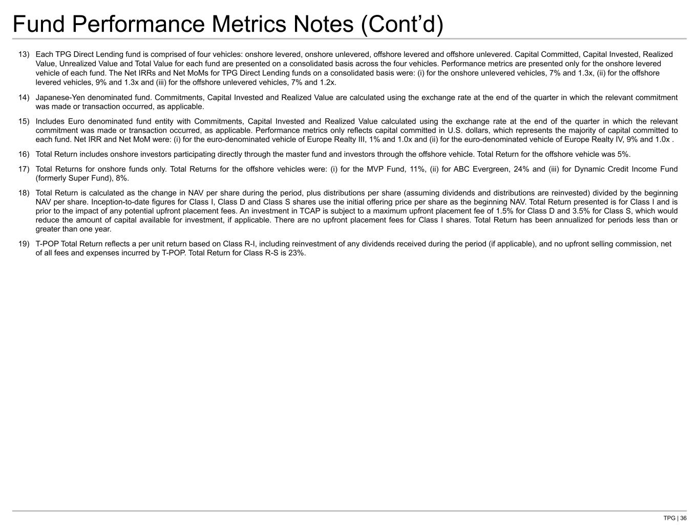 TPG | 36 Fund Performance Metrics Notes (Cont’d) 13) Each TPG Direct Lending fund is comprised of four vehicles: onshore levered, onshore unlevered, offshore levered and offshore unlevered. Capital Committed, Capital Invested, Realized Value, Unrealized Value and Total Value for each fund are presented on a consolidated basis across the four vehicles. Performance metrics are presented only for the onshore levered vehicle of each fund. The Net IRRs and Net MoMs for TPG Direct Lending funds on a consolidated basis were: (i) for the onshore unlevered vehicles, 7% and 1.3x, (ii) for the offshore levered vehicles, 9% and 1.3x and (iii) for the offshore unlevered vehicles, 7% and 1.2x. 14) Japanese-Yen denominated fund. Commitments, Capital Invested and Realized Value are calculated using the exchange rate at the end of the quarter in which the relevant commitment was made or transaction occurred, as applicable. 15) Includes Euro denominated fund entity with Commitments, Capital Invested and Realized Value calculated using the exchange rate at the end of the quarter in which the relevant commitment was made or transaction occurred, as applicable. Performance metrics only reflects capital committed in U.S. dollars, which represents the majority of capital committed to each fund. Net IRR and Net MoM were: (i) for the euro-denominated vehicle of Europe Realty III, 1% and 1.0x and (ii) for the euro-denominated vehicle of Europe Realty IV, 9% and 1.0x . 16) Total Return includes onshore investors participating directly through the master fund and investors through the offshore vehicle. Total Return for the offshore vehicle was 5%. 17) Total Returns for onshore funds only. Total Returns for the offshore vehicles were: (i) for the MVP Fund, 11%, (ii) for ABC Evergreen, 24% and (iii) for Dynamic Credit Income Fund (formerly Super Fund), 8%. 18) Total Return is calculated as the change in NAV per share during the period, plus distributions per share (assuming dividends and distributions are reinvested) divided by the beginning NAV per share. Inception-to-date figures for Class I, Class D and Class S shares use the initial offering price per share as the beginning NAV. Total Return presented is for Class I and is prior to the impact of any potential upfront placement fees. An investment in TCAP is subject to a maximum upfront placement fee of 1.5% for Class D and 3.5% for Class S, which would reduce the amount of capital available for investment, if applicable. There are no upfront placement fees for Class I shares. Total Return has been annualized for periods less than or greater than one year. 19) T-POP Total Return reflects a per unit return based on Class R-I, including reinvestment of any dividends received during the period (if applicable), and no upfront selling commission, net of all fees and expenses incurred by T-POP. Total Return for Class R-S is 23%.