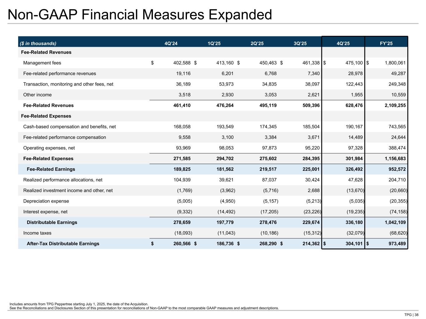 TPG | 38 Non-GAAP Financial Measures Expanded Includes amounts from TPG Peppertree starting July 1, 2025, the date of the Acquisition. See the Reconciliations and Disclosures Section of this presentation for reconciliations of Non-GAAP to the most comparable GAAP measures and adjustment descriptions. ($ in thousands) 4Q’24 1Q’25 2Q’25 3Q’25 4Q’25 FY’25 Fee-Related Revenues Management fees $ 402,588 $ 413,160 $ 450,463 $ 461,338 $ 475,100 $ 1,800,061 Fee-related performance revenues 19,116 6,201 6,768 7,340 28,978 49,287 Transaction, monitoring and other fees, net 36,189 53,973 34,835 38,097 122,443 249,348 Other income 3,518 2,930 3,053 2,621 1,955 10,559 Fee-Related Revenues 461,410 476,264 495,119 509,396 628,476 2,109,255 Fee-Related Expenses Cash-based compensation and benefits, net 168,058 193,549 174,345 185,504 190,167 743,565 Fee-related performance compensation 9,558 3,100 3,384 3,671 14,489 24,644 Operating expenses, net 93,969 98,053 97,873 95,220 97,328 388,474 Fee-Related Expenses 271,585 294,702 275,602 284,395 301,984 1,156,683 Fee-Related Earnings 189,825 181,562 219,517 225,001 326,492 952,572 Realized performance allocations, net 104,939 39,621 87,037 30,424 47,628 204,710 Realized investment income and other, net (1,769) (3,962) (5,716) 2,688 (13,670) (20,660) Depreciation expense (5,005) (4,950) (5,157) (5,213) (5,035) (20,355) Interest expense, net (9,332) (14,492) (17,205) (23,226) (19,235) (74,158) Distributable Earnings 278,659 197,779 278,476 229,674 336,180 1,042,109 Income taxes (18,093) (11,043) (10,186) (15,312) (32,079) (68,620) After-Tax Distributable Earnings $ 260,566 $ 186,736 $ 268,290 $ 214,362 $ 304,101 $ 973,489 Tie to: -NG P&L at front -G-NG qtrly in recon section