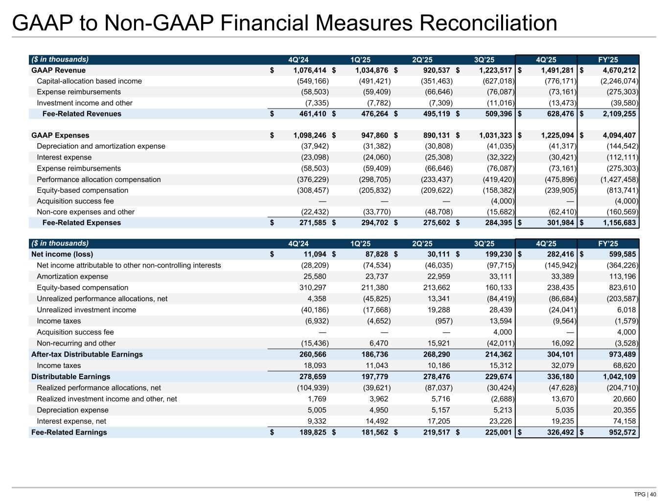 TPG | 40 GAAP to Non-GAAP Financial Measures Reconciliation ($ in thousands) 4Q’24 1Q’25 2Q’25 3Q’25 4Q’25 FY’25 GAAP Revenue $ 1,076,414 $ 1,034,876 $ 920,537 $ 1,223,517 $ 1,491,281 $ 4,670,212 Capital-allocation based income (549,166) (491,421) (351,463) (627,018) (776,171) (2,246,074) Expense reimbursements (58,503) (59,409) (66,646) (76,087) (73,161) (275,303) Investment income and other (7,335) (7,782) (7,309) (11,016) (13,473) (39,580) Fee-Related Revenues $ 461,410 $ 476,264 $ 495,119 $ 509,396 $ 628,476 $ 2,109,255 GAAP Expenses $ 1,098,246 $ 947,860 $ 890,131 $ 1,031,323 $ 1,225,094 $ 4,094,407 Depreciation and amortization expense (37,942) (31,382) (30,808) (41,035) (41,317) (144,542) Interest expense (23,098) (24,060) (25,308) (32,322) (30,421) (112,111) Expense reimbursements (58,503) (59,409) (66,646) (76,087) (73,161) (275,303) Performance allocation compensation (376,229) (298,705) (233,437) (419,420) (475,896) (1,427,458) Equity-based compensation (308,457) (205,832) (209,622) (158,382) (239,905) (813,741) Acquisition success fee — — — (4,000) — (4,000) Non-core expenses and other (22,432) (33,770) (48,708) (15,682) (62,410) (160,569) Fee-Related Expenses $ 271,585 $ 294,702 $ 275,602 $ 284,395 $ 301,984 $ 1,156,683 ($ in thousands) 4Q’24 1Q’25 2Q’25 3Q’25 4Q’25 FY’25 Net income (loss) $ 11,094 $ 87,828 $ 30,111 $ 199,230 $ 282,416 $ 599,585 Net income attributable to other non-controlling interests (28,209) (74,534) (46,035) (97,715) (145,942) (364,226) Amortization expense 25,580 23,737 22,959 33,111 33,389 113,196 Equity-based compensation 310,297 211,380 213,662 160,133 238,435 823,610 Unrealized performance allocations, net 4,358 (45,825) 13,341 (84,419) (86,684) (203,587) Unrealized investment income (40,186) (17,668) 19,288 28,439 (24,041) 6,018 Income taxes (6,932) (4,652) (957) 13,594 (9,564) (1,579) Acquisition success fee — — — 4,000 — 4,000 Non-recurring and other (15,436) 6,470 15,921 (42,011) 16,092 (3,528) After-tax Distributable Earnings 260,566 186,736 268,290 214,362 304,101 973,489 Income taxes 18,093 11,043 10,186 15,312 32,079 68,620 Distributable Earnings 278,659 197,779 278,476 229,674 336,180 1,042,109 Realized performance allocations, net (104,939) (39,621) (87,037) (30,424) (47,628) (204,710) Realized investment income and other, net 1,769 3,962 5,716 (2,688) 13,670 20,660 Depreciation expense 5,005 4,950 5,157 5,213 5,035 20,355 Interest expense, net 9,332 14,492 17,205 23,226 19,235 74,158 Fee-Related Earnings $ 189,825 $ 181,562 $ 219,517 $ 225,001 $ 326,492 $ 952,572 Tie to: -NG P&L at front -NG qtrly P&L -G P&L at front -G qtrly P&L