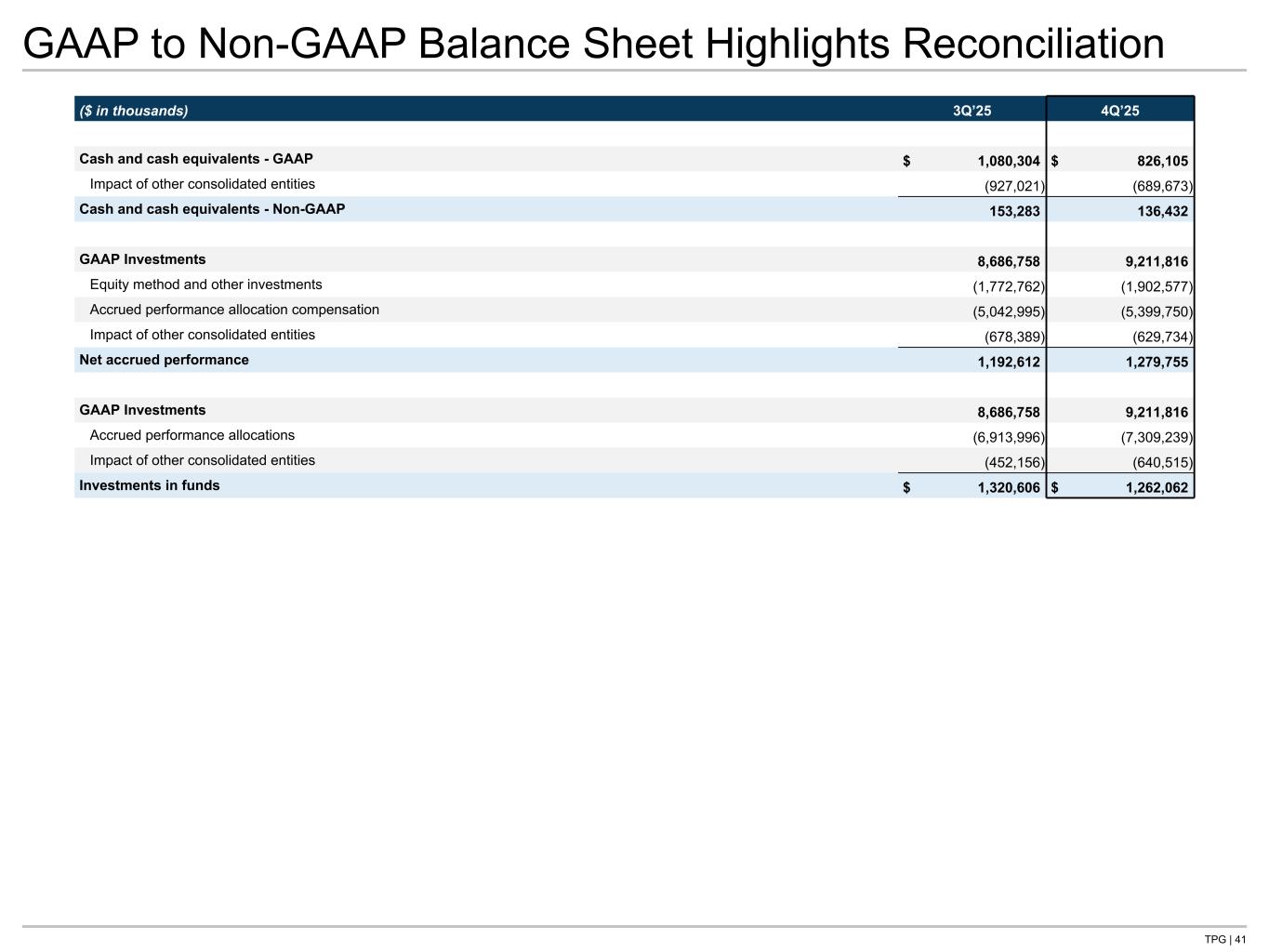 TPG | 41 GAAP to Non-GAAP Balance Sheet Highlights Reconciliation ($ in thousands) 3Q’25 4Q’25 Cash and cash equivalents - GAAP $ 1,080,304 $ 826,105 Impact of other consolidated entities (927,021) (689,673) Cash and cash equivalents - Non-GAAP 153,283 136,432 GAAP Investments 8,686,758 9,211,816 Equity method and other investments (1,772,762) (1,902,577) Accrued performance allocation compensation (5,042,995) (5,399,750) Impact of other consolidated entities (678,389) (629,734) Net accrued performance 1,192,612 1,279,755 GAAP Investments 8,686,758 9,211,816 Accrued performance allocations (6,913,996) (7,309,239) Impact of other consolidated entities (452,156) (640,515) Investments in funds $ 1,320,606 $ 1,262,062 Tie to: -G B/S page -NG B/S page