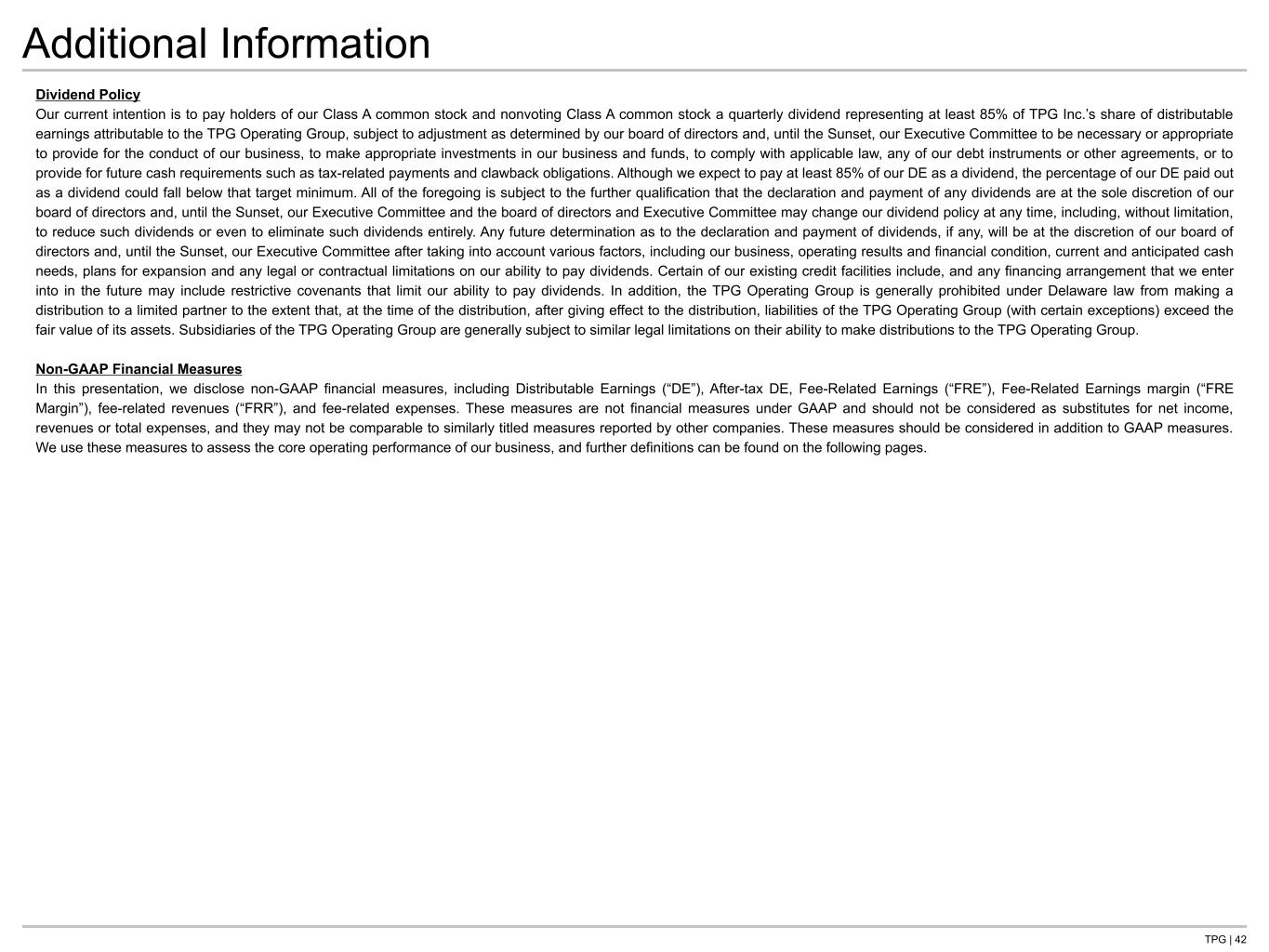 TPG | 42 Additional Information Dividend Policy Our current intention is to pay holders of our Class A common stock and nonvoting Class A common stock a quarterly dividend representing at least 85% of TPG Inc.’s share of distributable earnings attributable to the TPG Operating Group, subject to adjustment as determined by our board of directors and, until the Sunset, our Executive Committee to be necessary or appropriate to provide for the conduct of our business, to make appropriate investments in our business and funds, to comply with applicable law, any of our debt instruments or other agreements, or to provide for future cash requirements such as tax-related payments and clawback obligations. Although we expect to pay at least 85% of our DE as a dividend, the percentage of our DE paid out as a dividend could fall below that target minimum. All of the foregoing is subject to the further qualification that the declaration and payment of any dividends are at the sole discretion of our board of directors and, until the Sunset, our Executive Committee and the board of directors and Executive Committee may change our dividend policy at any time, including, without limitation, to reduce such dividends or even to eliminate such dividends entirely. Any future determination as to the declaration and payment of dividends, if any, will be at the discretion of our board of directors and, until the Sunset, our Executive Committee after taking into account various factors, including our business, operating results and financial condition, current and anticipated cash needs, plans for expansion and any legal or contractual limitations on our ability to pay dividends. Certain of our existing credit facilities include, and any financing arrangement that we enter into in the future may include restrictive covenants that limit our ability to pay dividends. In addition, the TPG Operating Group is generally prohibited under Delaware law from making a distribution to a limited partner to the extent that, at the time of the distribution, after giving effect to the distribution, liabilities of the TPG Operating Group (with certain exceptions) exceed the fair value of its assets. Subsidiaries of the TPG Operating Group are generally subject to similar legal limitations on their ability to make distributions to the TPG Operating Group. Non-GAAP Financial Measures In this presentation, we disclose non-GAAP financial measures, including Distributable Earnings (“DE”), After-tax DE, Fee-Related Earnings (“FRE”), Fee-Related Earnings margin (“FRE Margin”), fee-related revenues (“FRR”), and fee-related expenses. These measures are not financial measures under GAAP and should not be considered as substitutes for net income, revenues or total expenses, and they may not be comparable to similarly titled measures reported by other companies. These measures should be considered in addition to GAAP measures. We use these measures to assess the core operating performance of our business, and further definitions can be found on the following pages.