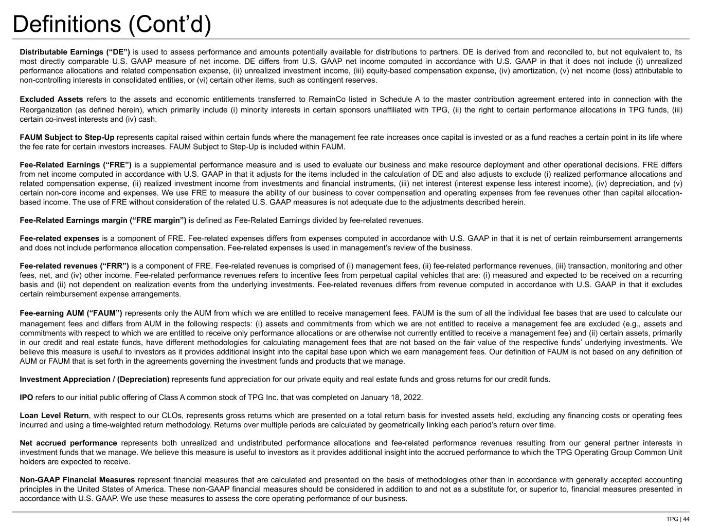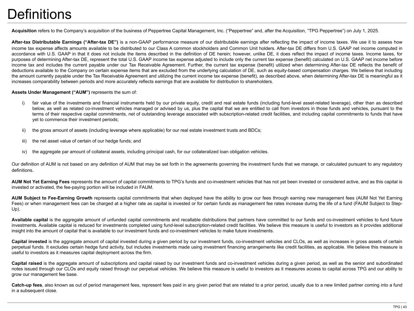 TPG | 43 Definitions Acquisition refers to the Company’s acquisition of the business of Peppertree Capital Management, Inc. (“Peppertree” and, after the Acquisition, “TPG Peppertree”) on July 1, 2025. After-tax Distributable Earnings (“After-tax DE”) is a non-GAAP performance measure of our distributable earnings after reflecting the impact of income taxes. We use it to assess how income tax expense affects amounts available to be distributed to our Class A common stockholders and Common Unit holders. After-tax DE differs from U.S. GAAP net income computed in accordance with U.S. GAAP in that it does not include the items described in the definition of DE herein; however, unlike DE, it does reflect the impact of income taxes. Income taxes, for purposes of determining After-tax DE, represent the total U.S. GAAP income tax expense adjusted to include only the current tax expense (benefit) calculated on U.S. GAAP net income before income tax and includes the current payable under our Tax Receivable Agreement. Further, the current tax expense (benefit) utilized when determining After-tax DE reflects the benefit of deductions available to the Company on certain expense items that are excluded from the underlying calculation of DE, such as equity-based compensation charges. We believe that including the amount currently payable under the Tax Receivable Agreement and utilizing the current income tax expense (benefit), as described above, when determining After-tax DE is meaningful as it increases comparability between periods and more accurately reflects earnings that are available for distribution to shareholders. Assets Under Management (“AUM”) represents the sum of: i) fair value of the investments and financial instruments held by our private equity, credit and real estate funds (including fund-level asset-related leverage), other than as described below, as well as related co-investment vehicles managed or advised by us, plus the capital that we are entitled to call from investors in those funds and vehicles, pursuant to the terms of their respective capital commitments, net of outstanding leverage associated with subscription-related credit facilities, and including capital commitments to funds that have yet to commence their investment periods; ii) the gross amount of assets (including leverage where applicable) for our real estate investment trusts and BDCs; iii) the net asset value of certain of our hedge funds; and iv) the aggregate par amount of collateral assets, including principal cash, for our collateralized loan obligation vehicles. Our definition of AUM is not based on any definition of AUM that may be set forth in the agreements governing the investment funds that we manage, or calculated pursuant to any regulatory definitions. AUM Not Yet Earning Fees represents the amount of capital commitments to TPG’s funds and co-investment vehicles that has not yet been invested or considered active, and as this capital is invested or activated, the fee-paying portion will be included in FAUM. AUM Subject to Fee-Earning Growth represents capital commitments that when deployed have the ability to grow our fees through earning new management fees (AUM Not Yet Earning Fees) or when management fees can be charged at a higher rate as capital is invested or for certain funds as management fee rates increase during the life of a fund (FAUM Subject to Step- Up). Available capital is the aggregate amount of unfunded capital commitments and recallable distributions that partners have committed to our funds and co-investment vehicles to fund future investments. Available capital is reduced for investments completed using fund-level subscription-related credit facilities. We believe this measure is useful to investors as it provides additional insight into the amount of capital that is available to our investment funds and co-investment vehicles to make future investments. Capital invested is the aggregate amount of capital invested during a given period by our investment funds, co-investment vehicles and CLOs, as well as increases in gross assets of certain perpetual funds. It excludes certain hedge fund activity, but includes investments made using investment financing arrangements like credit facilities, as applicable. We believe this measure is useful to investors as it measures capital deployment across the firm. Capital raised is the aggregate amount of subscriptions and capital raised by our investment funds and co-investment vehicles during a given period, as well as the senior and subordinated notes issued through our CLOs and equity raised through our perpetual vehicles. We believe this measure is useful to investors as it measures access to capital across TPG and our ability to grow our management fee base. Catch-up fees, also known as out of period management fees, represent fees paid in any given period that are related to a prior period, usually due to a new limited partner coming into a fund in a subsequent close.