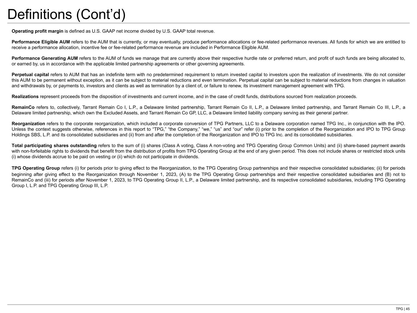 TPG | 45 Definitions (Cont’d) Operating profit margin is defined as U.S. GAAP net income divided by U.S. GAAP total revenue. Performance Eligible AUM refers to the AUM that is currently, or may eventually, produce performance allocations or fee-related performance revenues. All funds for which we are entitled to receive a performance allocation, incentive fee or fee-related performance revenue are included in Performance Eligible AUM. Performance Generating AUM refers to the AUM of funds we manage that are currently above their respective hurdle rate or preferred return, and profit of such funds are being allocated to, or earned by, us in accordance with the applicable limited partnership agreements or other governing agreements. Perpetual capital refers to AUM that has an indefinite term with no predetermined requirement to return invested capital to investors upon the realization of investments. We do not consider this AUM to be permanent without exception, as it can be subject to material reductions and even termination. Perpetual capital can be subject to material reductions from changes in valuation and withdrawals by, or payments to, investors and clients as well as termination by a client of, or failure to renew, its investment management agreement with TPG. Realizations represent proceeds from the disposition of investments and current income, and in the case of credit funds, distributions sourced from realization proceeds. RemainCo refers to, collectively, Tarrant Remain Co I, L.P., a Delaware limited partnership, Tarrant Remain Co II, L.P., a Delaware limited partnership, and Tarrant Remain Co III, L.P., a Delaware limited partnership, which own the Excluded Assets, and Tarrant Remain Co GP, LLC, a Delaware limited liability company serving as their general partner. Reorganization refers to the corporate reorganization, which included a corporate conversion of TPG Partners, LLC to a Delaware corporation named TPG Inc., in conjunction with the IPO. Unless the context suggests otherwise, references in this report to “TPG,” “the Company,” “we,” “us” and “our” refer (i) prior to the completion of the Reorganization and IPO to TPG Group Holdings SBS, L.P. and its consolidated subsidiaries and (ii) from and after the completion of the Reorganization and IPO to TPG Inc. and its consolidated subsidiaries. Total participating shares outstanding refers to the sum of (i) shares (Class A voting, Class A non-voting and TPG Operating Group Common Units) and (ii) share-based payment awards with non-forfeitable rights to dividends that benefit from the distribution of profits from TPG Operating Group at the end of any given period. This does not include shares or restricted stock units (i) whose dividends accrue to be paid on vesting or (ii) which do not participate in dividends. TPG Operating Group refers (i) for periods prior to giving effect to the Reorganization, to the TPG Operating Group partnerships and their respective consolidated subsidiaries; (ii) for periods beginning after giving effect to the Reorganization through November 1, 2023, (A) to the TPG Operating Group partnerships and their respective consolidated subsidiaries and (B) not to RemainCo and (iii) for periods after November 1, 2023, to TPG Operating Group II, L.P., a Delaware limited partnership, and its respective consolidated subsidiaries, including TPG Operating Group I, L.P. and TPG Operating Group III, L.P.