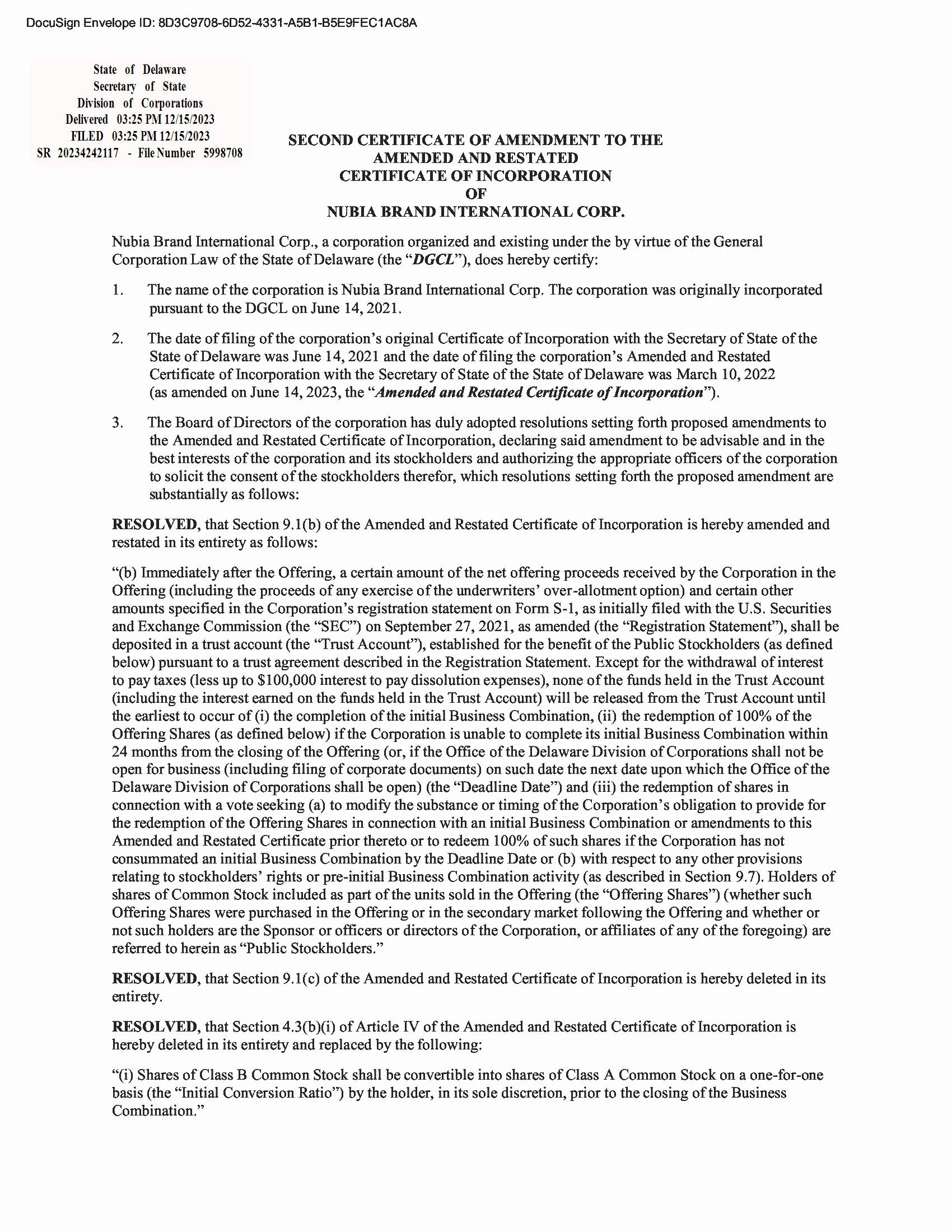 EX-3.1 2 ea190166ex3-1_nubiabrand.htm CERTIFICATE OF AMENDMENT, DATED DECEMBER 15, 2023, TO AMENDED AND RESTATED CERTIFICATE OF INCORPORATION OF NUBIA