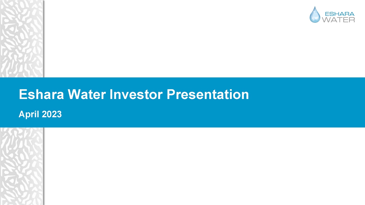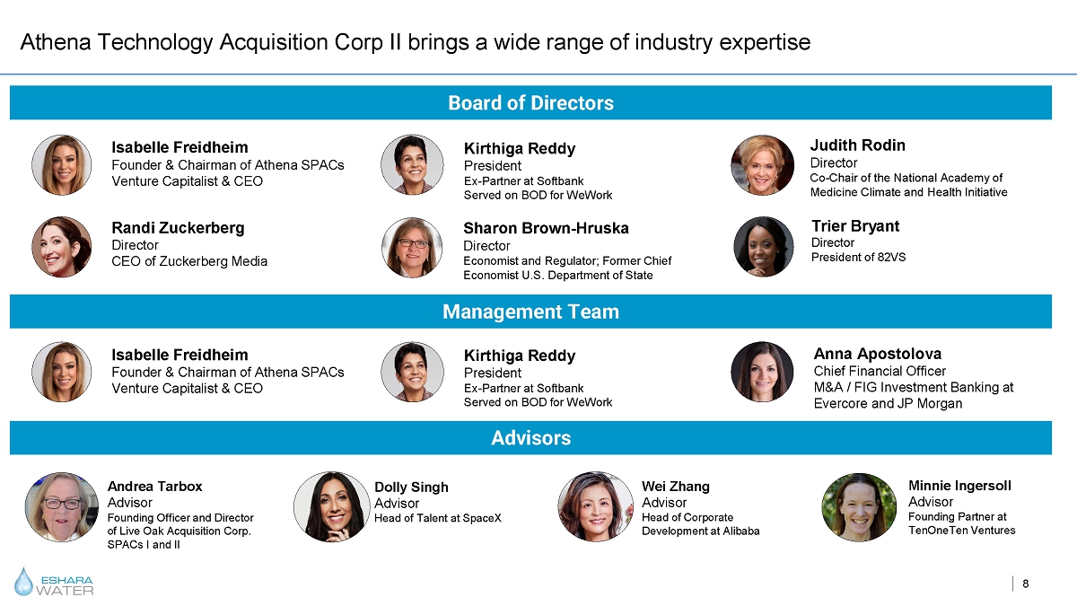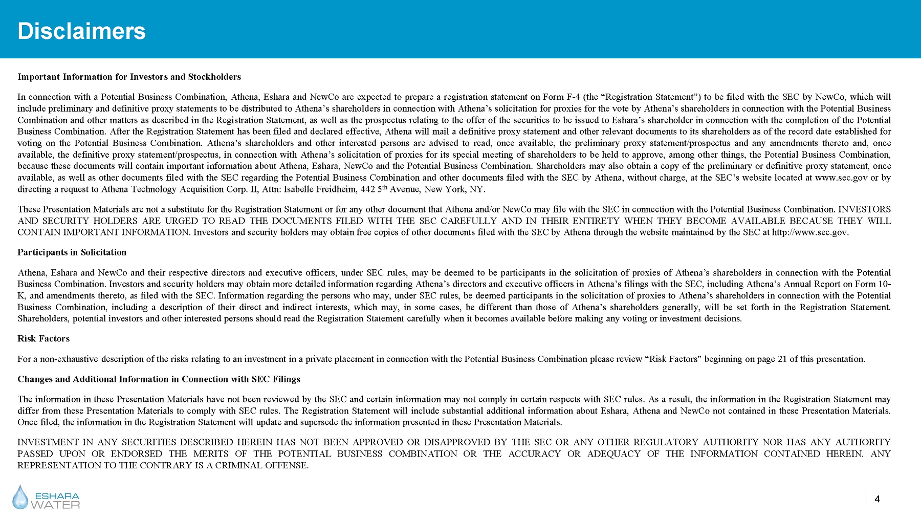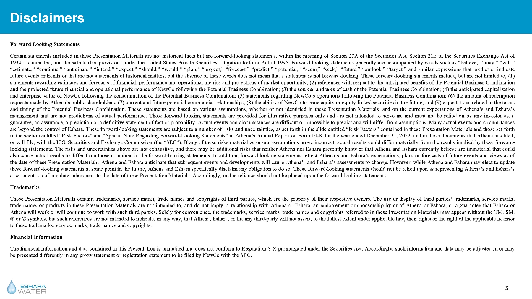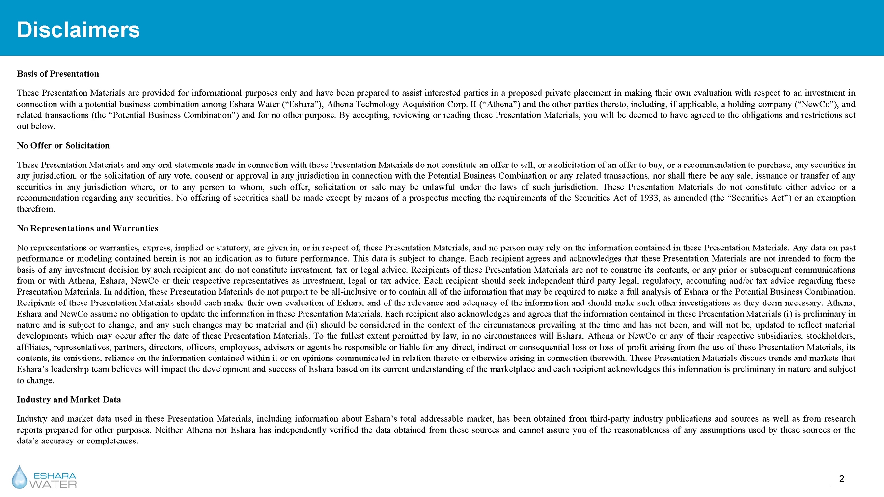 2 Disclaimers Basis of Presentation These Presentation Materials are provided for informational purposes only and have been prepared to assist interested parties in a proposed private placement in making their own evaluation with respect to an investment in connection with a potential business combination among Eshara Water (“ Eshara ”), Athena Technology Acquisition Corp . II (“Athena”) and the other parties thereto, including, if applicable, a holding company (“NewCo”), and related transactions (the “Potential Business Combination”) and for no other purpose . By accepting, reviewing or reading these Presentation Materials, you will be deemed to have agreed to the obligations and restrictions set out below . No Offer or Solicitation These Presentation Materials and any oral statements made in connection with these Presentation Materials do not constitute an offer to sell, or a solicitation of an offer to buy, or a recommendation to purchase, any securities in any jurisdiction, or the solicitation of any vote, consent or approval in any jurisdiction in connection with the Potential Business Combination or any related transactions, nor shall there be any sale, issuance or transfer of any securities in any jurisdiction where, or to any person to whom, such offer, solicitation or sale may be unlawful under the laws of such jurisdiction . These Presentation Materials do not constitute either advice or a recommendation regarding any securities . No offering of securities shall be made except by means of a prospectus meeting the requirements of the Securities Act of 1933 , as amended (the “Securities Act”) or an exemption therefrom . No Representations and Warranties No representations or warranties, express, implied or statutory, are given in, or in respect of, these Presentation Materials, and no person may rely on the information contained in these Presentation Materials . Any data on past performance or modeling contained herein is not an indication as to future performance . This data is subject to change . Each recipient agrees and acknowledges that these Presentation Materials are not intended to form the basis of any investment decision by such recipient and do not constitute investment, tax or legal advice . Recipients of these Presentation Materials are not to construe its contents, or any prior or subsequent communications from or with Athena, Eshara , NewCo or their respective representatives as investment, legal or tax advice . Each recipient should seek independent third party legal, regulatory, accounting and/or tax advice regarding these Presentation Materials . In addition, these Presentation Materials do not purport to be all - inclusive or to contain all of the information that may be required to make a full analysis of Eshara or the Potential Business Combination . Recipients of these Presentation Materials should each make their own evaluation of Eshara , and of the relevance and adequacy of the information and should make such other investigations as they deem necessary . Athena, Eshara and NewCo assume no obligation to update the information in these Presentation Materials . Each recipient also acknowledges and agrees that the information contained in these Presentation Materials ( i ) is preliminary in nature and is subject to change, and any such changes may be material and (ii) should be considered in the context of the circumstances prevailing at the time and has not been, and will not be, updated to reflect material developments which may occur after the date of these Presentation Materials . To the fullest extent permitted by law, in no circumstances will Eshara , Athena or NewCo or any of their respective subsidiaries, stockholders, affiliates, representatives, partners, directors, officers, employees, advisers or agents be responsible or liable for any direct, indirect or consequential loss or loss of profit arising from the use of these Presentation Materials, its contents, its omissions, reliance on the information contained within it or on opinions communicated in relation thereto or otherwise arising in connection therewith . These Presentation Materials discuss trends and markets that Eshara’s leadership team believes will impact the development and success of Eshara based on its current understanding of the marketplace and each recipient acknowledges this information is preliminary in nature and subject to change . Industry and Market Data Industry and market data used in these Presentation Materials, including information about Eshara’s total addressable market, has been obtained from third - party industry publications and sources as well as from research reports prepared for other purposes . Neither Athena nor Eshara has independently verified the data obtained from these sources and cannot assure you of the reasonableness of any assumptions used by these sources or the data’s accuracy or completeness .