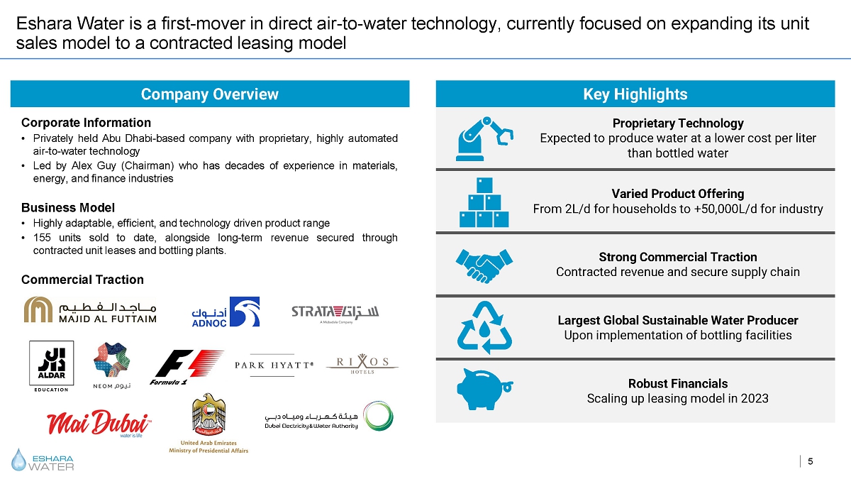 4 Disclaimers Important Information for Investors and Stockholders In connection with a Potential Business Combination, Athena, Eshara and NewCo are expected to prepare a registration statement on Form F - 4 (the “Registration Statement”) to be filed with the SEC by NewCo, which will include preliminary and definitive proxy statements to be distributed to Athena’s shareholders in connection with Athena’s solicitation for proxies for the vote by Athena’s shareholders in connection with the Potential Business Combination and other matters as described in the Registration Statement, as well as the prospectus relating to the offer of the securities to be issued to Eshara’s shareholder in connection with the completion of the Potential Business Combination . After the Registration Statement has been filed and declared effective, Athena will mail a definitive proxy statement and other relevant documents to its shareholders as of the record date established for voting on the Potential Business Combination . Athena’s shareholders and other interested persons are advised to read, once available, the preliminary proxy statement/prospectus and any amendments thereto and, once available, the definitive proxy statement/prospectus, in connection with Athena’s solicitation of proxies for its special meeting of shareholders to be held to approve, among other things, the Potential Business Combination, because these documents will contain important information about Athena, Eshara , NewCo and the Potential Business Combination . Shareholders may also obtain a copy of the preliminary or definitive proxy statement, once available, as well as other documents filed with the SEC regarding the Potential Business Combination and other documents filed with the SEC by Athena, without charge, at the SEC’s website located at www . sec . gov or by directing a request to Athena Technology Acquisition Corp . II, Attn : Isabelle Freidheim, 442 5 th Avenue, New York, NY . These Presentation Materials are not a substitute for the Registration Statement or for any other document that Athena and/or NewCo may file with the SEC in connection with the Potential Business Combination . INVESTORS AND SECURITY HOLDERS ARE URGED TO READ THE DOCUMENTS FILED WITH THE SEC CAREFULLY AND IN THEIR ENTIRETY WHEN THEY BECOME AVAILABLE BECAUSE THEY WILL CONTAIN IMPORTANT INFORMATION . Investors and security holders may obtain free copies of other documents filed with the SEC by Athena through the website maintained by the SEC at http : //www . sec . gov . Participants in Solicitation Athena, Eshara and NewCo and their respective directors and executive officers, under SEC rules, may be deemed to be participants in the solicitation of proxies of Athena’s shareholders in connection with the Potential Business Combination . Investors and security holders may obtain more detailed information regarding Athena’s directors and executive officers in Athena’s filings with the SEC, including Athena’s Annual Report on Form 10 - K, and amendments thereto, as filed with the SEC . Information regarding the persons who may, under SEC rules, be deemed participants in the solicitation of proxies to Athena’s shareholders in connection with the Potential Business Combination, including a description of their direct and indirect interests, which may, in some cases, be different than those of Athena’s shareholders generally, will be set forth in the Registration Statement . Shareholders, potential investors and other interested persons should read the Registration Statement carefully when it becomes available before making any voting or investment decisions . Risk Factors For a non - exhaustive description of the risks relating to an investment in a private placement in connection with the Potential Business Combination please review “Risk Factors” beginning on page 21 of this presentation . Changes and Additional Information in Connection with SEC Filings The information in these Presentation Materials have not been reviewed by the SEC and certain information may not comply in certain respects with SEC rules . As a result, the information in the Registration Statement may differ from these Presentation Materials to comply with SEC rules . The Registration Statement will include substantial additional information about Eshara , Athena and NewCo not contained in these Presentation Materials . Once filed, the information in the Registration Statement will update and supersede the information presented in these Presentation Materials . INVESTMENT IN ANY SECURITIES DESCRIBED HEREIN HAS NOT BEEN APPROVED OR DISAPPROVED BY THE SEC OR ANY OTHER REGULATORY AUTHORITY NOR HAS ANY AUTHORITY PASSED UPON OR ENDORSED THE MERITS OF THE POTENTIAL BUSINESS COMBINATION OR THE ACCURACY OR ADEQUACY OF THE INFORMATION CONTAINED HEREIN . ANY REPRESENTATION TO THE CONTRARY IS A CRIMINAL OFFENSE .