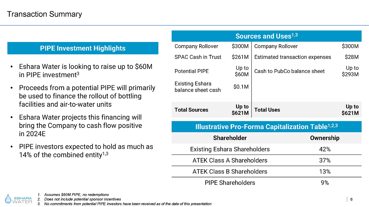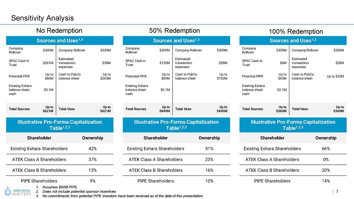 Transaction Summary 6 PIPE Investment Highlights • Eshara Water is looking to raise up to $60M in PIPE investment 3 • Proceeds from a potential PIPE will primarily be used to finance the rollout of bottling facilities and air - to - water units • Eshara Water projects this financing will bring the Company to cash flow positive in 2024E • PIPE investors expected to hold as much as 14% of the combined entity 1,3 1. Assumes $60M PIPE, no redemptions 2. Does not include potential sponsor incentives 3. No commitments from potential PIPE investors have been received as of the date of this presentation Sources and Uses 1,3 $300M Company Rollover $300M Company Rollover $28M Estimated transaction expenses $261M SPAC Cash in Trust Up to $293M Cash to PubCo balance sheet Up to $60M Potential PIPE $0.1M Existing Eshara balance sheet cash Up to $621M Total Uses Up to $621M Total Sources Illustrative Pro - Forma Capitalization Table 1,2,3 Ownership Shareholder 42% Existing Eshara Shareholders 37% ATEK Class A Shareholders 13% ATEK Class B Shareholders 9% PIPE Shareholders