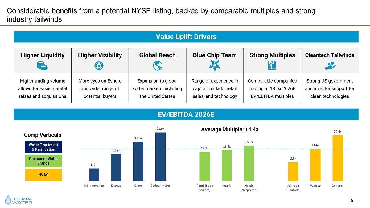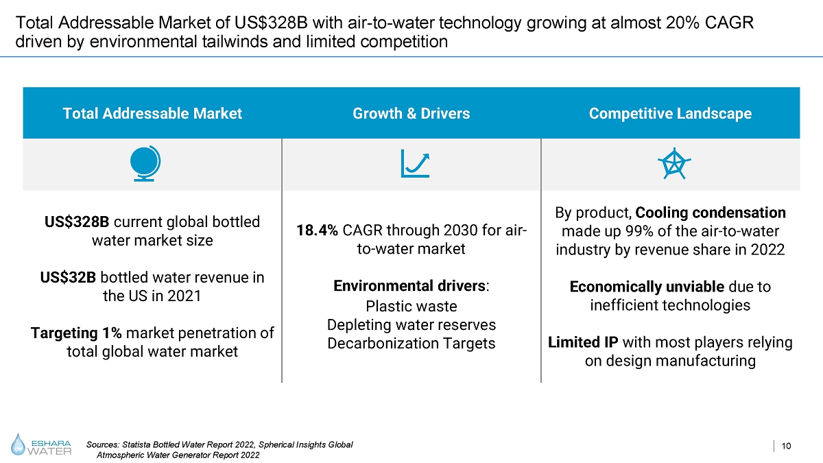 5.7x 12.2x 17.6x 21.9x 13.1x 13.9x 15.9x 8.5x 14.6x 20.6x H2 Innovation Evoqua Xylem Badger Meter Pepsi (Soda Stream) Keurig Nestle (Nespresso) Johnson Controls Watsco Generac Considerable benefits from a potential NYSE listing, backed by comparable multiples and strong industry tailwinds 9 EV/EBITDA 2026E Average Multiple : 14 . 4 x Water Treatment & Purification Consumer Water Brands HVAC Comp Verticals Cleantech Tailwinds Strong Multiples Blue Chip Team Global Reach Higher Visibility Higher Liquidity Strong US government and investor support for clean technologies Comparable companies trading at 13.0x 2026E EV/EBITDA multiples Range of experience in capital markets, retail sales, and technology Expansion to global water markets including the United States More eyes on Eshara and wider range of potential buyers Higher trading volume allows for easier capital raises and acquisitions Value Uplift Drivers